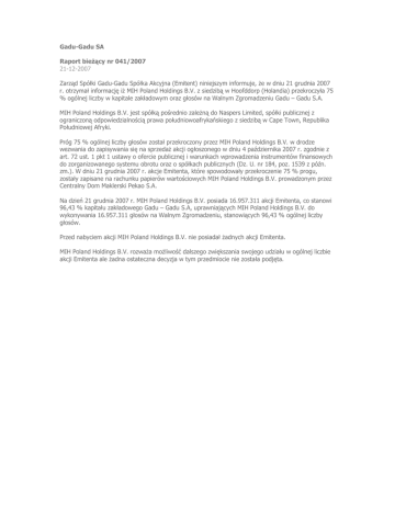 Gadu-Gadu SA Raport bieżący nr 041/2007 21-12-2007 Zarząd Spółki Gadu-Gadu Spółka Akcyjna (Emitent) niniejszym informuje, że w dniu 21 grudnia 2007 r. otrzymał informację iż MIH Poland Holdings B.V. z siedzibą w Hoofddorp (Holandia) przekroczyła 75 % ogólnej liczby w kapitale zakładowym oraz głosów na Walnym Zgromadzeniu Gadu – Gadu S.A. MIH Poland Holdings B.V. jest spółką pośrednio zależną do Naspers Limited, spółki publicznej z ograniczoną odpowiedzialnością prawa południowoafrykańskiego z siedzibą w Cape Town, Republika Południowej Afryki. Próg 75 % ogólnej liczby głosów został przekroczony przez MIH Poland Holdings B.V. w drodze wezwania do zapisywania się na sprzedaż akcji ogłoszonego w dniu 4 października 2007 r. zgodnie z art. 72 ust. 1 pkt 1 ustawy o ofercie publicznej i warunkach wprowadzenia instrumentów finansowych do zorganizowanego systemu obrotu oraz o spółkach publicznych (Dz. U. nr 184, poz. 1539 z późn. zm.). W dniu 21 grudnia 2007 r. akcje Emitenta, które spowodowały przekroczenie 75 % progu, zostały zapisane na rachunku papierów wartościowych MIH Poland Holdings B.V. prowadzonym przez Centralny Dom Maklerski Pekao S.A. Na dzień 21 grudnia 2007 r. MIH Poland Holdings B.V. posiada 16.957.311 akcji Emitenta, co stanowi 96,43 % kapitału zakładowego Gadu – Gadu S.A, uprawniających MIH Poland Holdings B.V. do wykonywania 16.957.311 głosów na Walnym Zgromadzeniu, stanowiących 96,43 % ogólnej liczby głosów. Przed nabyciem akcji MIH Poland Holdings B.V. nie posiadał żadnych akcji Emitenta. MIH Poland Holdings B.V. rozważa możliwość dalszego zwiększania swojego udziału w ogólnej liczbie akcji Emitenta ale żadna ostateczna decyzja w tym przedmiocie nie została podjęta.