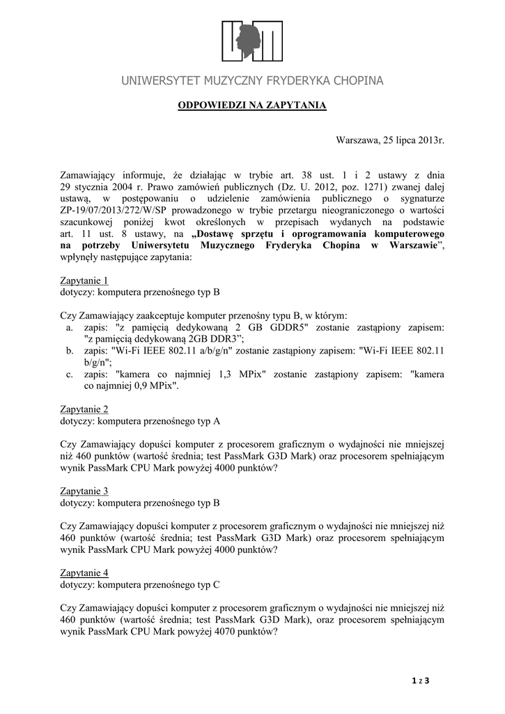 UNIWERSYTET MUZYCZNY FRYDERYKA CHOPINA ODPOWIEDZI NA ZAPYTANIA Warszawa, 25 lipca 2013r. Zamawiający informuje, że działając w trybie art. 38 ust. 1 i 2 ustawy z dnia 29 stycznia 2004 r. Prawo zamówień publicznych (Dz. U. 2012, poz. 1271) zwanej dalej ustawą, w postępowaniu o udzielenie zamówienia publicznego o sygnaturze ZP-19/07/2013/272/W/SP prowadzonego w trybie przetargu nieograniczonego o wartości szacunkowej poniżej kwot określonych w przepisach wydanych na podstawie art. 11 ust. 8 ustawy, na „Dostawę sprzętu i oprogramowania komputerowego na potrzeby Uniwersytetu Muzycznego Fryderyka Chopina w Warszawie”, wpłynęły następujące zapytania: Zapytanie 1 dotyczy: komputera przenośnego typ B Czy Zamawiający zaakceptuje komputer przenośny typu B, w którym: a. zapis: "z pamięcią dedykowaną 2 GB GDDR5" zostanie zastąpiony zapisem: "z pamięcią dedykowaną 2GB DDR3”; b. zapis: "Wi-Fi IEEE 802.11 a/b/g/n" zostanie zastąpiony zapisem: "Wi-Fi IEEE 802.11 b/g/n"; c. zapis: "kamera co najmniej 1,3 MPix" zostanie zastąpiony zapisem: "kamera co najmniej 0,9 MPix". Zapytanie 2 dotyczy: komputera przenośnego typ A Czy Zamawiający dopuści komputer z procesorem graficznym o wydajności nie mniejszej niż 460 punktów (wartość średnia; test PassMark G3D Mark) oraz procesorem spełniającym wynik PassMark CPU Mark powyżej 4000 punktów? Zapytanie 3 dotyczy: komputera przenośnego typ B Czy Zamawiający dopuści komputer z procesorem graficznym o wydajności nie mniejszej niż 460 punktów (wartość średnia; test PassMark G3D Mark) oraz procesorem spełniającym wynik PassMark CPU Mark powyżej 4000 punktów? Zapytanie 4 dotyczy: komputera przenośnego typ C Czy Zamawiający dopuści komputer z procesorem graficznym o wydajności nie mniejszej niż 460 punktów (wartość średnia; test PassMark G3D Mark), oraz procesorem spełniającym wynik PassMark CPU Mark powyżej 4070 punktów? 1z3 Zapytanie 5 dotyczy: komputera przenośnego typ D Czy Zamawiający dopuści komputer z procesorem graficznym o wydajności nie mniejszej niż 460 punktów (wartość średnia; test PassMark G3D Mark), oraz procesorem spełniającym wynik PassMark CPU Mark powyżej 4070 punktów? Zapytanie 6 dotyczy: komputera przenośnego typ E Czy Zamawiający dopuści komputer z procesorem graficznym o wydajności nie mniejszej niż 460 punktów (wartość średnia; test PassMark G3D Mark), oraz procesorem spełniającym wynik PassMark CPU Mark powyżej 4070 punktów? Zapytanie 7 dotyczy: komputera przenośnego typ F Czy Zamawiający dopuści komputer z procesorem graficznym o wydajności nie mniejszej niż 460 punktów (wartość średnia; test PassMark G3D Mark), oraz procesorem spełniającym wynik PassMark CPU Mark powyżej 4000 punktów? Uzasadnienie dla Zapytań 2-7: Z wiedzy posiadanej przez Wykonawcę w komputerach spełniających pozostałe elementy specyfikacji nie występują procesory graficzne niezintegrowane. Wyniki punktowe wymienione przez Zamawiającego spełniają dopiero najnowsze procesory 4 generacji, które nie znajdują się jeszcze w sprzedaży, w związku z czym może być niemożliwe złożenie oferty na sprzęt spełniający specyfikację. Wyniki na stronie www.cpubenchmark.com ulegają zmianą wraz z dodawaniem przez użytkowników kolejnych testów, w związku z czym mogła zajść sytuacja, w której wyniki wymagane w specyfikacji mogą być nieaktualne i niemożliwe do osiągnięcia wraz ze spełnieniem pozostałych zapisów w specyfikacji, lub też zaoferowany sprzęt będzie znacznie przewyższał budżet przewidziany przez Zamawiającego. Odpowiedź 1 Zamawiający informuje, j.n.: a. Zamawiający podtrzymuje zapis: "z pamięcią dedykowaną 2 GB GDDR5"; b. Zamawiający dopuści komputer z zapisem: "Wi-Fi IEEE 802.11 b/g/n"; c. Zamawiający dopuści komputer z zapisem: "kamera co najmniej 0,9 MPix". Odpowiedź 2 Zamawiający dopuści komputer z procesorem graficznym o wydajności nie mniejszej niż 460 punktów (wartość średnia; test PassMark G3D Mark). Odpowiedź 3 Zamawiający dopuści komputer z procesorem graficznym o wydajności nie mniejszej niż 460 punktów (wartość średnia; test PassMark G3D Mark) oraz procesorem o wydajności nie mniejszej niż 7740 punktów PassMark CPU Mark. 2z3 Odpowiedź 4 Zamawiający dopuści komputer z procesorem graficznym o wydajności nie mniejszej niż 460 punktów (wartość średnia; test PassMark G3D Mark) oraz procesorem o wydajności nie mniejszej niż 4070 punktów PassMark CPU Mark. Odpowiedź 5 Zamawiający dopuści komputer z procesorem graficznym o wydajności nie mniejszej niż 460 punktów (wartość średnia; test PassMark G3D Mark) oraz procesorem o wydajności nie mniejszej niż 4070 punktów PassMark CPU Mark. Odpowiedź 6 Zamawiający dopuści komputer z procesorem graficznym o wydajności nie mniejszej niż 460 punktów (wartość średnia; test PassMark G3D Mark) oraz procesorem o wydajności nie mniejszej niż 4070 punktów PassMark CPU Mark. Odpowiedź 7 Zamawiający dopuści komputer z procesorem graficznym o wydajności nie mniejszej niż 460 punktów (wartość średnia; test PassMark G3D Mark) oraz procesorem o wydajności nie mniejszej niż 4000 punktów PassMark CPU Mark. Kanclerz Uniwersytetu Muzycznego Fryderyka Chopina Magdalena Giedrojć-Juraha 3z3
