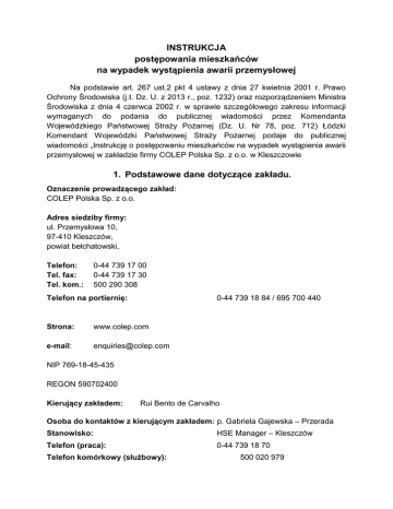 INSTRUKCJA postępowania mieszkańców na wypadek wystąpienia awarii przemysłowej Na podstawie art. 267 ust.2 pkt 4 ustawy z dnia 27 kwietnia 2001 r. Prawo Ochrony Środowiska (j.t. Dz. U. z 2013 r., poz. 1232) oraz rozporządzeniem Ministra Środowiska z dnia 4 czerwca 2002 r. w sprawie szczegółowego zakresu informacji wymaganych do podania do publicznej wiadomości przez Komendanta Wojewódzkiego Państwowej Straży Pożarnej (Dz. U. Nr 78, poz. 712) Łódzki Komendant Wojewódzki Państwowej Straży Pożarnej podaje do publicznej wiadomości „Instrukcję o postępowaniu mieszkańców na wypadek wystąpienia awarii przemysłowej w zakładzie firmy COLEP Polska Sp. z o.o. w Kleszczowie 1. Podstawowe dane dotyczące zakładu. Oznaczenie prowadzącego zakład: COLEP Polska Sp. z o.o. Adres siedziby firmy: ul. Przemysłowa 10, 97-410 Kleszczów, powiat bełchatowski, Telefon: Tel. fax: Tel. kom.: 0-44 739 17 00 0-44 739 17 30 500 290 308 Telefon na portiernię: 0-44 739 18 84 / 695 700 440 Strona: www.colep.com e-mail: [email protected] NIP 769-18-45-435 REGON 590702400 Kierujący zakładem: Rui Bento de Carvalho Osoba do kontaktów z kierującym zakładem: p. Gabriela Gajewska – Przerada Stanowisko: HSE Manager – Kleszczów Telefon (praca): 0-44 739 18 70 Telefon komórkowy (służbowy): 500 020 979 2. Charakterystyka działalności Rozlewni. Podstawową działalnością zakładu firmy COLEP Polska Sp. z o.o. przy ul. Przemysłowej 10 w Kleszczowie (pow. bełchatowski) zgodnie z wpisem w KRS jest konfekcjonowanie kosmetyków i chemii gospodarczej dostarczanych przez ich producentów w postaci gotowej lub w postaci półproduktów Główne produkty końcowe operacji prowadzonych w zakładzie to: dezodoranty, odświeżacze powietrza, pianki do włosów i lakiery, wody toaletowe, żele do golenia inne produkty w ramach prowadzonych zamówień. Ponadto zakład prowadzi działalność funkcjonowanie instalacji przemysłowej, a mianowicie: dodatkową umożliwiającą przeładunek i magazynowanie w zbiornikach ciśnieniowych skroplonych gazów węglowodorowych w tym mieszanin LPG oraz izopentanu i izobutanu, przeładunek i magazynowanie alkoholu w zbiornikach magazynowych bezciśnieniowych, przeładunek i magazynowanie w zbiorniku kriogenicznym azotu oraz zgazowywanie go w parownicach atmosferycznych, konfekcjonowanie (mieszanie półproduktów) wyrobów gotowych w reaktorach, magazynowanie wysokiego składowania, produkcję opakowań z metali lekkich, oczyszczanie ścieków, inne wspomagające. Zakład został zaliczony do zakładu dużego ryzyka ze względu na to, że na jego terenie znajduje się gaz w postaci mieszanin LPG w ilości ponad 200 Mg. Ponadto w zakładzie są magazynowane w dużych ilościach i wykorzystywane do produkcji substancje palne i wybuchowe takie jak: novospray (mieszanina izopentanu i izobutanu), alkohol etylowy i alkohol izopropylowy. Zakład opracował dokumentację wymaganą Ustawą Prawo Ochrony Środowiska i podlega regularnym kontrolom dokonywanym przez upoważnione organy. 3. Zidentyfikowane zagrożenia. Rodzaj Wybuch Pożar Skażenie terenu Skutki Poparzenie, śmierć Poparzenie, śmierć Zatrucie, śmierć 4. Sposoby powiadamiania i alarmowania mieszkańców na wypadek wystąpienia zagrożenia. 1. Sygnał alarmowy emitowany przez syrenę alarmową: ciągły 3 minutowy. 2. Komunikat o awarii i przygotowaniu się do ewakuacji nadawany przez systemy nagłośnieniowe służb ratowniczych. 3. Komunikaty nadawane w lokalnych stacjach telewizyjnych oraz w lokalnych rozgłośniach radiowych. Wyróżnia się 3 ogólne schematy alarmów w zależności od awarii: ALARM I STOPNIA Ogłaszany jest w przypadku niekontrolowanego/awaryjnego/ wypływu gazu na zewnątrz instalacji technologicznej, w sposób, który nie może zostać natychmiast zahamowany przez pracownika obsługującego dany element i powodujący bezpośrednie miejscowe zagrożenie stworzenia mieszaniny wybuchowej z powietrzem. Po dokonaniu oceny zaistniałej sytuacji decyzję o sposobie dalszego postępowania przy usuwaniu zagrożenia określa w kolejności wg. hierarchii: 1. Kierujący zakładem lub osoba go zastępująca (HSE Manager) 2. Szef zespołu ratowniczego /brygadzista/ O prowadzonych działaniach osoba odpowiedzialna za usunięcie awarii informuje odpowiednio osobę stopień wyższą w hierarchii zakładu. ALARM II STOPNIA Ogłaszany jest w przypadku stwierdzenia wypływu gazu po awarii stwarzającej możliwość utworzenia mieszaniny wybuchowej znacznych rozmiarów lub zauważenia pożaru. Po dokonaniu oceny sytuacji decyzję o sposobie dalszego postępowania przy usuwaniu zagrożenia określa: 1. Kierujący zakładem lub osoba go zastępująca (HSE Manager) 2. Szef zespołu ratowniczego /brygadzista/ Stwierdzenie awarii kwalifikującej się do ogłoszenia alarmu wymaga każdorazowo zaalarmowania: 1. Kierującego zakładem lub osoby go zastępującej (HSE Manager). 2. Państwowej Straży Pożarnej. 3. Sąsiednich zakładów. Działania ratownicze prowadzone są wg instrukcji w zależności od rodzaju niebezpieczeństwa. Po przyjeździe kierowanie akcją ratowniczą obejmuje przedstawiciel Państwowej Straży Pożarnej. ALARM III STOPNIA Ogłaszany jest w przypadku stwierdzenia wypływu gazu o natężeniu niebezpiecznym sięgającym poza teren zakładu lub pożaru zagrażającego bezpośrednio innym elementom instalacji /ryzyko „efektu domino"/. ALARM III STOPNIA jest ogłaszany według procedury ALARMU II STOPNIA. Dalsze postępowanie jest zależne od decyzji kierujących akcją ratowniczą ze strony Państwowej Straży Pożarnej. 5. Postępowanie w przypadku wystąpienia zagrożenia Po usłyszeniu sygnału alarmowego lub innego wezwania do opuszczenia mieszkania, zachowując spokój, bezzwłocznie: Zachować spokój, przeciwdziałać panice i lękowi Postępować zgodnie z instrukcjami ogłaszanymi przez służby ratownicze, a na terenie innych zakładów pracy - zgodnie z instrukcjami