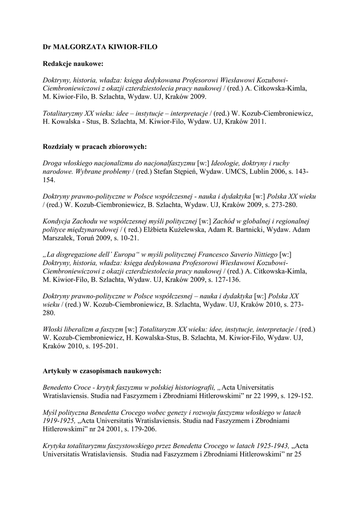 Dr MAŁGORZATA KIWIOR-FILO Redakcje naukowe: Doktryny, historia, władza: księga dedykowana Profesorowi Wiesławowi KozubowiCiembroniewiczowi z okazji czterdziestolecia pracy naukowej / (red.) A. Citkowska-Kimla, M. Kiwior-Filo, B. Szlachta, Wydaw. UJ, Kraków 2009. Totalitaryzmy XX wieku: idee – instytucje – interpretacje / (red.) W. Kozub-Ciembroniewicz, H. Kowalska - Stus, B. Szlachta, M. Kiwior-Filo, Wydaw. UJ, Kraków 2011. Rozdziały w pracach zbiorowych: Droga włoskiego nacjonalizmu do nacjonalfaszyzmu [w:] Ideologie, doktryny i ruchy narodowe. Wybrane problemy / (red.) Stefan Stępień, Wydaw. UMCS, Lublin 2006, s. 143154. Doktryny prawno-polityczne w Polsce współczesnej - nauka i dydaktyka [w:] Polska XX wieku / (red.) W. Kozub-Ciembroniewicz, B. Szlachta, Wydaw. UJ, Kraków 2009, s. 273-280. Kondycja Zachodu we współczesnej myśli politycznej [w:] Zachód w globalnej i regionalnej polityce międzynarodowej / ( red.) Elżbieta Kużelewska, Adam R. Bartnicki, Wydaw. Adam Marszałek, Toruń 2009, s. 10-21. „La disgregazione dell’ Europa“ w myśli politycznej Francesco Saverio Nittiego [w:] Doktryny, historia, władza: księga dedykowana Profesorowi Wiesławowi KozubowiCiembroniewiczowi z okazji czterdziestolecia pracy naukowej / (red.) A. Citkowska-Kimla, M. Kiwior-Filo, B. Szlachta, Wydaw. UJ, Kraków 2009, s. 127-136. Doktryny prawno-polityczne w Polsce współczesnej – nauka i dydaktyka [w:] Polska XX wieku / (red.) W. Kozub-Ciembroniewicz, B. Szlachta, Wydaw. UJ, Kraków 2010, s. 273280. Włoski liberalizm a faszyzm [w:] Totalitaryzm XX wieku: idee, instytucje, interpretacje / (red.) W. Kozub-Ciembroniewicz, H. Kowalska-Stus, B. Szlachta, M. Kiwior-Filo, Wydaw. UJ, Kraków 2010, s. 195-201. Artykuły w czasopismach naukowych: Benedetto Croce - krytyk faszyzmu w polskiej historiografii, „Acta Universitatis Wratislaviensis. Studia nad Faszyzmem i Zbrodniami Hitlerowskimi” nr 22 1999, s. 129-152. Myśl polityczna Benedetta Crocego wobec genezy i rozwoju faszyzmu włoskiego w latach 1919-1925, „Acta Universitatis Wratislaviensis. Studia nad Faszyzmem i Zbrodniami Hitlerowskimi” nr 24 2001, s. 179-206. Krytyka totalitaryzmu faszystowskiego przez Benedetta Crocego w latach 1925-1943, „Acta Universitatis Wratislaviensis. Studia nad Faszyzmem i Zbrodniami Hitlerowskimi” nr 25 2002, s. 59-88. Defaszyzacja Włoch w myśli politycznej Benedetta Crocego (1943-1945), „Acta Universitatis Wratislaviensis. Studia nad Faszyzmem i Zbrodniami Hitlerowskimi” T. 26 2003, s. 93-124. Faszyzm włoski a własność prywatna – ewolucja doktryny, „Acta Universitatis Wratislaviensis. Studia nad Faszyzmem i Zbrodniami Hitlerowskimi” T. 27 2004, s. 33-43. W poszukiwaniu dialogu społecznego. Związek zawodowy – aktywny partner europejskiego zarządzania, “Politeja” nr 1 2004, s. 436-439. Garibaldi e i garibaldini in Polonia, “In Europa. Rivista di Studi e di Iniziativa Europea”, Anno XVI, n. 1 2007, Genova, s.37-42. Piero Gobetti i Rivoluzione liberale – refleksje dotyczące włoskiego faszyzmu, „Acta Universitatis Wratislaviensis. Studia nad Faszyzmem i Zbrodniami Hitlerowskimi” T. 29 2007, s. 5-17. U źródeł totalitaryzmów XX wieku. W 90 rocznicę rewolucji bolszewickiej, „Czasopismo Prawno-Historyczne” T. 60 z. 2 2008, s. 463-465. Interdyscyplinarność prowadzonych badań. Jubileusz Profesora Wiesława KozubaCiembroniewicza, „Alma Mater” nr 122-123 2010, s. 46-48. „Per una nuova democrazia” – krytyka faszyzmu w myśli politycznej Giovanniego Amendoli, „Acta Universitatis Wratislaviensis. Studia nad Faszyzmem i Zbrodniami Hitlerowskimi” t. 32 2010, s. 183-194. „Rewolucja faszystowska” w interpretacji Władysława Jabłonowskiego, „Acta Universitatis Wratislaviensis. Studia nad Faszyzmem i Zbrodniami Hitlerowskimi” t. 33 2011, s. 79-97. Recenzje: Straty kultury polskiej pod okupacją niemiecką 1939-1944: wraz z oryginalnymi dokumentami grabieży = Cultural losses of Poland during the German Occupation 1939-1945: with Original Documents of the Looting / Karol Estraicher. - Kraków 2003. – Rec. M. Kiwior-Filo // “Politeja” nr 2 2006, s. 615-619. Dokumenty strat kultury polskiej pod okupacją niemiecką 1939-1944: z archiwum Karola Estraichera = Cultural losses of Poland during the German Occupation 1939-1945: documents from the Archives of Karol Estraicher / Zbigniew Kazimierz Witek. - Kraków 2003. – Rec. M. Kiwior-Filo // “Politeja” nr 2 2006, s. 615-619.