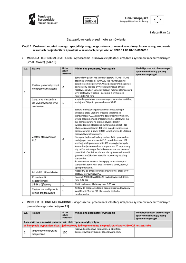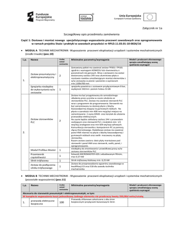 Załącznik nr 1a Szczegółowy opis przedmiotu zamówienia Część 1: Dostawa i montaż nowego specjalistycznego wyposażenia pracowni zawodowych oraz oprogramowania w ramach projektu Staże i praktyki w zawodach przyszłości nr RPLD.11.03.01-10-0026/16 MODUŁ A TECHNIK MECHATRONIK- Wyposażenie pracowni eksploatacji urządzeń i systemów mechatronicznych (środki trwałe) (poz.10) L.p. Nazwa Liczba sztuk/ zestawów Zestaw pneumatyczny i elektropneumatyczny 2 Sprężarka niezbędna do wykorzystania w/w zestawów 1 1. 1 1 Silnik trójfazowy klatkowy min. 0,25 kW 1 Zestaw do przeprowadzenia egzaminu zawodowego w kwalifikacji E3 oraz E18 dla zawodu technika mechatronika 2 Moduł Profibus Master 1 2. Zestaw do podłączenia silnika trójfazowego Model i producent oferowanego sprzętu umożliwiający ocenę spełnienia wymagań Zamawiany pakiet ma zawierać zestaw TP201 i TP101 zgodnie z wymogami KOWEZiU lub równoważny o parametrach nie gorszych. Wraz z zestawem ma zostać dostarczony zasilacz 24V oraz aluminiowa płyta o rozstawie rowków umożliwiającym montaż elementów z w/w zestawów w pionie i poziomie o wymiarach min.1100x700 mm sprężarka powietrza z zestawem przyłączeniowym 8 bar, wydajność 50l/min poziom hałasu 53 dB Zestaw ma być przygotowany do samodzielnego składania przez uczniów w czasie szkolenia ze sterowników PLC. Zestaw ma zawierać sterownik PLC wraz z programem do programowania. Sterownik ma być zamontowany na skośnej płycie z blachy kwasoodpornej stojącej na gumowych nóżkach. Na płycie o szerokości min 400 mm mają być miejsce na zamontowanie 2 szyny DIN35 oraz korytek do ułożenia przewodów elektrycznych. Na szynie będzie zakładany zasilacz 24V z przewodem zasilającym oraz sterownik PLC z modułem min 1/1 wej/wyj analogowe oraz min 8/8 wej/wyj cyfrowych. Komunikacja sterownika z komputerem PC za pomocą złącza Eternetowego. Dodatkowo zestaw ma zawierać panel HMI również na płycie z blachy kwasoodpornej i gumowych nóżkach oraz swith mocowany na płytę sterownika. Razem zestaw zawiera: dwie płyty montażowe pod sterownik i panel HMI oraz sterownik, swith, panel, i oprogramowanie. niezbędny do zmontowania i prawidłowej pracy w/w zestawu sterowników PLC falownik MICROMASTER 420 z wbudowanym filtrem, moc 0.37 KW Zestaw sterowników PLC Przemiennik częstotliwości Silnik trójfazowy Minimalne parametry/wymagania MODUŁ B TECHNIK MECHATRONIK - Wyposażenie pracowni eksploatacji urządzeń i systemów mechatronicznych (pozostałe wyposażenie) (poz.11) L.p. Nazwa Liczba sztuk/ zestawów Minimalne parametry/wymagania Model i producent oferowanego sprzętu umożliwiający ocenę spełnienia wymagań Akcesoria do stanowisk pneumatyki i elektropneumatyki, w tym: W komplecie wyposażenia koszt jednostkowy żadnego elementu nie przekroczy kwoty 350,00zł netto/sztukę 1. przewody elektryczne bezpieczne 100 Przewody silikonowe zakończone z obu stron bezpiecznymi przyłączami bananowymi 4mm Akcesoria do stanowisk do programowania sterownika PLC, w tym: W komplecie wyposażenia koszt jednostkowy żadnego elementu nie przekroczy kwoty 350,00zł netto/sztukę szyny DIN 35, korytka do uzbrojenia w przewody szyny DIN, korytka, 2. 2 uzbrojenie w przewody 3. Interfejs sterownika PLC 2 4. Interfejs urządzeń wykonawczych 2 5. 6. zasilacz 24V na szynę DIN Przekaźniki Relpol na szynę DIN 2 8 7. Kontrolki na szynę DIN 6 8. Przyciski na szynę DIN 8 9. 10. 11. Przycisk STOP awaryjny na szynę DIN Końcówki tulejkowe Praska do końcówek tulejkowych 12. Ściągacz do izolacji Przewód silikonowy 13. niebieski (100 m) przewód taśma 25 D14. Sub Stycznik: 24 V DC, 3 15. zestyki NO, 1 zestyk NC, Blok styków 16. pomocniczych min. 1NO+1NC Wyłącznik 17. elektromagnetyczny z wtykiem PCE 16 A Wyłącznik silnikowy 18. nadmiarowo-prądowy Przewody elektryczne 19. różnej długości Oprogramowanie 4 Przekaźnik 4-stykowy-4szt. przekaźnik czasowy-4szt. Czerwona 2szt. Żółta 2 szt. Zielona 2 szt. przycisk bistabilny na szynę DIN -4szt. przycisk monostabilny na szynę DIN -4szt. przycisk STOP awaryjny na szynę DIN 2 końcówki tulejkowe izolowane (100 szt.) 2 Praska do końcówek izolowanych z punktu powyżej do zaciskania na przewód dostarczony w ramach tego zamówienia 2 Dla przewodów 0,5mm2 2 2 przewód silikonowy niebieski 0,5mm2 Przewód do łączenia interfejsu urządzeń wykonawczych z interfejsem sterownika Mocowany na szynie DIN35 2 Do stycznika oferowanego w punkcie powyżej 2 Mocowany na szynie DIN35 2 2 Mocowany na szynie DIN35 (zakres 0,40-0,63A ) 200 Zakończone bezpiecznymi złączami bananowymi o średnicy 4mm 1 Program symulujący stanowisko robota - licencja wielostanowiskowa Licencja na 15 stanowisk programu do kształcenia w zakresie programowania i sterowania robotem wirtualnym. Program ma spełniać rolę dydaktyczną i umożliwiać kształcenia w zakresie budowy, programowania i sterowania robotami dydaktycznymi. Dodatkową wartością edukacyjną programu ma być możliwości pełnej konfiguracji modelu robota i modyfikacji parametrów oraz algorytmów sterowania. W raz z oprogramowaniem ma być dostarczona obszerna multimedialna pomoc np. instrukcja obsługi i poradnik programowania (minimum 50-70 stron A4 w PDF lub więcej w wersji polsko i angielsko języcznej) oraz wideo samouczki pokazujące wybrane Oprogramowanie do nauki robotyki 20. interfejs sterownika wyposażony w gniazda przyłączy bezpośrednio do sterownika lub urządzeń wykonawczych i czujników z możliwością przesyłania sygnałów przez złącze Centroinics oraz D-Sub 25. Wymienione złącza wyposażone są już w inne zestawy i urządzenia będą ce na wyposażeniu zamawiającego. Interfejs urządzeń wykonawczych wyposażone w gniazda przyłączy bezpośrednio do sterownika lub urządzeń wykonawczych i czujników z możliwością przesyłania sygnałów przez złącze D-Sub 25. Wymienione złącza wyposażone są już w inne zestawy i urządzenia b