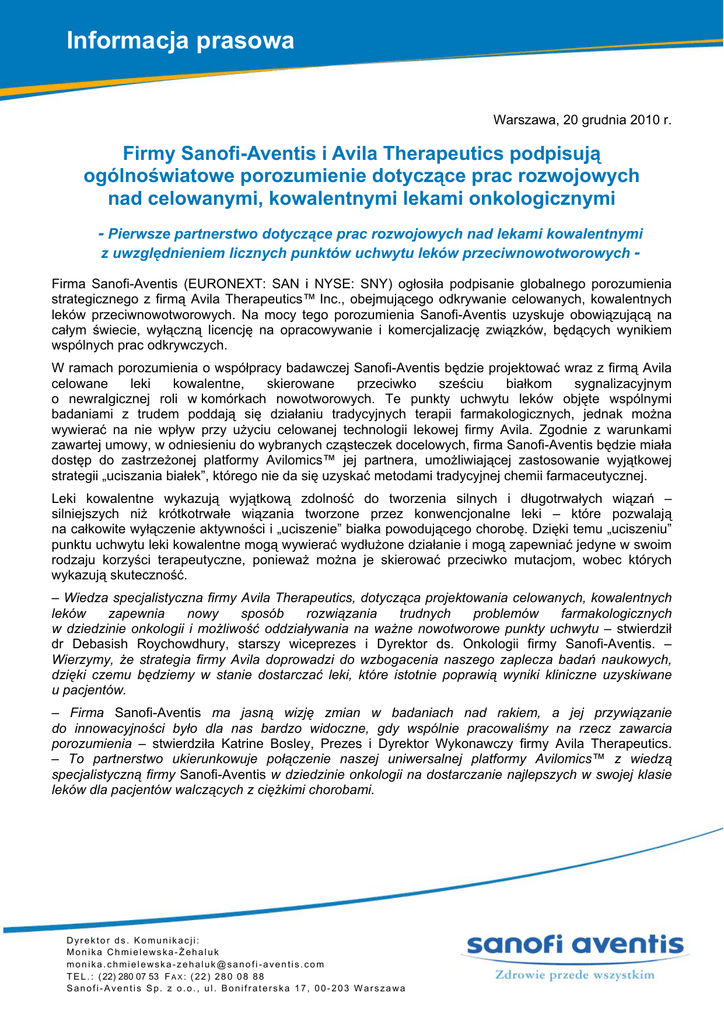 Informacja prasowa Warszawa, 20 grudnia 2010 r. Firmy Sanofi-Aventis i Avila Therapeutics podpisują ogólnoświatowe porozumienie dotyczące prac rozwojowych nad celowanymi, kowalentnymi lekami onkologicznymi - Pierwsze partnerstwo dotyczące prac rozwojowych nad lekami kowalentnymi z uwzględnieniem licznych punktów uchwytu leków przeciwnowotworowych Firma Sanofi-Aventis (EURONEXT: SAN i NYSE: SNY) ogłosiła podpisanie globalnego porozumienia strategicznego z firmą Avila Therapeutics™ Inc., obejmującego odkrywanie celowanych, kowalentnych leków przeciwnowotworowych. Na mocy tego porozumienia Sanofi-Aventis uzyskuje obowiązującą na całym świecie, wyłączną licencję na opracowywanie i komercjalizację związków, będących wynikiem wspólnych prac odkrywczych. W ramach porozumienia o współpracy badawczej Sanofi-Aventis będzie projektować wraz z firmą Avila celowane leki kowalentne, skierowane przeciwko sześciu białkom sygnalizacyjnym o newralgicznej roli w komórkach nowotworowych. Te punkty uchwytu leków objęte wspólnymi badaniami z trudem poddają się działaniu tradycyjnych terapii farmakologicznych, jednak można wywierać na nie wpływ przy użyciu celowanej technologii lekowej firmy Avila. Zgodnie z warunkami zawartej umowy, w odniesieniu do wybranych cząsteczek docelowych, firma Sanofi-Aventis będzie miała dostęp do zastrzeżonej platformy Avilomics™ jej partnera, umożliwiającej zastosowanie wyjątkowej strategii „uciszania białek”, którego nie da się uzyskać metodami tradycyjnej chemii farmaceutycznej. Leki kowalentne wykazują wyjątkową zdolność do tworzenia silnych i długotrwałych wiązań – silniejszych niż krótkotrwałe wiązania tworzone przez konwencjonalne leki – które pozwalają na całkowite wyłączenie aktywności i „uciszenie” białka powodującego chorobę. Dzięki temu „uciszeniu” punktu uchwytu leki kowalentne mogą wywierać wydłużone działanie i mogą zapewniać jedyne w swoim rodzaju korzyści terapeutyczne, ponieważ można je skierować przeciwko mutacjom, wobec których wykazują skuteczność. – Wiedza specjalistyczna firmy Avila Therapeutics, dotycząca projektowania celowanych, kowalentnych leków zapewnia nowy sposób rozwiązania trudnych problemów farmakologicznych w dziedzinie onkologii i możliwość oddziaływania na ważne nowotworowe punkty uchwytu – stwierdził dr Debasish Roychowdhury, starszy wiceprezes i Dyrektor ds. Onkologii firmy Sanofi-Aventis. – Wierzymy, że strategia firmy Avila doprowadzi do wzbogacenia naszego zaplecza badań naukowych, dzięki czemu będziemy w stanie dostarczać leki, które istotnie poprawią wyniki kliniczne uzyskiwane u pacjentów. – Firma Sanofi-Aventis ma jasną wizję zmian w badaniach nad rakiem, a jej przywiązanie do innowacyjności było dla nas bardzo widoczne, gdy wspólnie pracowaliśmy na rzecz zawarcia porozumienia – stwierdziła Katrine Bosley, Prezes i Dyrektor Wykonawczy firmy Avila Therapeutics. – To partnerstwo ukierunkowuje połączenie naszej uniwersalnej platformy Avilomics™ z wiedzą specjalistyczną firmy Sanofi-Aventis w dziedzinie onkologii na dostarczanie najlepszych w swojej klasie leków dla pacjentów walczących z ciężkimi chorobami. Dyrektor ds. Komunikacji: Monika Chmielewska-Żehaluk [email protected] T E L . : ( 22) 280 07 53 F A X : ( 2 2 ) 2 8 0 0 8 8 8 Sanofi-Aventis Sp. z o.o., ul. Bonifraterska 17, 00-203 Warszawa Avila ma możliwość zachowania praw do jednego z sześciu wspólnie realizowanych programów po zakończeniu początkowego trzyletniego okresu współpracy, a Sanofi-Aventis zachowuje prawo pierwszeństwa do negocjowania takiego programu, gdyby Avila zdecydowała się na rolę partnera w jego realizacji. Avila otrzyma do 40 milionów dolarów amerykańskich w ramach zaliczek i opłat wspierających badanie naukowe. Przysługują jej też płatności po zakończeniu określonych etapów badań przedklinicznych, klinicznych i rejestracji, w wysokości do 154 milionów dolarów amerykańskich na każdy program współpracy, jeśli odpowiedni produkt zostanie dopuszczony do obrotu w Stanach Zjednoczonych, Europie i Japonii. Avila może też otrzymywać od Sanofi-Aventis etapowe honoraria i wynagrodzenia komercyjne za określone wyniki sprzedaży produktu w ramach każdego z programów. Informacje o firmie Avila Therapeutics™, Inc. Firma Avila koncentruje się na projektowaniu i rozwijaniu celowanych leków kowalentnych, aby zapewnić najlepsze wyniki w swojej klasie, których nie można uzyskać tradycyjnymi metodami chemicznymi. Technologie te określane są jako „uciszanie białek”. Asortyment produktów poddawanych obecnie przez firmę badaniom rozwojowym został zbudowany przy użyciu własnej platformy Avilomics™. Aktualnie są to preparaty przeznaczone do leczenia zakażeń wirusowych, nowotworów i chorób autoimmunologicznych. Firma Avila jest finansowana przez wiodące firmy venture capital: Abingworth, Advent Venture Partners, Atlas Venture, Novartis Option Fund i Polaris Venture Partners. Dodatkowe informacje można uzyskać na stronie http://www.avilatx.com Informacje o Dziale Onkologii (Oncology) firmy Sanofi-Aventis Dział Onkologii firmy Sanofi-Aventis jest ukierunkowany na walkę z chorobami nowotworowymi na wszystkich frontach i dąży do zaspokojenia istniejących potrzeb medycznych dotyczących szerokiej grupy pacjentów. Począwszy od dogłębnego zrozumienia mechanizmów rozwoju, wzrostu i rozsiewu nowotworów, a także od zidentyfikowania właściwej gałęzi nauki wcześnie w procesie dokonywania odkryć leków, spółka stosuje innowacyjne metody dostarczania właściwych leków odpowiednim pacjentom. Obecnie ponad 10 związków poddawanych jest badaniom rozwojowym w ramach szerokiego obszaru zainteresowań naukowych, m.in. produkty celowane, cytotoksyczne i przeciwdziałające angiogenezie na bazie zarówno nowych substancji chemicznych, jak i przeciwci