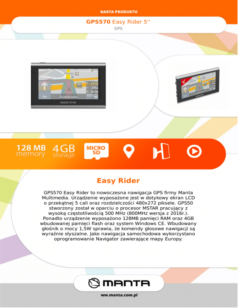 GPS570EasyRider5'' GPS EasyRider GPS570EasyRidertonowoczesnanawigacjaGPSfirmyManta Multimedia.UrządzeniewyposażonejestwdotykowyekranLCD oprzekątnej5caliorazrozdzielczości480x272piksele.GPS50 stworzonyzostałwoparciuoprocesorMSTARpracującyz wysokączęstotliwością500MHz(800MHzwersjaz2016r.). Ponadtourządzeniewyposażono128MBpamięciRAMoraz4GB wbudowanejpamięciflashorazsystemWindowsCE.Wbudowany głośnikomocy1,5Wsprawia,żekomendygłosowenawigacjisą wyraźniesłyszalne.Jakonawigacjasamochodowawykorzystano oprogramowanieNavigatorzawierającemapyEuropy. GPS570EasyRider5'' GPS Specyfikacja OpróczfunkcjinawigacjiGPS570EasyRider pozwalanaodtwarzanieplikówAudioiWideooraz przeglądaniezdjęćiplikówtekstowych.Ponadto urządzeniewyposażonoaplikacjękalkulatora,gry orazprogramtestującysygnałGPS. Przekątnaekranu 5” Wbudowanegłośniki 1x1,5W Zasilanie DC5V1.0AminiUSB Wymiary(SxWxG) 140x100x13mm Waga 157g Systemoperacyjny WindowsCE6.0 Procesor MSTAR500MHz,wersja2016800MHz RAM 128MB FLASH 4GB GPS MstarMS2531 Gniazdokartpamięci MicroSDmax8GB GniazdoUSB 2.0 Pojemnośćakumulatora 500mAhLi-po Mapa NavigatorFreeEuropa Akcesoriawzestawie KabelUSB,ładowarkasamochodowa, mocowaniedosamochodu,instrukcja obsługi Obsługiwaneformatyplikówmuzycznych MP3(do44kHz),MWA(do44kHz),WAV Odtwarzaneformatywideo MPEG-1,MPEG-4,AVI,WMV,ASF,3GP,Divx Odtwarzaneformatyplikówgraficznych JPEG,BMP,PNG Czaspracy ok.1h http://www.manta.com.pl/pl/gps570 EAN:5907377862048