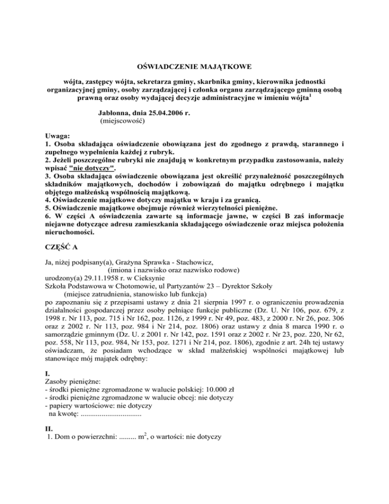 OŚWIADCZENIE MAJĄTKOWE wójta, zastępcy wójta, sekretarza gminy, skarbnika gminy, kierownika jednostki organizacyjnej gminy, osoby zarządzającej i członka organu zarządzającego gminną osobą prawną oraz osoby wydającej decyzje administracyjne w imieniu wójta1 Jabłonna, dnia 25.04.2006 r. (miejscowość) Uwaga: 1. Osoba składająca oświadczenie obowiązana jest do zgodnego z prawdą, starannego i zupełnego wypełnienia kaŜdej z rubryk. 2. JeŜeli poszczególne rubryki nie znajdują w konkretnym przypadku zastosowania, naleŜy wpisać "nie dotyczy". 3. Osoba składająca oświadczenie obowiązana jest określić przynaleŜność poszczególnych składników majątkowych, dochodów i zobowiązań do majątku odrębnego i majątku objętego małŜeńską wspólnością majątkową. 4. Oświadczenie majątkowe dotyczy majątku w kraju i za granicą. 5. Oświadczenie majątkowe obejmuje równieŜ wierzytelności pienięŜne. 6. W części A oświadczenia zawarte są informacje jawne, w części B zaś informacje niejawne dotyczące adresu zamieszkania składającego oświadczenie oraz miejsca połoŜenia nieruchomości. CZĘŚĆ A Ja, niŜej podpisany(a), GraŜyna Sprawka - Stachowicz, (imiona i nazwisko oraz nazwisko rodowe) urodzony(a) 29.11.1958 r. w Cieksynie Szkoła Podstawowa w Chotomowie, ul Partyzantów 23 – Dyrektor Szkoły (miejsce zatrudnienia, stanowisko lub funkcja) po zapoznaniu się z przepisami ustawy z dnia 21 sierpnia 1997 r. o ograniczeniu prowadzenia działalności gospodarczej przez osoby pełniące funkcje publiczne (Dz. U. Nr 106, poz. 679, z 1998 r. Nr 113, poz. 715 i Nr 162, poz. 1126, z 1999 r. Nr 49, poz. 483, z 2000 r. Nr 26, poz. 306 oraz z 2002 r. Nr 113, poz. 984 i Nr 214, poz. 1806) oraz ustawy z dnia 8 marca 1990 r. o samorządzie gminnym (Dz. U. z 2001 r. Nr 142, poz. 1591 oraz z 2002 r. Nr 23, poz. 220, Nr 62, poz. 558, Nr 113, poz. 984, Nr 153, poz. 1271 i Nr 214, poz. 1806), zgodnie z art. 24h tej ustawy oświadczam, Ŝe posiadam wchodzące w skład małŜeńskiej wspólności majątkowej lub stanowiące mój majątek odrębny: I. Zasoby pienięŜne: - środki pienięŜne zgromadzone w walucie polskiej: 10.000 zł - środki pienięŜne zgromadzone w walucie obcej: nie dotyczy - papiery wartościowe: nie dotyczy na kwotę: ................................ II. 1. Dom o powierzchni: ......... m2, o wartości: nie dotyczy tytuł prawny: ............................................. 2. Mieszkanie o powierzchni: 63 m2, o wartości: 122.831,00 tytuł prawny: ............................................. 3. Gospodarstwo rolne: rodzaj gospodarstwa: nie dotyczy..............., powierzchnia: ....... o wartości: ............................................... rodzaj zabudowy: .......................................... tytuł prawny: ............................................. Z tego tytułu osiągnąłem(ęłam) w roku ubiegłym przychód i dochód w wysokości: nie dotyczy....................................... 4. Inne nieruchomości: powierzchnia: nie dotyczy o wartości: ............................................... tytuł prawny: ............................................. III. Posiadam udziały w spółkach handlowych - naleŜy podać liczbę i emitenta udziałów: nie posiadam udziały te stanowią pakiet większy niŜ 10% udziałów w spółce:....................... Z tego tytułu osiągnąłem(ęłam) w roku ubiegłym dochód w wysokości: ................. IV. Posiadam akcje w spółkach handlowych - naleŜy podać liczbę i emitenta akcji: nie posiadam akcje te stanowią pakiet większy niŜ 10% akcji w spółce:........................ Z tego tytułu osiągnąłem(ęłam) w roku ubiegłym dochód w wysokości: ..................... V. Nabyłem(am) (nabył mój małŜonek, z wyłączeniem mienia przynaleŜnego do jego majątku odrębnego) od Skarbu Państwa, innej państwowej osoby prawnej, jednostek samorządu terytorialnego, ich związków lub od komunalnej osoby prawnej następujące mienie, które podlegało zbyciu w drodze przetargu - naleŜy podać opis mienia i datę nabycia, od kogo: nie dotyczy. VI. 1. Prowadzę działalność gospodarczą2 (naleŜy podać formę prawną i przedmiot działalności):nie prowadzę - osobiście ............................................... - wspólnie z innymi osobami ............................... Z tego tytułu osiągnąłem(ęłam) w roku ubiegłym przychód i dochód w wysokości: ............... 2. Zarządzam działalnością gospodarczą lub jestem przedstawicielem pełnomocnikiem takiej działalności (naleŜy podać formę prawną i przedmiot działalności): ............. - osobiście nie dotyczy - wspólnie z innymi osobami ............................... Z tego tytułu osiągnąłem(ęłam) w roku ubiegłym dochód w wysokości: .............................................. VII. 1. W spółkach handlowych (nazwa, siedziba spółki): nie dotyczy - jestem członkiem zarządu (od kiedy): .................... - jestem członkiem rady nadzorczej (od kiedy): ............ - jestem członkiem komisji rewizyjnej (od kiedy): ......... Z tego tytułu osiągnąłem(ęłam) w roku ubiegłym dochód w wysokości: 2. W spółdzielniach: nie dotyczy - jestem członkiem zarządu (od kiedy): .................... - jestem członkiem rady nadzorczej3 (od kiedy): ........... - jestem członkiem komisji rewizyjnej (od kiedy): ......... Z tego tytułu osiągnąłem(ęłam) w roku ubiegłym dochód w wysokości: ................... 3. W fundacjach prowadzących działalność gospodarczą: nie dotyczy - jestem członkiem zarządu (od kiedy): .................... - jestem członkiem rady nadzorczej (od kiedy): ............ - jestem członkiem komisji rewizyjnej (od kiedy): ......... Z tego tytułu osiągnąłem(ęłam) w roku ubiegłym dochód w wysokości: ............... VIII. Inne dochody osiągane z tytułu zatrudnienia lub innej działalności zarobkowej lub zajęć, z podaniem kwot uzyskiwanych z