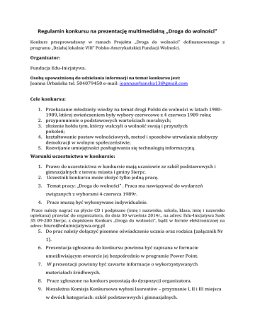 Regulamin konkursu na prezentację multimedialną „Droga do wolności” Konkurs przeprowadzony w ramach Projektu „Droga do wolności” dofinansowanego z programu „Działaj lokalnie VIII” Polsko-Amerykańskiej Fundacji Wolności. Organizator: Fundacja Edu-Inicjatywa. Osobą upoważnioną do udzielania informacji na temat konkursu jest: Joanna Urbańska tel. 504079450 e-mail: [email protected] Cele konkursu: 1. Przekazanie młodzieży wiedzy na temat drogi Polski do wolności w latach 19801989, której zwieńczeniem były wybory czerwcowe z 4 czerwca 1989 roku; 2. przypomnienie o podstawowych wartościach moralnych; 3. złożenie hołdu tym, którzy walczyli o wolność swoją i przyszłych pokoleń; 4. kształtowanie postaw wolnościowych, metod i sposobów utrwalania zdobyczy demokracji w wolnym społeczeństwie; 5. Rozwijanie umiejętności posługiwania się technologią informacyjną. Warunki uczestnictwa w konkursie: 1. Prawo do uczestnictwa w konkursie mają uczniowie ze szkół podstawowych i gimnazjalnych z terenu miasta i gminy Sierpc. 2. Uczestnik konkursu może złożyć tylko jedną pracę. 3. Temat pracy: „Droga do wolności” . Praca ma nawiązywać do wydarzeń związanych z wyborami 4 czerwca 1989r. 4. Prace muszą być wykonywane indywidualnie. Prace należy nagrać na płycie CD i podpisane (imię i nazwisko, szkoła, klasa, imię i nazwisko opiekuna) przesłać do organizatora, do dnia 30 września 2014r., na adres: Edu-Inicjatywa Susk 35 09-200 Sierpc, z dopiskiem Konkurs „Droga do wolności”, bądź w formie elektronicznej na adres: [email protected] 5. Do prac należy dołączyć pisemne oświadczenie ucznia oraz rodzica (załącznik Nr 1). 6. Prezentacja zgłoszona do konkursu powinna być zapisana w formacie umożliwiającym otwarcie jej bezpośrednio w programie Power Point. 7. W prezentacji powinny być zawarte informacje o wykorzystywanych materiałach źródłowych. 8. Prace zgłoszone na konkurs pozostają do dyspozycji organizatora. 9. Niezależna Komisja Konkursowa wyłoni laureatów – przyznanie I, II i III miejsca w dwóch kategoriach: szkół podstawowych i gimnazjalnych. 10. Nagrodzone i wyróżnione szkoły zostaną poinformowane, a laureaci wraz z opiekunami otrzymają zaproszenie na uroczystą konferencję podsumowującą Projekt „Droga do wolności”, która odbędzie się w dniu 27 października 2014r. w Muzeum Wsi Mazowieckiej w Sierpcu. Nagrodzone prace zostaną zaprezentowane na forum przybyłych gości. 11. Kryteria oceniania: - Zgodność treści prezentacji z hasłem przewodnim konkursu. - Poprawność merytoryczna zamieszczonych w prezentacji informacji. - Przejrzysty i uporządkowany układ prezentacji. - Adekwatność zastosowanych narzędzi i efektów do przedstawianych treści. - Innowacyjność i kreatywność w podejściu do tematu. - Ogólne wrażenie estetyczne. Nagrody: Laureaci I – III miejsca w kategorii szkół podstawowych i gimnazjalnych otrzymują nagrody rzeczowe. Postanowienia końcowe: Nagrodzeni uczestnicy wraz z opiekunami przyjeżdżają na koszt własny. Załącznik 1 Oświadczam, że zgłoszona do niniejszego konkursu praca jest wynikiem własnej twórczości…………............................................................... (imięi nazwiskouczestnika konkursu) i nie narusza praw autorskich oraz jakichkolwiek innych praw osób trzecich oraz że nie została zgłoszona do innych konkursów o podobnej tematyce. Wyrażam zgodę na udzielenie Organizatorom Konkursu nieodpłatnej, bezterminowej i nieograniczonej terytorialnie licencji na umieszczenie pracy w całości lub częściach na stronach internetowych organizatorów konkursu, wykonanie reprodukcji nagrodzonych i wyróżnionych prac oraz ich powielenie w materiałach promocyjnych i edukacyjnych związanych z konkursem oraz w innych publikacjach związanych z działalnością Organizatorów. Wyrażam niniejszym zgodę na umieszczenie danych osobowych: ………………………………….....................................................................................................(imię i nazwisko uczestniczki konkursu) w bazie danych Organizatora Konkursu „Droga do wolności” oraz przetwarzanie ich, zgodnie z Ustawą z dnia29 sierpnia 1997 r. o ochronie danych osobowych (Dz. U. z 2002 r. Nr 101, poz. 926, z późn. zm.) w celu przeprowadzenia konkursu oraz dalszego wykorzystania prac. Wyrażam zgodę na przetwarzanie danych osobowych na zasadach określonych wyżej. Podpisanie oświadczenie jest równoznaczne z bezterminowym zrzeczeniem się autorskich praw majątkowych do pracy na rzecz Organizatora Konkursu na wszystkich polach eksploatacji na terenie Rzeczypospolitej Polskiej i poza jej granicami. .............................................................. (podpis rodzica/opiekuna prawnego) ………………………..…………………………. (podpis ucznia)