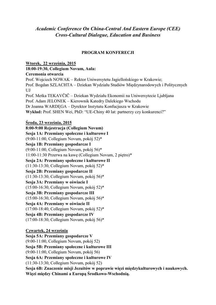 Academic Conference On China-Central And Eastern Europe (CEE) Cross-Cultural Dialogue, Education and Business PROGRAM KONFERECJI Wtorek, 22 września, 2015 18:00-19:30, Collegium Novum, Aula: Ceremonia otwarcia Prof. Wojciech NOWAK – Rektor Uniwersytetu Jagiellońskiego w Krakowie; Prof. Bogdan SZLACHTA – Dziekan Wydziału Studiów Międzynarodowych i Politycznych UJ Prof. Metka TEKAVČIČ – Dziekan Wydziału Ekonomii na Uniwersytecie Ljubljana Prof. Adam JELONEK – Kierownik Katedry Dalekiego Wschodu Dr Joanna WARDĘGA – Dyrektor Instytutu Konfucjusza w Krakowie Wykład: Prof. SHEN Wei, PhD: “UE-Chiny 40 lat: partnerzy czy konkurenci?” Środa, 23 września, 2015 8:00-9:00 Rejestracja (Collegium Novum) Sesja 1A: Przemiany społeczne i kulturowe I (9:00-11:00, Collegium Novum, pokój 52)* Sesja 1B: Przemiany gospodarcze I (9:00-11:00, Collegium Novum, pokój 56)* 11:00-11:30 Przerwa na kawę (Collegium Novum, 2 piętro)* Sesja 2A: Przemiany społeczne i kulturowe II (11:30-13:30, Collegium Novum, pokój 52)* Sesja 2B: Przemiany gospodarcze II (11:30-13:30, Collegium Novum, pokój 56)* Sesja 3A: Przemiany w oświacie I (15:00-16:30, Collegium Novum, pokój 52)* Sesja 3B: Przemiany gospodarcze III (15:00-16:30, Collegium Novum, pokój 56)* Sesja 4A: Przemiany w oświacie II (17:00-18:40, Collegium Novum, pokój 52)* Sesja 4B: Przemiany gospodarcze IV (17:00-18:30, Collegium Novum, pokój 56)* Czwartek, 24 września Sesja 5A: Przemiany gospodarcze V (9:00-11:00, Collegium Novum, pokój 52) Sesja 5B: Przemiany społeczne i kulturowe III (9:00-11:00, Collegium Novum, pokój 56) Sesja 6A: Przemiany społeczne i kulturowe IV (11:30-13:30, Collegium Novum, pokój 52) Sesja 6B: Znaczenie misji Jezuitów w poprawie więzi międzykulturowych i naukowych. Więzi między Chinami a Europą Środkowo-Wschodnią. (11:30-13:30, Collegium Novum, pokój 56) Sesja 7A: Przemiany gospodarcze VI (15:00-16:30, Collegium Novum, pokój 52) Sesja 7B: Przemiany społeczne i kulturowe V (15:00-16:30, Collegium Novum, pokój 56) Sesja 8A: Przemiany społeczne i kulturowe VI (17:00-18:15, Collegium Novum, pokój 52) Sesja 8B: Przemiany w oświacie III (17:00-18:15, Collegium Novum, pokój 56)* zamknięcia (18:30-19:30 Collegium Maius, Aula) Prof. LIU Wansheng, Pierwszy sekretarz i naczelnik Wydziału Edukacyjnego Ambasady Chińskiej Republiki Ludowej w Polsce Wykład: Prof. Bogdan Góralczyk, PhD ”Nowy chiński model rozwoju: pochodzenie i konsekwencje”. KOMITET NAUKOWY: Prof. Adam W. Jelonek, Uniwersytet Jagielloński, Instytut Bliskiego i Dalekiego Wschodu; Dr. Joanna Wardęga, Uniwersytet Jagielloński, Instytut Bliskiego i Dalekiego Wschodu; Instytut Konfucjusza w Krakowie; Dr. Adina Zemanek, Uniwersytet Jagielloński, Instytut Bliskiego i Dalekiego Wschodu; Dr. Matevž Rašković, Uniwersytet Lublański, Wydział Ekonomii & Instytut Konfucjusza w Lublanie; Prof. Luminiţa Bălan, Uniwersytet Bukareszteński, Instytut Konfucjusza w Bukareszcie; Wydział Języków Obcych, Wydział Sinologii; Prof. Jana Rošker, Uniwersytet Lublański, Wydział Sztuk, Sinologia; Prof. Mitja Saje, Uniwersytet Lublański, Wydział Sztuk, Sinologia; Prof. Andreja Jaklič, Uniwersytet Lublański, Wydział Nauk Społecznych & Centrum Stosunków Międzynarodowych Prof. Nako Stefanov, Uniwersytet Sofijski, Wydział Dalekiego Wschodu; Prof. Jaroslava Kubátová, Uniwersytet Palackiego w Ołomuńcu, Wydział Ekonomii Stosowanej; Prof. Deng Shizhong, Instytut Konfucjusza w Uniwersytet Świętych Cyryla i Metodego w Skopje; Dr. Tony Fang, Uniwersytet w Sztokholmie, Szkoła Biznesu; Prof. Wei Shen, Uniwersytet Lancaster, Szkoła Zarządzania & Instytut Konfucjusza w Lancaster; Prof. Richard Trappl, PhD, Uniwersytet Wiedeński, Sinologia & Instytut Konfucjusza w Wiedniu; Prof. Kerry Brown, Uniwersytet w Sydney, Centrum Nauki Języka Chińskiego; Prof. Zhao Gang, Pekiński Uniwersytet Języków Obcych; Centrum nauki języka i kultury Europejskiej Prof. Ye Rong, Shanghai University of International Business & Economics, Szkoła językowa; Prof. Liu Zuokui, Chińska Akademia nauk socjalnych, instytut studiów europejskich Prof. Colin Sparks, Uniwersytet baptystów w Hongkongu, Szkoła komunikacji Patronami konferencji są: Jego Ekscelencja, Ambasador Chińskiej Republiki Ludowej w Polsce, pan Xu Jian Pan Jerzy MILLER, Wojewoda Małopolski Pan Marek SOWA, Marszałek Województwa Małopolskiego. Prof. Jacek MAJCHROWSKI, Prezydent Miasta Krakowa Jego Magnificencja Prof. dr hab. Wojciech NOWAK, Rektor Uniwersytetu Jagiellońskiego Prof. dr hab. Bogdan SZLACHTA, Dziekan Wydziału Studiów Międzynarodowych i Politycznych UJ ORGANIZATORZY Główni organizatorzy: Centrum Języka i Kultury Chińskiej Uniwersytetu Jagiellońskiego „Instytut Konfucjusza w Krakowie” Pekiński Uniwersytet Języków Obcych (Chiny) Instytut Bliskiego i Dalekiego Wschodu (Uniwersytet Jagielloński) Konferencja odbędzie się przy współpracy z Ambasadą Chińskiej Republiki Ludowej w Warszawie Współorganizatorzy: Instytut Konfucjusza w Lublanie (Słowenia) Instytut Konfucjusza w Sofii (Bułgaria) Instytut Konfucjusza w Ołomuniec (Czechy) Instytut Konfucjusza ELTE w Budapeszcie (Węgry) Instytut Konfucjusza w Bukareszcie (Rumunia) Instytut Konfucjusza w Skopje (Macedonia) Instytut Konfucjusza w Lancaster (Wielka Brytania) Termin: 22.09.2015 - 24.09.2015 Miejsce: Collegium Novum Witryna internetowa: www.china-cee.confer.uj.edu.pl