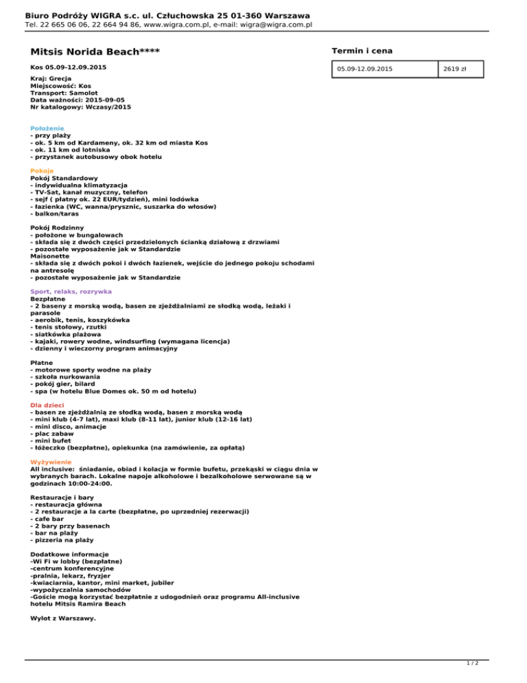 Biuro Podróży WIGRA s.c. ul. Człuchowska 25 01-360 Warszawa Tel. 22 665 06 06, 22 664 94 86, www.wigra.com.pl, e-mail: [email protected] Mitsis Norida Beach**** Kos 05.09-12.09.2015 Termin i cena 05.09-12.09.2015 2619 zł Kraj: Grecja Miejscowość: Kos Transport: Samolot Data ważności: 2015-09-05 Nr katalogowy: Wczasy/2015 Położenie - przy plaży - ok. 5 km od Kardameny, ok. 32 km od miasta Kos - ok. 11 km od lotniska - przystanek autobusowy obok hotelu Pokoje Pokój Standardowy - indywidualna klimatyzacja - TV-Sat, kanał muzyczny, telefon - sejf ( płatny ok. 22 EUR/tydzień), mini lodówka - łazienka (WC, wanna/prysznic, suszarka do włosów) - balkon/taras Pokój Rodzinny - położone w bungalowach - składa się z dwóch części przedzielonych ścianką działową z drzwiami - pozostałe wyposażenie jak w Standardzie Maisonette - składa się z dwóch pokoi i dwóch łazienek, wejście do jednego pokoju schodami na antresolę - pozostałe wyposażenie jak w Standardzie Sport, relaks, rozrywka Bezpłatne - 2 baseny z morską wodą, basen ze zjeżdżalniami ze słodką wodą, leżaki i parasole - aerobik, tenis, koszykówka - tenis stołowy, rzutki - siatkówka plażowa - kajaki, rowery wodne, windsurfing (wymagana licencja) - dzienny i wieczorny program animacyjny Płatne - motorowe sporty wodne na plaży - szkoła nurkowania - pokój gier, bilard - spa (w hotelu Blue Domes ok. 50 m od hotelu) Dla dzieci - basen ze zjeżdżalnią ze słodką wodą, basen z morską wodą - mini klub (4-7 lat), maxi klub (8-11 lat), junior klub (12-16 lat) - mini disco, animacje - plac zabaw - mini bufet - łóżeczko (bezpłatne), opiekunka (na zamówienie, za opłatą) Wyżywienie All inclusive: śniadanie, obiad i kolacja w formie bufetu, przekąski w ciągu dnia w wybranych barach. Lokalne napoje alkoholowe i bezalkoholowe serwowane są w godzinach 10:00-24:00. Restauracje i bary - restauracja główna - 2 restauracje a la carte (bezpłatne, po uprzedniej rezerwacji) - cafe bar - 2 bary przy basenach - bar na plaży - pizzeria na plaży Dodatkowe informacje -Wi Fi w lobby (bezpłatne) -centrum konferencyjne -pralnia, lekarz, fryzjer -kwiaciarnia, kantor, mini market, jubiler -wypożyczalnia samochodów -Goście mogą korzystać bezpłatnie z udogodnień oraz programu All-inclusive hotelu Mitsis Ramira Beach Wylot z Warszawy. 1/2 Biuro Podróży WIGRA s.c. ul. Człuchowska 25 01-360 Warszawa Tel. 22 665 06 06, 22 664 94 86, www.wigra.com.pl, e-mail: [email protected] 2/2 Powered by TCPDF (www.tcpdf.org)
