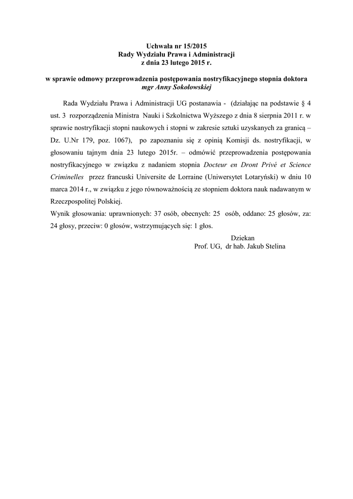 Uchwała nr 15/2015 Rady Wydziału Prawa i Administracji z dnia 23 lutego 2015 r. w sprawie odmowy przeprowadzenia postępowania nostryfikacyjnego stopnia doktora mgr Anny Sokołowskiej Rada Wydziału Prawa i Administracji UG postanawia - (działając na podstawie § 4 ust. 3 rozporządzenia Ministra Nauki i Szkolnictwa Wyższego z dnia 8 sierpnia 2011 r. w sprawie nostryfikacji stopni naukowych i stopni w zakresie sztuki uzyskanych za granicą – Dz. U.Nr 179, poz. 1067), po zapoznaniu się z opinią Komisji ds. nostryfikacji, w głosowaniu tajnym dnia 23 lutego 2015r. – odmówić przeprowadzenia postępowania nostryfikacyjnego w związku z nadaniem stopnia Docteur en Dront Privé et Science Criminelles przez francuski Universite de Lorraine (Uniwersytet Lotaryński) w dniu 10 marca 2014 r., w związku z jego równoważnością ze stopniem doktora nauk nadawanym w Rzeczpospolitej Polskiej. Wynik głosowania: uprawnionych: 37 osób, obecnych: 25 osób, oddano: 25 głosów, za: 24 głosy, przeciw: 0 głosów, wstrzymujących się: 1 głos. Dziekan Prof. UG, dr hab. Jakub Stelina