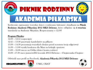 PIKNIK RODZINNY AKADEMIA PIŁKARSKA Serdecznie zapraszamy wszystkie dzieci z rodzicami, babciami i dziadkami na Piknik Rodzinny Akademii Piłkarskiej 2012 MKS Debrzno, który odbędzie się 4 września (niedziela) na Stadionie Miejskim. Rozpoczynamy o 12:30! Program Pikniku: 12:30 – 12:45 rozpoczęcie 12:45 – 13:30 pasowanie kandydatów na piłkarzy 13:30 – 14:30 prezentacja wszystkich drużyn przed sezonem (sesja zdjęciowa) 14:30 – 15:00 wyniki konkursu dla Mam na koktajle sportowe 15:00 – 16:00 mecze na Orliku (dzieci kontra rodzice) 16:00 –17:30 mecz juniorówD2 (rocznik 2005) Debrzno – Chojniczanka Chojnice Odwiedź nasz profil na Facebook: Akademia Piłkarska 2012 MKS Debrzno organizatorzy: UMiG, CKSiT