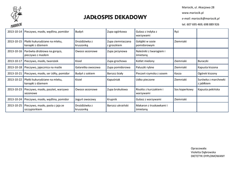 Mariocik, ul. Akacjowa 28 www.mariocik.pl JADŁOSPIS DEKADOWY e-mail: [email protected] tel. 607 695 469; 698 889 926 2013-10-14 Pieczywo, masło, wędlina, pomidor Budyń Zupa ogórkowa Gulasz z indyka z warzywami Ryż 2013-10-15 Płatki kukurydziane na mleku, kanapki z dżemem Drożdżówka z kruszonką Zupa ziemniaczana z groszkiem Gołąbki w sosie pomidorowym Ziemniaki 2013-10-16 Parówka drobiowa na gorąco, pieczywo z masłem Owoce sezonowe Zupa jarzynowa Naleśniki z twarogiem i śmietaną 2013-10-17 Pieczywo, masło, twarożek Kisiel Zupa grochowa Kotlet mielony Ziemniaki Buraczki 2013-10-18 Pieczywo, jajecznica na maśle Galaretka owocowa Zupa pomidorowa Paluszki rybne Ziemniaki Kapusta kiszona 2013-10-21 Pieczywo, masło, ser żółty, pomidor Budyń z sokiem Barszcz biały Pieczeń rzymska z sosem Kasza Ogórek kiszony 2013-10-22 Płatki kukurydziane na mleku, kanapki z dżemem Kisiel Kapuśniak Udko pieczone Ziemniaki Surówka z marchewki z jabłkiem 2013-10-23 Pieczywo, masło, pasztet, warzywo sezonowe Owoce sezonowe Zupa brokułowa Risotto z kurczakiem i warzywami Sos koperkowy Kapusta pekińska 2013-10-24 Pieczywo, masło, wędlina, pomidor Jogurt owocowy Krupnik Gulasz z warzywami Ziemniaki 2013-10-25 Pieczywo, masło, pasta z jaja ze szczypiorkiem Drożdżówka z kruszonką Barszcz ukraiński Makaron z truskawkami i śmietaną Opracowała: Violetta Dąbrowska DIETETYK DYPLOMOWANY