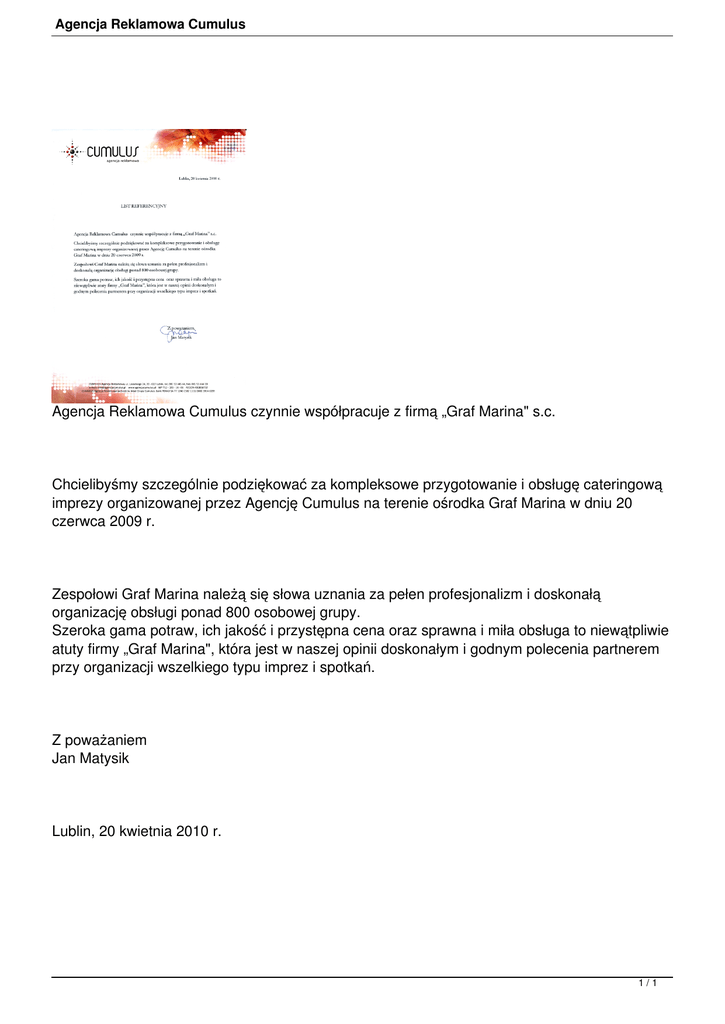 Agencja Reklamowa Cumulus Agencja Reklamowa Cumulus czynnie współpracuje z firmą „Graf Marina" s.c. Chcielibyśmy szczególnie podziękować za kompleksowe przygotowanie i obsługę cateringową imprezy organizowanej przez Agencję Cumulus na terenie ośrodka Graf Marina w dniu 20 czerwca 2009 r. Zespołowi Graf Marina należą się słowa uznania za pełen profesjonalizm i doskonałą organizację obsługi ponad 800 osobowej grupy. Szeroka gama potraw, ich jakość i przystępna cena oraz sprawna i miła obsługa to niewątpliwie atuty firmy „Graf Marina", która jest w naszej opinii doskonałym i godnym polecenia partnerem przy organizacji wszelkiego typu imprez i spotkań. Z poważaniem Jan Matysik Lublin, 20 kwietnia 2010 r. 1/1