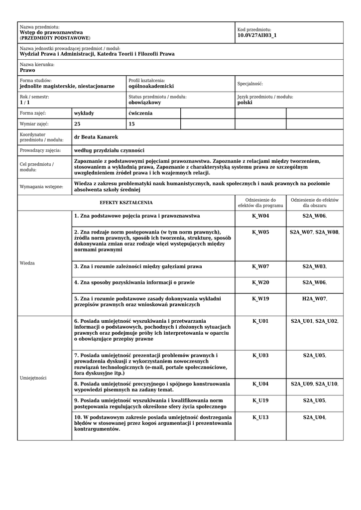 Nazwa przedmiotu: Kod przedmiotu: Wstęp do prawoznawstwa 10.0V27AII03_1 (PRZEDMIOTY PODSTAWOWE) Nazwa jednostki prowadzącej przedmiot / moduł: Wydział Prawa i Administracji, Katedra Teorii i Filozofii Prawa Nazwa kierunku: Prawo Forma studiów: Profil kształcenia: jednolite magisterskie, niestacjonarne ogólnoakademicki Rok / semestr: 1/1 Status przedmiotu / modułu: Język przedmiotu / modułu: obowiązkowy polski Specjalność: Forma zajęć: wykłady ćwiczenia Wymiar zajęć: 25 15 Koordynator przedmiotu / modułu: dr Beata Kanarek Prowadzący zajęcia: według przydziału czynności Cel przedmiotu / modułu: Zapoznanie z podstawowymi pojęciami prawoznawstwa. Zapoznanie z relacjami między tworzeniem, stosowaniem a wykładnią prawa, Zapoznanie z charakterystyką systemu prawa ze szczególnym uwzględnieniem źródeł prawa i ich wzajemnych relacji. Wymagania wstępne: Wiedza z zakresu problematyki nauk humanistycznych, nauk społecznych i nauk prawnych na poziomie absolwenta szkoły średniej Odniesienie do efektów dla programu Odniesienie do efektów dla obszaru 1. Zna podstawowe pojęcia prawa i prawoznawstwa K_W04 S2A_W06, 2. Zna rodzaje norm postępowania (w tym norm prawnych), źródła norm prawnych, sposób ich tworzenia, strukturę, sposób dokonywania zmian oraz rodzaje więzi występujących między normami prawnymi K_W05 S2A_W07, S2A_W08, 3. Zna i rozumie zależności między gałęziami prawa K_W07 S2A_W03, 4. Zna sposoby pozyskiwania informacji o prawie K_W20 S2A_W06, 5. Zna i rozumie podstawowe zasady dokonywania wykładni przepisów prawnych oraz wnioskowań prawniczych K_W19 H2A_W07, 6. Posiada umiejętność wyszukiwania i przetwarzania informacji o podstawowych, pochodnych i złożonych sytuacjach prawnych oraz podejmuje próby ich interpretowania w oparciu o obowiązujące przepisy prawne K_U01 S2A_U01, S2A_U02, 7. Posiada umiejętność prezentacji problemów prawnych i prowadzenia dyskusji z wykorzystaniem nowoczesnych rozwiązań technologicznych (e-mail, portale społecznościowe, fora dyskusyjne itp.) K_U03 S2A_U05, 8. Posiada umiejętność precyzyjnego i spójnego konstruowania wypowiedzi pisemnych na zadany temat. K_U04 S2A_U09, S2A_U10, 9. Posiada umiejętność wyszukiwania i kwalifikowania norm postępowania regulujących określone sfery życia społecznego K_U19 S2A_U05, 10. W podstawowym zakresie posiada umiejętność dostrzegania błędów w stosowanej przez kogoś argumentacji i prezentowania kontrargumentów. K_U13 S2A_U04, EFEKTY KSZTAŁCENIA Wiedza Umiejętności Kompetencje społeczne 11. Wykazuje gotowość do podejmowania wyzwań zawodowych oraz charakteryzuje się wytrwałością w poszukiwaniu rozwiązań K_K02 S2A_K02, 12. Utożsamia się z wartościami, celami i zadaniami realizowanymi w praktyce prawniczej K_K04 S2A_K03, S2A_K04, S2A_K05, 13. Formułuje problemy etyczne związane z pracą prawnika oraz poszukuje optymalnych rozwiązań i możliwości korygowania nieetycznych zachowań prawników. K_K05 S2A_K04, 14. Wykazuje zainteresowanie aktualnymi problemami prawnymi oraz gotowość do aktywnego uczestniczenia w działaniach podmiotów związanych z prawem K_K07 S2A_K02, S2A_K05, 15. Aktywnie uczestniczy w wydarzeniach mających związek z szeroko rozumianą kulturą prawną K_K09 S2A_K05, H2A_K06, TREŚCI PROGRAMOWE Liczba godzin Forma zajęć: wykłady 1. Pojęcie i funkcje prawa - Wizje prawa - Prawo jako zjawisko społeczne - Prawo jako zjawisko polityczne. Wieloznaczność terminu „prawo” - Funkcje prawa 1 2. Prawo jako przedmiot badań naukowych - Podstawowe problemy nauk prawnych - Płaszczyzny badawcze w prawoznawstwie - Naukowość prawoznawstwa 2 3. Norma postępowania - Wypowiedź dyrektywalna i jej rodzaje - Norma postępowania - Obowiązywanie normy Normy prawne. Rodzaje norm prawnych 2 4. Język prawa - Język prawny i język prawniczy - Charakterystyka języka tekstów prawnych 4 5. Akty normatywne - Pojęcie aktu normatywnego - Budowa aktu normatywnego 2 6. Obowiązywanie prawa - Pojęcie obowiązywania - Wejście aktu normatywnego w życie - Eliminowanie aktów normatywnych z systemu - Terytorialny i podmiotowy aspekt obowiązywania prawa 2 7. Znajomość prawa - Ogłoszenie aktu normatywnego - Dzienniki urzędowe - Inne formy przekazywania informacji o prawie - Ignorantia iuris nocet 2 8. Wykładnia przepisów prawnych - Pojęcie wykładni - Zadania wykładni - Fazy wykładni - Rodzaje dyrektyw wykładni - Wnioskowania prawnicze 4 9. Stosowanie prawa - Pojęcie stosowania prawa - Etapy stosowania prawa - Typy stosowania prawa - Zakres swobody podejmowania decyzji - Ustalanie faktów 2 10. System prawa - Pojęcie systemu prawa - Systemy civil law i common law - Prawo krajowe, prawo międzynarodowe, prawo Unii Europejskiej - Formalne cechy systemu prawa (zupełność i spójność) - Podzbiory w systemie prawa. Gałęzie prawa 2 11. Podmioty prawa - Pojęcie podmiotu prawa - Zdolność prawna i zdolność do czynności prawnych - Osoby prawne 2 Forma zajęć: ćwiczenia 1. Norma postępowania - Wypowiedź dyrektywalna i jej rodzaje - Norma postępowania - Obowiązywanie normy Normy prawne. Rodzaje norm prawnych 1 2. Przepis prawny - Rodzaje przepisów prawnych 1 3. Proces tworzenia prawa 1 4. Rodzaje aktów normatywnych - Konstytucja - Ustawa i akty o mocy ustawy - Akty wykonawcze i inne akty podustawowe - Akty powszechnie obowiązujące a akty o charakterze wewnętrznym - Powiązania miedzy aktami normatywnymi - Akty normatywne Unii Europejskiej 2 5. Realizowanie i przestrzeganie prawa - Pojęcie realizowania i przestrzegania normy - Czynniki wpływające na przestrzeganie normy - Rodzaje sankcji - Warunki efektywności sankcji - Postawy wobec prawa 2 6. Stosowanie prawa - Pojęcie stosowania prawa - Etapy stosowania prawa - Typy stosowania prawa - Zakres swobody podejmowania decyzji - Ustalanie faktów 1 7. Sytuacje prawne - Pojęcie sytuacji prawnej - Podstawowe sytuacje prawne - Pochodne sytuacje prawne