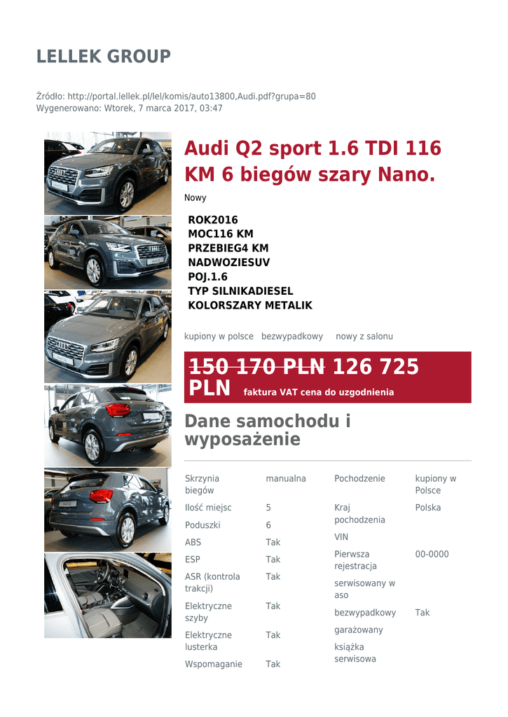 LELLEK GROUP Źródło: http://portal.lellek.pl/lel/komis/auto13800,Audi.pdf?grupa=80 Wygenerowano: Wtorek, 7 marca 2017, 03:47 Audi Q2 sport 1.6 TDI 116 KM 6 biegów szary Nano. Nowy ROK2016 MOC116 KM PRZEBIEG4 KM NADWOZIESUV POJ.1.6 TYP SILNIKADIESEL KOLORSZARY METALIK kupiony w polsce bezwypadkowy nowy z salonu 150 170 PLN 126 725 PLN faktura VAT cena do uzgodnienia Dane samochodu i wyposażenie Skrzynia biegów manualna Pochodzenie kupiony w Polsce Ilość miejsc 5 Polska Poduszki 6 Kraj pochodzenia ABS Tak ESP Tak ASR (kontrola trakcji) Tak Elektryczne szyby Tak Elektryczne lusterka Tak Wspomaganie Tak VIN Pierwsza rejestracja 00-0000 serwisowany w aso bezwypadkowy garażowany książka serwisowa Tak kierownicy I właściciel Komputer Tak Radioodtwarza cz Tak Alarm Tak homologacja Immobilizer Tak stan idealny Centralny zamek Tak właściciel niepalący Nawigacja satelitarna Tak Światła przeciwmgieln e Tak Czujnik deszczu Tak Kierownica wielofunkcyjna Tak Podgrzewane fotele Tak Bluetooth Tak System Start-Stop Tak Światła LED Tak Alufelgi 17 Miejsce postoju AUDI LELLEK Sławice k/Opola kupiony w salonie tunning Opis dodatkowy Audi Q2 sport 1.6 TDI 116 KM 6 biegów Cena katalogowa 150 170 zł brutto Rata miesięczna netto Audi Perfect Lease 1 326 PLN Opłata wstępna netto 10 % Opłata wstępna brutto - kwota 15 017 PLN Okres finansowania 36 m-cy Limit przebiegu 30 000 km / rok Dostępna oferta z wpłatą własną od 0% do 30% szary Nano metalik Wnętrze : czarne Siedzenia : czarne Szew: szary rock Boki siedzeń: czarne Deska rozdzielcza : czarna Wykładzina : czarna Podsufitka : tytanowo szara Handlowiec Maciej Stenzel +48 77 400 70 40 zapytaj mobile +48 783 001 002 Charakterystyka spalania cykl miejski 4.9 l/100km cykl pozamiejski 4.1 l/100km cykl mieszany 4.4 l/100km emisja CO2 114 g/km Gwarancja Gwarancja dostępna Ubezpieczenie Ubezpieczenie dostępne Pakiet stylistyczny S line Exterieur - Dyfuzor w kolorze platynowo-szarym - Osłona chłodnicy w kolorze platynowo-szarym - Logo S line na przednich błotnikach, - Chromowane końcówki układu wydechowego Reflektory w technologii LED (Kierunkowskazy dynamiczne z tyłu) Regulacja podparcia odcinka lędźwiowego kręgosłupa dla foteli przednich, elektryczna Side blade w kolorze nadwozia System nawigacji z kartą SD - 7 calowy kolorowy wyświetlacz o wysokiej rozdzielczości, - Złącze USB - 8 głośników pasywnych Tylna kanapa składana, dzielona 40:20:40 Usługi Audi connect - licencja na 3 lata Złącze USB I AUX-IN 2016165601 Nasi doradcy są do Państwa dyspozycji: Kredyt Kredyt Aplikacje dekoracyjne z matowego aluminium Asystent podjazdu Audi parking system plus z selektywnymi informacjami Audi phone box Autoalarm fabryczny Czujnik zmierzchowy świateł z czujnikiem deszczu Kierownica 3-ramienna, wielofunkcyjna, obszyta skórą Klimatyzacja automatyczna Komputer pokładowy z kolorowym wyświetlaczem Obręcze kół ze stopu metali lekkich 7Jx17, 5-ramienne z oponami 215/55 R17 Ogrzewanie foteli przednich Pakiet dla palących Pakiet dodatkowego oświetlenia wnętrza w technice LED Pakiet optyczny wnętrza w tonacji aluminium dostępny Maciej Stenzel GSM: +48 783 001 002 Wojciech Sowa GSM: +48 601 545 492 Niniejsze ogłoszenie nie stanowi oferty w myśl art. 66 § 1 Kodeksu Cywilnego, a jedynie zaproszenie do zawarcia umowy. Jednocześnie informujemy, iż ogłoszenie ma na celu przedstawienie Państwu szerokiej gamy samochodów znajdujących się w naszej ofercie (dostępnych na magazynie). Nota prawna Informacja nie stanowi oferty w rozumieniu art. 66 Kodeksu Cywilnego. Podane dane mają charakter wyłącznie informacyjny. Pełna informacja dostępna jest u handlowca. Sprzedający nie odpowiada za ewentualne błędy lub nieaktualność ogłoszenia. Zeskanuj kod, aby zobaczyć ofertę online