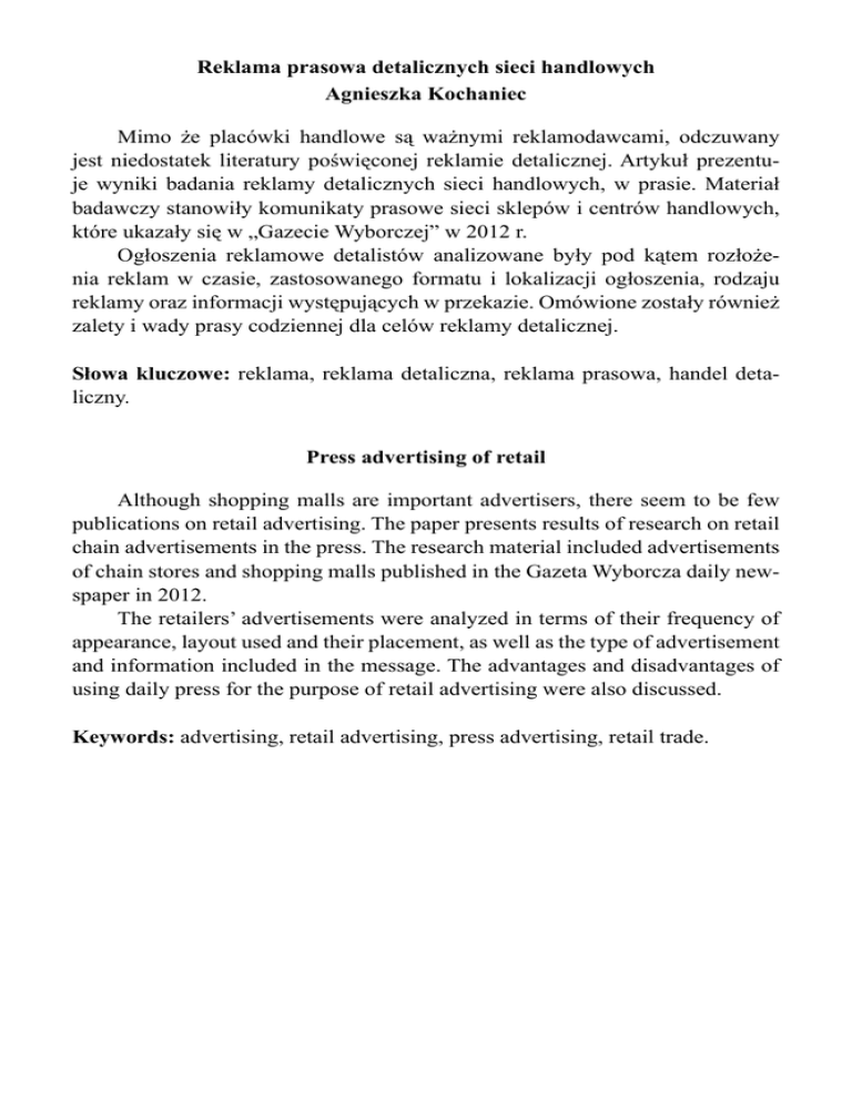 Reklama prasowa detalicznych sieci handlowych Agnieszka Kochaniec Mimo że placówki handlowe są ważnymi reklamodawcami, odczuwany jest niedostatek literatury poświęconej reklamie detalicznej. Artykuł prezentuje wyniki badania reklamy detalicznych sieci handlowych, w prasie. Materiał badawczy stanowiły komunikaty prasowe sieci sklepów i centrów handlowych, które ukazały się w „Gazecie Wyborczej” w 2012 r. Ogłoszenia reklamowe detalistów analizowane były pod kątem rozłożenia reklam w czasie, zastosowanego formatu i lokalizacji ogłoszenia, rodzaju reklamy oraz informacji występujących w przekazie. Omówione zostały również zalety i wady prasy codziennej dla celów reklamy detalicznej. Słowa kluczowe: reklama, reklama detaliczna, reklama prasowa, handel detaliczny. Press advertising of retail Although shopping malls are important advertisers, there seem to be few publications on retail advertising. The paper presents results of research on retail chain advertisements in the press. The research material included advertisements of chain stores and shopping malls published in the Gazeta Wyborcza daily newspaper in 2012. The retailers’ advertisements were analyzed in terms of their frequency of appearance, layout used and their placement, as well as the type of advertisement and information included in the message. The advantages and disadvantages of using daily press for the purpose of retail advertising were also discussed. Keywords: advertising, retail advertising, press advertising, retail trade.