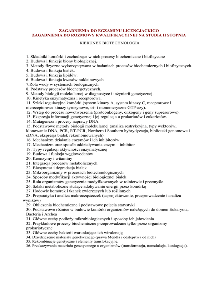 ZAGADNIENIA DO EGZAMINU LICENCJACKIGO ZAGADNIENIA DO ROZMOWY KWALIFIKACYJNEJ NA STUDIA II STOPNIA KIERUNEK BIOTECHNOLOGIA 1. Składniki komórki i zachodzące w nich procesy biochemiczne i biofizyczne 2. Budowa i funkcje błony biologicznej. 3. Metody fizyczne wykorzystywana w badaniach procesów biochemicznych i biofizycznych. 4. Budowa i funkcja białek. 5. Budowa i funkcja lipidów. 6. Budowa i funkcja kwasów nukleinowych 7.Rola wody w systemach biologicznych 8. Podstawy procesów bioenergetycznych. 9. Metody biologii molekularnej w diagnostyce i inżynierii genetycznej. 10. Kinetyka enzymatyczna i receptorowa. 11. Szlaki regulacyjne komórki (system kinazy A, system kinazy C, receptorowe i niereceptorowe kinazy tyrozynowe, tri- i monomeryczne GTP-azy). 12. Wstęp do procesu nowotworzenia (protoonkogeny, onkogeny i geny supresorowe). 13. Ekspresja informacji genetycznej i jej regulacja u prokariotów i eukariotów. 14. Mutageneza i procesy naprawy DNA. 15. Podstawowe metody biologii molekularnej (analiza restrykcyjna, typy wektorów, klonowanie DNA, PCR, RT-PCR, Northern i Southern hybrydyzacja, biblioteki genomowe i cDNA, ekspresja białek rekombinowanych). 16. Mechanizm działania enzymów i ich inhibitorów. 17. Mechanizm oraz sposób oddziaływania enzym – inhibitor 18. Typy regulacji aktywności enzymatycznej 19. Budowa i funkcja węglowodanów 20. Koenzymy i witaminy 21. Integracja procesów metabolicznych 22. Biosynteza i degradacja białek 23. Mikroorganizmy w procesach biotechnologicznych 24. Sposoby modyfikacji aktywności biologicznej białek 25. Rola organizmów genetycznie modyfikowanych w rolnictwie i przemyśle 26. Szlaki metaboliczne służące zdobywaniu energii przez komórkę 27. Hodowle komórek i tkanek zwierzęcych lub roślinnych 28. Preparatyka i analiza makrocząsteczek (zaprojektowanie, przeprowadzenie i analiza wyników) 29. Obliczenia biochemiczne i podstawowe pojęcia statystyki 30. Podstawowe różnice w budowie komórki organizmów należących do domen Eukaryota, Bacteria i Archea 31. Główne cechy podłoży mikrobiologicznych i sposoby ich jałowienia 32. Przykładowe procesy biochemiczne przeprowadzane tylko przez organizmy prokariotyczne 33. Główne cechy bakterii warunkujące ich wirulencję 34. Dziedziczenie materiału genetycznego (prawa Mendla i odstępstwa od nich) 35. Rekombinacje genetyczne i elementy translokacyjne. 36. Przekazywania materiału genetycznego u organizmów (transformacja, transdukcja, koniugacja).