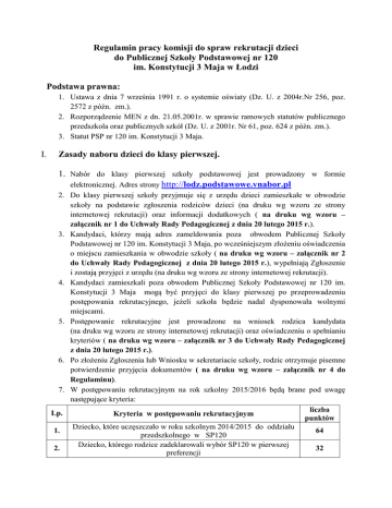 Regulamin pracy komisji do spraw rekrutacji dzieci do Publicznej Szkoły Podstawowej nr 120 im. Konstytucji 3 Maja w Łodzi Podstawa prawna: 1. Ustawa z dnia 7 września 1991 r. o systemie oświaty (Dz. U. z 2004r.Nr 256, poz. 2572 z późn. zm.). 2. Rozporządzenie MEN z dn. 21.05.2001r. w sprawie ramowych statutów publicznego przedszkola oraz publicznych szkół (Dz. U. z 2001r. Nr 61, poz. 624 z późn. zm.). 3. Statut PSP nr 120 im. Konstytucji 3 Maja. I. Zasady naboru dzieci do klasy pierwszej. 1. Nabór do klasy pierwszej szkoły podstawowej jest prowadzony w formie elektronicznej. Adres strony http://lodz.podstawowe.vnabor.pl 2. Do klasy pierwszej szkoły przyjmuje się z urzędu dzieci zamieszkałe w obwodzie szkoły na podstawie zgłoszenia rodziców dzieci (na druku wg wzoru ze strony internetowej rekrutacji) oraz informacji dodatkowych ( na druku wg wzoru – załącznik nr 1 do Uchwały Rady Pedagogicznej z dnia 20 lutego 2015 r.). 3. Kandydaci, którzy mają adres zameldowania poza obwodem Publicznej Szkoły Podstawowej nr 120 im. Konstytucji 3 Maja, po wcześniejszym złożeniu oświadczenia o miejscu zamieszkania w obwodzie szkoły ( na druku wg wzoru – załącznik nr 2 do Uchwały Rady Pedagogicznej z dnia 20 lutego 2015 r.), wypełniają Zgłoszenie i zostają przyjęci z urzędu (na druku wg wzoru ze strony internetowej rekrutacji). 4. Kandydaci zamieszkali poza obwodem Publicznej Szkoły Podstawowej nr 120 im. Konstytucji 3 Maja mogą być przyjęci do klasy pierwszej po przeprowadzeniu postępowania rekrutacyjnego, jeżeli szkoła będzie nadal dysponowała wolnymi miejscami. 5. Postępowanie rekrutacyjne jest prowadzone na wniosek rodzica kandydata (na druku wg wzoru ze strony internetowej rekrutacji) oraz oświadczeniu o spełnianiu kryteriów ( na druku wg wzoru – załącznik nr 3 do Uchwały Rady Pedagogicznej z dnia 20 lutego 2015 r.). 6. Po złożeniu Zgłoszenia lub Wniosku w sekretariacie szkoły, rodzic otrzymuje pisemne potwierdzenie przyjęcia dokumentów ( na druku wg wzoru – załącznik nr 4 do Regulaminu). 7. W postępowaniu rekrutacyjnym na rok szkolny 2015/2016 będą brane pod uwagę następujące kryteria: liczba Lp. Kryteria w postępowaniu rekrutacyjnym punktów Dziecko, które uczęszczało w roku szkolnym 2014/2015 do oddziału 1. 64 przedszkolnego w SP120 Dziecko, którego rodzice zadeklarowali wybór SP120 w pierwszej 2. 32 preferencji 3. 4. 5. Dziecko, które ma rodzeństwo w SP120 lub którego rodzeństwo uczęszcza do pobliskiego przedszkola Dziecko, które uczęszczało do pobliskiego przedszkola lub do przedszkola , które ze szkołą aktywnie współpracuje Dziecko, którego rodzice pracują w okolicy szkoły lub rodzice są absolwentami SP120 lub jedno z rodziców jest pracownikiem oświaty 16 8 4 8. Punkty ulegają sumowaniu. W pierwszej kolejności przyjmowani są kandydaci od najwyższej liczby punktów aż do wyczerpania wolnych miejsc. W przypadku, gdy kandydaci otrzymają równorzędną liczbę punktów i jest więcej kandydatów niż wolnych miejsc w szkole, o przyjęciu do Publicznej Szkoły Podstawowej nr 120 im. Konstytucji 3 Maja, decyduje losowanie przeprowadzone przez komisję ds. rekrutacji. II. Terminy postępowania rekrutacyjnego. 1. 02. 03. 2015 r. – 31. 03. 2015 r. – zapoznanie z ofertą szkoły oraz elektroniczne wypełnianie i dostarczenie do sekretariatu szkoły zgłoszenia lub wniosku oraz dokumentów potwierdzających spełnianie kryteriów określonych przez szkołę. 2. 20. 04. 2015 r. (do godziny 15:00) – wywieszenie przez szkołę list kandydatów zakwalifikowanych i niezakwalifikowanych. 3. 21. 04. 2015 r. – 23. 04. 2015 r. (do godz. 15:00) – potwierdzenie przez rodziców woli podjęcia przez dziecko nauki w szkole (na druku wg wzoru – załącznik nr 2 do Regulaminu) i ewentualne dostarczenie innych dokumentów wymaganych przez szkołę. 4. 24. 04. 2015r. (do godz. 15:00) – podanie do publicznej wiadomości list przyjętych i nieprzyjętych. 5. 27. 04. 2015 r. – 31. 08. 2015 r. – przeprowadzenie rekrutacji uzupełniającej (jej etapy są takie same jak w postępowaniu rekrutacyjnym). III. Zadania komisji rekrutacyjnej. 1. Postępowanie rekrutacyjne do szkoły przeprowadza komisja rekrutacyjna powołana przez Dyrektora Szkoły w oparciu o zarządzenie. 2. Do zadań komisji należy: a) rozpatrzenie wniosków rodziców kandydata, ustalenie wyników postępowania rekrutacyjnego i podanie do publicznej wiadomości listy kandydatów zakwalifikowanych i kandydatów niezakwalifikowanych ( na druku wg wzoru- załącznik nr 1 do Regulaminu), b) ustalenie i podanie do publicznej wiadomości listy kandydatów przyjętych i kandydatów nieprzyjętych (na druku wg wzoru- załącznik nr 3 do Regulaminu), c) sporządzenie protokołu z posiedzenia komisji, d) sporządzenie uzasadnienia odmowy przyjęcia kandydata. 3. Komisja rekrutacyjna przyjmuje kandydata do szkoły, jeżeli w wyniku postępowania rekrutacyjnego kandydat został zakwalifikowany oraz złożył wymagane dokumenty. 4. Komisja rekrutacyjna ma prawo do weryfikacji treści złożonych przez rodziców zgłoszeń do szkoły, wniosków o przyjęcie do szkoły oraz oświadczeń o spełnieniu kryteriów naboru dla uczniów spoza obwodu szkoły. 5. Listy, o których mowa w punkcie 2a i 2b, podaje się do publicznej wiadomości poprzez umieszczenie w widocznym miejscu w siedzibie szkoły. 6. Listy zawierają imiona i nazwiska kandydatów uszeregowane w kolejności alfabetycznej oraz najniższą liczbę punktów, która uprawnia do przyjęcia do szkoły. 7. Dzień podania do publicznej wiadomości listy kandydatów przyjętych i nieprzyjętych do szkoły jest określony w formie adnotacji umieszczonej na tej liście, opatrzonej podpisem przewodniczącego komisji rekrutacyjnej. IV. Procedury odwoławcze. 1. W terminie 7 dni od podania do publicznej wiadomości listy kandydatów przyjętych i kandydatów nieprzyjętych, rodzic może wystąpić do ko