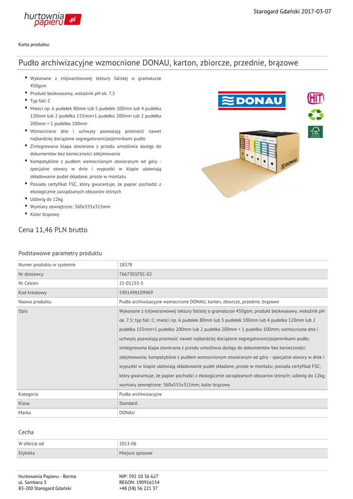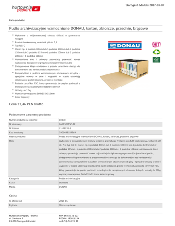 Starogard Gdański 2017-03-07 Karta produktu: Pudło archiwizacyjne wzmocnione DONAU, karton, zbiorcze, przednie, brązowe Wykonane z trójwarstwowej tektury falistej o gramaturze 450gsm Produkt bezkwasowy, wskaźnik pH ok. 7,5 Typ fali: C Mieści np. 6 pudełek 80mm lub 5 pudełek 100mm lub 4 pudełka 120mm lub 2 pudełka 155mm+1 pudełko 200mm lub 2 pudełka 200mm + 1 pudełko 100mm Wzmocnione dno i uchwyty pozwalają przenosić nawet najbardziej dociążone segregatorami/pojemnikami pudło Zintegrowana klapa otwierana z przodu umożliwia dostęp do dokumentów bez konieczności zdejmowania Kompatybilne z pudłem wzmocnionym otwieranym od góry specjalne otwory w dnie i wypustki w klapie ułatwiają składowanie pudeł składane, proste w montażu Posiada certyfikat FSC, który gwarantuje, że papier pochodzi z ekologicznie zarządzanych obszarów leśnych Udźwig do 12kg Wymiary zewnętrzne: 360x555x315mm Kolor brązowy Cena 11,46 PLN brutto Podstawowe parametry produktu Numer produktu w systemie 18378 Nr dostawcy 7667301FSC-02 Nr Celcen 21-01235-5 Kod kreskowy 5901498109969 Nazwa produktu Pudło archiwizacyjne wzmocnione DONAU, karton, zbiorcze, przednie, brązowe Opis Wykonane z trójwarstwowej tektury falistej o gramaturze 450gsm; produkt bezkwasowy, wskaźnik pH ok. 7,5; typ fali: C; mieści np. 6 pudełek 80mm lub 5 pudełek 100mm lub 4 pudełka 120mm lub 2 pudełka 155mm+1 pudełko 200mm lub 2 pudełka 200mm + 1 pudełko 100mm; wzmocnione dno i uchwyty pozwalają przenosić nawet najbardziej dociążone segregatorami/pojemnikami pudło; zintegrowana klapa otwierana z przodu umożliwia dostęp do dokumentów bez konieczności zdejmowania; kompatybilne z pudłem wzmocnionym otwieranym od góry - specjalne otwory w dnie i wypustki w klapie ułatwiają składowanie pudeł składane, proste w montażu; posiada certyfikat FSC, który gwarantuje, że papier pochodzi z ekologicznie zarządzanych obszarów leśnych; udźwig do 12kg; wymiary zewnętrzne: 360x555x315mm; kolor brązowy Kategoria Pudła archiwizacyjne Klasa Standard Marka DONAU Cecha W ofercie od 2013-06 Etykieta Miejsce opisowe Hurtowania Papieru - Borma ul. Sambora 3 83-200 Starogard Gdański NIP: 592 10 36 627 REGON: 190916154 +48 (58) 56 221 37 Starogard Gdański 2017-03-07 Karta katalogowa produktu cd. Pudło archiwizacyjne wzmocnione DONAU, karton, zbiorcze, przednie, brązowe Typ Zbiorcze Rodzaj Wzmocniony Produkt Pojemnik Materiał Tektura Wymiary Format B.d. Szerokość (mm) 555 Wymiary (mm) 555x360x315 Gramatura (g/m2) 450 Ilość Ilość kartek B.d. Wspólny słownik zamówień CPV 30193700-5 Pudełko do przechowywania dokumentów Certyfikaty Hit Hit Nowy produkt w ofercie Standard Kolor Kolor Brązowy Pozostałe zdjęcia produktu Serdecznie zapraszamy do współpracy Hurtowania Papieru - Borma zespół. Hurtowania Papieru - Borma ul. Sambora 3 83-200 Starogard Gdański NIP: 592 10 36 627 REGON: 190916154 +48 (58) 56 221 37