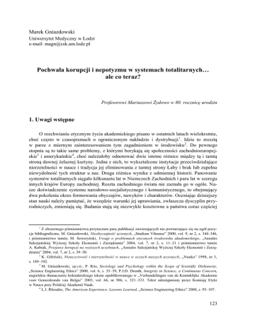 Marek Gniazdowski Uniwersytet Medyczny w Łodzi e-mail: [email protected] Pochwała korupcji i nepotyzmu w systemach totalitarnych… ale co teraz? Profesorowi Mariuszowi Żydowo w 80. rocznicę urodzin 1. Uwagi wstępne O rozchwianiu etycznym życia akademickiego pisano w ostatnich latach wielokrotnie, choć często w czasopismach o ograniczonym nakładzie i dystrybucji 1. Idzie to zresztą w parze z miernym zainteresowaniem tym zagadnieniem w środowisku 2. Do pewnego stopnia są to takie same problemy, z którymi borykają się społeczności zachodnioeuropejskie3 i amerykańskie4, choć należałoby odnotować dwie istotne różnice między tą i tamtą stroną dawnej żelaznej kurtyny. Jedna z nich, to wykształcone instytucje przeciwdziałające nierzetelności w nauce i tradycja jej eliminowania z tamtej strony Łaby i brak lub zupełna niewydolność tych struktur u nas. Druga różnica wynika z odmiennej historii. Panowanie systemów totalitarnych sięgało kilkunastu lat w Niemczech Zachodnich i paru lat w szeregu innych krajów Europy zachodniej. Reszta zachodniego świata nie zaznała go w ogóle. Nasze doświadczenie systemu narodowo-socjalistycznego i komunistycznego, to obejmujący dwa pokolenia okres formowania obyczajów, nawyków i charakterów. Oceniając dzisiejszy stan nauki należy pamiętać, że wszędzie warunki jej uprawiania, zwłaszcza dyscyplin przyrodniczych, zmieniają się. Badania stają się niezwykle kosztowne a państwa coraz częściej Z obszernego piśmiennictwa przytaczam parę publikacji zawierających nie powtarzające się na ogół pozycje bibliograficzne, M. Gniazdowski, Nieobyczajność uczonych, „Studium Vilnense” 2000, vol. 9, nr 2, s. 344–346, i piśmiennictwo tamże, M. Seweryński, Uwagi o problemach etycznych środowiska akademickiego, „Annales Salezjańskiej Wyższej Szkoły Ekonomii i Zarządzania” 2004, vol. 7, nr 2, s. 11–21 i piśmiennictwo tamże A. Kubiak, Przejawy korupcji na wyższych uczelniach, „Annales Salezjańskej Wyższej Szkoły Ekonomii i Zarządzania” 2004, vol. 7, nr 2, s. 39–50. 2 K. Gibiński, Nieuczciwość i nierzetelność w nauce w oczach naszych uczonych , „Nauka” 1998, nr 3, s. 189–192. 3 M. Gniazdowski, op.cit., P. Riis, Sociology and Psychology within the Scope of Scientific Dishonesty, „Science Engineering Ethics” 2000, vol. 6, s. 35–39, P.J.D. Drenth, Integrity in Science, a Continuous Concern, angielskie tłumaczenie holenderskiego tekstu opublikowanego w „Verhandelingen van de Koninklijke Akademie voor Geneeskunde van Belgie” 2003, vol. 66, nr 506, s. 321–333. Tekst udostępniony przez Komisję Etyki w Nauce przy Polskiej Akademii Nauk. 4 L.J. Rhoades, The American Experience. Lessons Learned, „Science Engineering Ethics” 2000, s. 95–107. 1 123 abdykują z funkcji mecenasa5. Poza tym instytucja naukowa nie jest wieżą z kości słoniowej i obyczaje w niej panujące po prostu nie mogą zasadniczo różnić się od tych, które panują w innych kręgach społeczeństwa 6. Niniejszy tekst jest próbą odpowiedzi na pytanie dlaczego korupcja i nepotyzm7, dwie plagi w sposób szczególny trapiące całe społeczeństwo, zaznaczają się równie trwale w życiu naukowym i zyskują sobie przyzwolenie. 2. Korupcja i nepotyzm w systemach totalitarnych Tytuł tego rozważania zawdzięczam niemieckiemu genetykowi i historykowi nauki nazistowskiej, Bennie Müller-Hillowi. We wstrząsającym raporcie8, Stanisław Lem nazwał tę książkę jedną z najbardziej przerażających, relacjonuje on jak niektórzy Niemcy pochodzenia niearyjskiego usiłowali umknąć spod gilotyny ustaw norymberskich. Szansą dla ludzi pochodzących z rodzin, w których tylko jedno z rodziców, ojciec najczęściej, był pochodzenia żydowskiego było wykazanie, że ów ojciec metrykalny nie jest ojcem biologicznym. Taki przypadek podlegał zwykłej procedurze sądowej zaprzeczenia ojcostwa, w której podstawowym dowodem były badania hematologiczne i antropologiczne. Profesor Wolfgang Abel wraz ze swoim mistrzem, profesorem Eugenem Fischerem wykonali około 800 takich ekspertyz nie pobierając za nie honorariów, odstępując nawet od obciążania najuboższych kosztami własnymi niezbędnych zdjęć i innych materiałów. Po latach wspominał, że próbowano na nich wywierać naciski lub korumpować. Utkwił mu w pamięci przypadek przemysłowca, który uczynił mu propozycję korupcyjną, popartą listem samego Bormanna9. W pozostałych przypadkach Abel także wyrokował zgodnie ze swą najlepszą wiedzą. W odpowiedzi na naciski o większą wyrozumiałość, jak w owym liście Bormanna profesor Fischer stwierdził, że wyrozumiałość i miłosierdzie nie są kategoriami naukowymi, lecz politycznymi10. Łatwo sobie wyobrazić desperację i determinację ludzi, którzy próbowali ratować swoją egzystencję lub egzystencję bliskich. Matka feldmarszałka Erhardta Milcha w 1933 r. poszła na policję i zeznała, że jej sześcioro dzieci pochodzi z kazirodczego stosunku z jej aryjskim wujem, a nie z jej żydowskim mężem. Milch do końca wojny sprawował jedną z najwyższych funkcji w III Rzeszy. Za jego plecami nadal szeptano, że i matka jest Żydówką11. Ale liczyło się zdanie Göringa, który przeciął wątpliwości: „O tym kto jest Żydem decyduję ja”12. Sumienny i nieprzekupny profesor Abel nie był jedynym rozmówcą Müller-Hilla: Pytałem wszystkich żyjących jeszcze niemieckich genetyków człowieka, czy przeprowadzili J. Ziman, Is Science Loosing its Objectivity? „Science” 1996, vol. 382, s. 751–754. P. Riis, op.cit. 7 M. Seweryński, op.cit., A. Kubiak, op.cit., P.J.D. Drenth, op.cit. 8 B. Müller-Hill, Murderous Science. Elimination by Scientific Selection of Jews, Gypsies and Others, Germany 1933–1945, Oxford University Press, Oxford 1988. 9 Tamże, s. 78, 126–138 – w tym przypadku magnat niemieckiego przemysłu papierniczego wyglądał w opinii prof. Abla jak