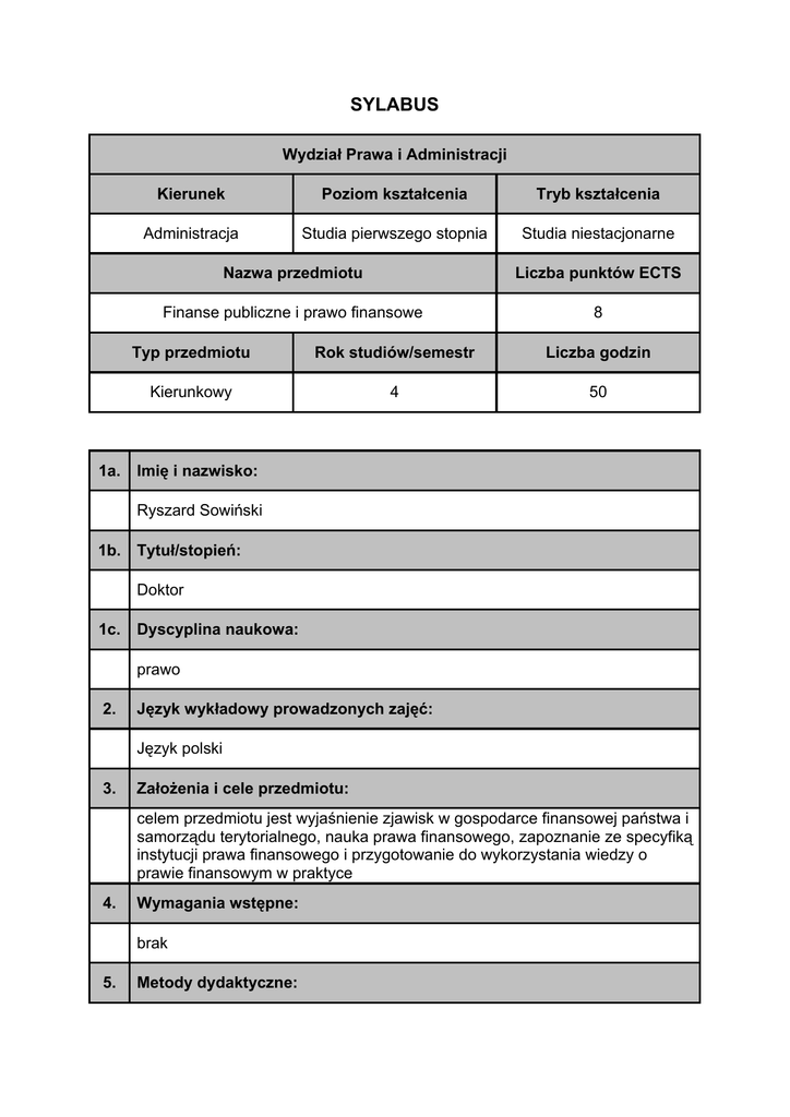 SYLABUS Wydział Prawa i Administracji 1a. Kierunek Poziom kształcenia Tryb kształcenia Administracja Studia pierwszego stopnia Studia niestacjonarne Nazwa przedmiotu Liczba punktów ECTS Finanse publiczne i prawo finansowe 8 Typ przedmiotu Rok studiów/semestr Liczba godzin Kierunkowy 4 50 Imię i nazwisko: Ryszard Sowiński 1b. Tytuł/stopień: Doktor 1c. Dyscyplina naukowa: prawo 2. Język wykładowy prowadzonych zajęć: Język polski 3. Założenia i cele przedmiotu: celem przedmiotu jest wyjaśnienie zjawisk w gospodarce finansowej państwa i samorządu terytorialnego, nauka prawa finansowego, zapoznanie ze specyfiką instytucji prawa finansowego i przygotowanie do wykorzystania wiedzy o prawie finansowym w praktyce 4. Wymagania wstępne: brak 5. Metody dydaktyczne: wykład 6. Forma i warunki zaliczania przedmiotu: egzamin 7. Treści kształcenia (programowe): 1. Zagadnienia ogólne finansów publicznych i prawa finansowego: pojęcie finansów publicznych, funkcje finansów publicznych ( funkcja redystrybucyjna, alokacyjna i stabilizacyjna), pojęcie i istota prawa finansowego, źródła prawa finansowego, problemy legislacji finansowej, budowa normy prawno-finansowej, finanse publiczne a Konstytucja, wykładnia przepisów prawa finansowego, system administracji finansów publicznych, kontrola finansów publicznych, polityka finansowa. 2. Podstawy prawa budżetowego i gospodarki finansowej państwa: pojęcie, geneza i funkcje budżetu, zasady budżetowe, jednostki organizacyjne sektora finansów publicznych, procedura budżetowa, dochody budżetowe państwa ( pojęcie, funkcje i rodzaje), wydatki budżetowe państwa ( zakres i rodzaje wydatków, zjawisko stałego wzrostu wydatków, formy prawne i zasady dokonywania wydatków, struktura wydatków, racjonalizacja wydatków publicznych), dług publiczny i deficyt budżetowy oraz źródła ich finansowania, poręczenia i gwarancje w gospodarce budżetowej, odpowiedzialność za naruszenie dyscypliny finansów publicznych. 3. Podstawy gospodarki finansowej samorządu terytorialnego: gospodarka finansowa gminy, gospodarka finansowa powiatu, gospodarka finansowa województwa, kontrola finansowa i nadzór nad gospodarką finansową samorządu terytorialnego, finansowanie rozwoju regionalnego ze środków Unii Europejskiej. 4. Zarys teorii podatku: ewolucja koncepcji podatkowych ( cechy wspólne koncepcji podatkowych, kameraliści, fizjokraci, myśl podatkowa A. Smitha i D. Ricardo, koncepcja równej ofiary finansowej, myśl podatkowa A. Wagnera, myśl podatkowa F. Neumarka, koncepcja ekwiwalencji a koncepcja zdolności płatniczej, współczesne problemy teorii opodatkowania, pojęcie i konstrukcja prawna podatku , źródła prawa podatkowego, prawotwórstwo sądowe, wykładnia prawa podatkowego, związki prawa podatkowego z innymi gałęziami prawa, sankcje w prawie podatkowym, obejście prawa podatkowego, system podatkowy, funkcje systemu podatkowego , podstawy wobec opodatkowania. 5. Część ogólna polskiego prawa podatkowego: ewolucja regulacji podatkowych w Polsce, zagadnienia ogólne Ordynacji podatkowej, zobowiązanie podatkowe w świetle Ordynacji podatkowej ( obowiązek a zobowiązanie podatkowe, powstawanie, i wygasanie zobowiązań podatkowych, odpowiedzialność za zobowiązania podatkowe, następstwo prawne, odpowiedzialność osób trzecich, zabezpieczenie wykonania zobowiązań podatkowych), postępowanie podatkowe w świetle Ordynacji podatkowej ( ogólne postępowanie administracyjne a postępowanie podatkowe, zasady ogólne i postanowienia ogólne postępowania podatkowego, postępowanie podatkowe przed organem I instancji, zwyczajne i nadzwyczajne środki zaskarżenia), przymusowe wykonanie zobowiązań podatkowych, sądowa kontrola orzeczeń w sprawach podatkowych przez sądy administracyjne, Europejski Trybunał Sprawiedliwości i jego znaczenie dla spraw podatkowych. 6. Część szczegółowa polskiego prawa podatkowego: podatek od towarów i usług, podatek akcyzowy, podatek od gier, podatek dochodowy od osób fizycznych, uproszczone formy opodatkowania dochodów osób fizycznych, podatek dochodowy od osób prawnych, podatek rolny, podatek od spadków i darowizn, podatek od nieruchomości, podatek od czynności cywilnoprawnych, podatek leśny, podatek od środków transportowych, podatek od posiadania psów, harmonizacja polskiego prawa podatkowego z prawem europejskim, umowy o unikaniu podwójnego opodatkowania, wzajemna pomoc administracyjna w sprawach podatkowych. 7. Podstawy prawa celnego: pojęcie i klasyfikacja ceł, etapy rozwoju prawa celnego w Polsce, międzynarodowe prawo celne, prawo celne Unii Europejskiej, organy celne. 8. Podstawy publicznego prawa bankowego: modele prawnoorganizacyjne bankowości, źródła prawa bankowego, Narodowy Bank Polski jako bank centralny, Bankowy Fundusz Gwarancyjny, nadzór państwa nad instytucjami finansowymi, system europejskiej bankowości centralnej. 9. Waluta i prawo walutowe: istota i funkcje pieniądza, ewolucja systemów pieniężnych, polski ustrój pieniężny, międzynarodowy system pieniężny, europejski system pieniężny. 10. Podstawy prawa dewizowego: podstawowe konstrukcje polskiego prawa dewizowego, europejskie prawo dewizowe. 8. Wykaz literatury podstawowej: 1. W. Wójtowicz, Zarys finansów publicznych i prawa finansowego, Wolters Kluwer, wyd. V, Warszawa 2008, (rozdziały I – V; XI – XII), 2. Andrzej Gomułowicz, Jerzy Małecki, Podatki i prawo podatkowe, LexisNexis, Wydanie IV, Warszawa 2008. 9. Wykaz literatury uzupełniającej: czasopisma: m.in. Przegląd Podatkowy, Monitor Podatkowy, Kwartalnik Prawa Podatkowego, Prawo i Podatki