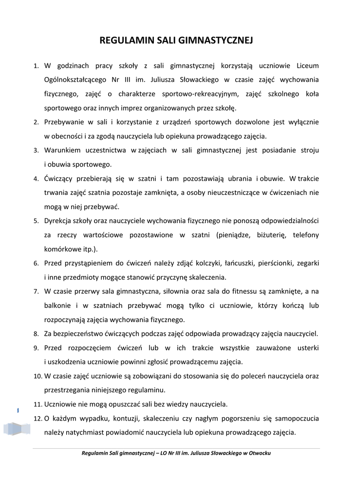 REGULAMIN SALI GIMNASTYCZNEJ 1. W godzinach pracy szkoły z sali gimnastycznej korzystają uczniowie Liceum Ogólnokształcącego Nr III im. Juliusza Słowackiego w czasie zajęć wychowania fizycznego, zajęć o charakterze sportowo-rekreacyjnym, zajęć szkolnego koła sportowego oraz innych imprez organizowanych przez szkołę. 2. Przebywanie w sali i korzystanie z urządzeń sportowych dozwolone jest wyłącznie w obecności i za zgodą nauczyciela lub opiekuna prowadzącego zajęcia. 3. Warunkiem uczestnictwa w zajęciach w sali gimnastycznej jest posiadanie stroju i obuwia sportowego. 4. Ćwiczący przebierają się w szatni i tam pozostawiają ubrania i obuwie. W trakcie trwania zajęć szatnia pozostaje zamknięta, a osoby nieuczestniczące w ćwiczeniach nie mogą w niej przebywać. 5. Dyrekcja szkoły oraz nauczyciele wychowania fizycznego nie ponoszą odpowiedzialności za rzeczy wartościowe pozostawione w szatni (pieniądze, biżuterię, telefony komórkowe itp.). 6. Przed przystąpieniem do ćwiczeń należy zdjąć kolczyki, łańcuszki, pierścionki, zegarki i inne przedmioty mogące stanowić przyczynę skaleczenia. 7. W czasie przerwy sala gimnastyczna, siłownia oraz sala do fitnessu są zamknięte, a na balkonie i w szatniach przebywać mogą tylko ci uczniowie, którzy kończą lub rozpoczynają zajęcia wychowania fizycznego. 8. Za bezpieczeństwo ćwiczących podczas zajęć odpowiada prowadzący zajęcia nauczyciel. 9. Przed rozpoczęciem ćwiczeń lub w ich trakcie wszystkie zauważone usterki i uszkodzenia uczniowie powinni zgłosić prowadzącemu zajęcia. 10. W czasie zajęć uczniowie są zobowiązani do stosowania się do poleceń nauczyciela oraz przestrzegania niniejszego regulaminu. 1 11. Uczniowie nie mogą opuszczać sali bez wiedzy nauczyciela. 12. O każdym wypadku, kontuzji, skaleczeniu czy nagłym pogorszeniu się samopoczucia należy natychmiast powiadomić nauczyciela lub opiekuna prowadzącego zajęcia. Regulamin Sali gimnastycznej – LO Nr III im. Juliusza Słowackiego w Otwocku 13. Sprzęt do ćwiczeń można rozstawiać tylko w obecności nauczyciela. 14. Uczeń zobowiązany jest dbać o powierzony mu sprzęt sportowy. Za szkody materialne wyrządzone w sali gimnastycznej przez ucznia i z jego winy ponoszą finansową odpowiedzialność jego rodzice lub prawni opiekunowie. 15. Za stan pomieszczeń w budynku sali gimnastycznej, sprzętu gimnastycznego i urządzeń znajdujących się na sali gimnastycznej są odpowiedzialni nauczyciele wychowania fizycznego. 16. Zabrania się wnoszenia do sali gimnastycznej toreb, plecaków, odzieży wierzchniej, przedmiotów niebezpiecznych, napojów, żywności, pomocy naukowych (zeszyty, książki, itp.) poza wodą w plastikowej, zakręcanej butelce. 17. Zabrania się dotykania i używania do innych celów niż jest to przeznaczone sprzętu przeciwpożarowego i informacyjnego (gaśnice, znaki informacyjne, instrukcje, itp.). 18. Po skorzystaniu z pomieszczeń kompleksu sportowego należy zostawić po sobie porządek. 19. W przypadku zaplanowania w sali gimnastycznej uroczystości szkolnej, zabawy, dyskoteki, wychowawcy bądź opiekunowie klas biorących udział w niej udział zobowiązani są do wyniesienia z sali wszystkich ruchomych sprzętów sportowych (kozioł, skocznia, skrzynia, materace, ławeczki itp.) oraz dopilnowania, by po zakończonej imprezie sala została uporządkowana (usunięta scenografia, krzesła, stoliki, itp.). 20. Zabrania się przypinania dekoracji do drabinek szkolnych ostrymi przyborami 21. Korzystanie ze ściany wspinaczkowej może odbywać się tylko w obecności operatora ściany i zgodnie z regulaminem korzystania ze sztucznej ścianki wspinaczkowej. 22. Korzystanie z kompleksu sportowego poza ustalonym w szkole planem zajęć możliwe jest tylko za zgodą Dyrektora Szkoły. 23. W 2 przypadku nieprzestrzegania regulaminu uczeń będzie ukarany z systemem nagród i kar przewidzianych w statucie szkoły. Regulamin obowiązuje od dnia 31 stycznia 2011 r. Otwock, 14 stycznia 2011 r. Regulamin Sali gimnastycznej – LO Nr III im. Juliusza Słowackiego w Otwocku zgodnie
