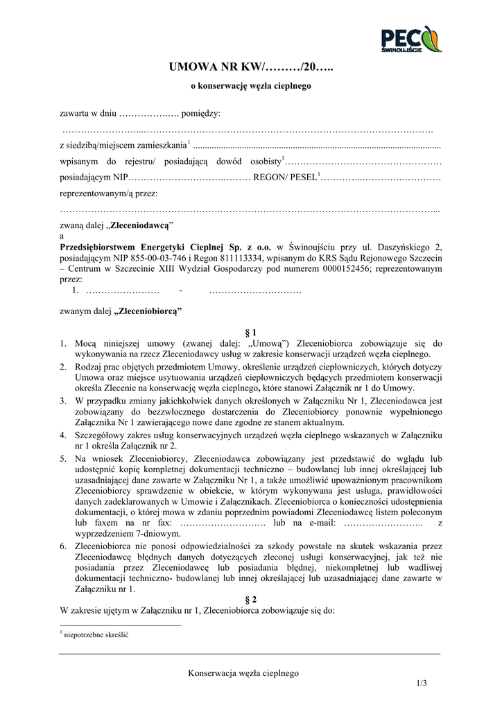 UMOWA NR KW/………/20….. o konserwację węzła cieplnego zawarta w dniu …………….…. pomiędzy: ……………………...…………………………………………………………………………………. z siedzibą/miejscem zamieszkania 1 ........................................................................................................... wpisanym do rejestru/ posiadającą dowód osobisty1…………………………………………… posiadającym NIP………………………….……… REGON/ PESEL1…………..………….…………. reprezentowanym/ą przez: …………………………………………….……………………………………………………………... zwaną dalej „Zleceniodawcą” a Przedsiębiorstwem Energetyki Cieplnej Sp. z o.o. w Świnoujściu przy ul. Daszyńskiego 2, posiadającym NIP 855-00-03-746 i Regon 811113334, wpisanym do KRS Sądu Rejonowego Szczecin – Centrum w Szczecinie XIII Wydział Gospodarczy pod numerem 0000152456; reprezentowanym przez: 1. …………………… ………………………… zwanym dalej „Zleceniobiorcą” §1 1. Mocą niniejszej umowy (zwanej dalej: „Umową”) Zleceniobiorca zobowiązuje się do wykonywania na rzecz Zleceniodawcy usług w zakresie konserwacji urządzeń węzła cieplnego. 2. Rodzaj prac objętych przedmiotem Umowy, określenie urządzeń ciepłowniczych, których dotyczy Umowa oraz miejsce usytuowania urządzeń ciepłowniczych będących przedmiotem konserwacji określa Zlecenie na konserwację węzła cieplnego, które stanowi Załącznik nr 1 do Umowy. 3. W przypadku zmiany jakichkolwiek danych określonych w Załączniku Nr 1, Zleceniodawca jest zobowiązany do bezzwłocznego dostarczenia do Zleceniobiorcy ponownie wypełnionego Załącznika Nr 1 zawierającego nowe dane zgodne ze stanem aktualnym. 4. Szczegółowy zakres usług konserwacyjnych urządzeń węzła cieplnego wskazanych w Załączniku nr 1 określa Załącznik nr 2. 5. Na wniosek Zleceniobiorcy, Zleceniodawca zobowiązany jest przedstawić do wglądu lub udostępnić kopię kompletnej dokumentacji techniczno – budowlanej lub innej określającej lub uzasadniającej dane zawarte w Załączniku Nr 1, a także umożliwić upoważnionym pracownikom Zleceniobiorcy sprawdzenie w obiekcie, w którym wykonywana jest usługa, prawidłowości danych zadeklarowanych w Umowie i Załącznikach. Zleceniobiorca o konieczności udostępnienia dokumentacji, o której mowa w zdaniu poprzednim powiadomi Zleceniodawcę listem poleconym lub faxem na nr fax: ………………………. lub na e-mail: …………………….. z wyprzedzeniem 7-dniowym. 6. Zleceniobiorca nie ponosi odpowiedzialności za szkody powstałe na skutek wskazania przez Zleceniodawcę błędnych danych dotyczących zleconej usługi konserwacyjnej, jak też nie posiadania przez Zleceniodawcę lub posiadania błędnej, niekompletnej lub wadliwej dokumentacji techniczno- budowlanej lub innej określającej lub uzasadniającej dane zawarte w Załączniku nr 1. §2 W zakresie ujętym w Załączniku nr 1, Zleceniobiorca zobowiązuje się do: 1 niepotrzebne skreślić Konserwacja węzła cieplnego 1/3 1. Wykonania prac wskazanych w Załączniku nr 2, na warunkach określonych w niniejszej umowie. 2. Świadczenia usług Pogotowia Ciepłowniczego PEC w stosunku do urządzeń objętych Załącznikiem nr 1, w tym do sprawdzania zasadności zgłoszeń dotyczących nieprawidłowości w funkcjonowaniu urządzeń oraz sprawdzania zasadności zgłaszanych przez Zleceniodawcę reklamacji dotyczących nieprawidłowości działania wskazanych urządzeń ciepłowniczych – w terminie 24 godzin od zgłoszenia. 3. Prowadzenia „Dziennika Konserwacyjnego” dla urządzeń ciepłowniczych, wskazanych w Załączniku nr 1. 4. Dokonywania przeglądów konserwacyjnych urządzeń ciepłowniczych wskazanych w Załączniku nr 1. Przeglądy konserwacyjne będą przeprowadzane nie rzadziej niż raz w miesiącu oraz na wezwanie Zleceniodawcy w przypadku zaistnienia uzasadnionej potrzeby. Każdy przegląd będzie wpisany do „Dziennika Konserwacyjnego”. 5. Zleceniobiorca nie odpowiada za skutki awarii bądź niedogrzewań lub jakiejkolwiek szkody Zleceniodawcy lub osób trzecich, nie związane z właściwym wykonaniem przez Zleceniobiorcę niniejszej umowy i nie będące następstwem wykonanych usług konserwacyjnych. 6. Wszelkie usterki i nieprawidłowości w pracy węzła, przekraczające zakres wynikający z Załącznika nr 2, Zleceniobiorca zgłosi niezwłocznie Zleceniodawcy w razie ich ujawnienia. W przypadku zaniechania zgłoszenia, pomimo zauważenia nieprawidłowości, Zleceniobiorca będzie ponosił odpowiedzialność za rzeczywistą szkodę Zleceniodawcy powstałą z tego tytułu. 7. Zleceniobiorca odpowiada tylko za kradzież, zniszczenie lub uszkodzenie urządzeń ciepłowniczych tylko w czasie wykonywania przez niego usług konserwacyjnych i wyłącznie, gdy wynikły one z jego winy. §3 1. Zleceniodawca zobowiązuje się zapewnić upoważnionym pracownikom Zleceniobiorcy dostęp do pomieszczenia technicznego celem wykonywania usług konserwacyjnych. W przypadku odmowy udostępnienia powyższego pomieszczenia Zleceniobiorca nie ponosi odpowiedzialności za występujące nieprawidłowości w działaniu urządzeń węzła cieplnego, jak też za niewykonanie umowy w tym zakresie. 2. Zleceniodawca oświadcza, iż wszelkie prace budowlane, murarskie, jak też wszelkie prace związane z usuwaniem przecieków lub zabezpieczeniem pomieszczeń i budynku będą wykonywane we własnym zakresie przez właściciela budynku. Zleceniobiorcy nie obciążają obowiązki w powyższym zakresie. §4 1. Za świadczone przez Zleceniobiorcę na podstawie niniejszej umowy usługi, Zleceniodawca zapłaci Zleceniobiorcy miesięczne wynagrodzenie ryczałtowe, zgodnie z Cennikiem usług zewnętrznych i opłat dodatkowych PEC zwanych dalej Cennikiem. 2. W