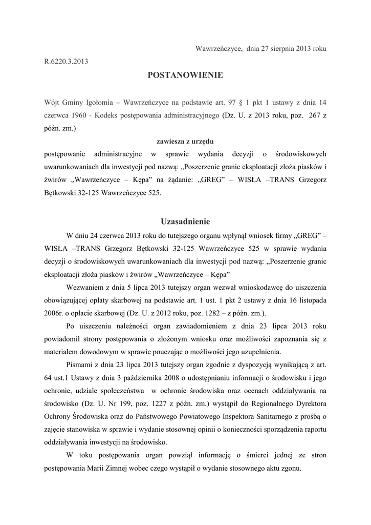 Wawrzeńczyce, dnia 27 sierpnia 2013 roku R.6220.3.2013 POSTANOWIENIE Wójt Gminy Igołomia – Wawrzeńczyce na podstawie art. 97 § 1 pkt 1 ustawy z dnia 14 czerwca 1960 - Kodeks postępowania administracyjnego (Dz. U. z 2013 roku, poz. 267 z późn. zm.) zawiesza z urzędu postępowanie administracyjne w sprawie wydania decyzji o środowiskowych uwarunkowaniach dla inwestycji pod nazwą: „Poszerzenie granic eksploatacji złoża piasków i żwirów „Wawrzeńczyce – Kępa” na żądanie: „GREG” – WISŁA –TRANS Grzegorz Bętkowski 32-125 Wawrzeńczyce 525. Uzasadnienie W dniu 24 czerwca 2013 roku do tutejszego organu wpłynął wniosek firmy „GREG” – WISŁA –TRANS Grzegorz Bętkowski 32-125 Wawrzeńczyce 525 w sprawie wydania decyzji o środowiskowych uwarunkowaniach dla inwestycji pod nazwą: „Poszerzenie granic eksploatacji złoża piasków i żwirów „Wawrzeńczyce – Kępa” Wezwaniem z dnia 5 lipca 2013 tutejszy organ wezwał wnioskodawcę do uiszczenia obowiązującej opłaty skarbowej na podstawie art. 1 ust. 1 pkt 2 ustawy z dnia 16 listopada 2006r. o opłacie skarbowej (Dz. U. z 2012 roku, poz. 1282 – z późn. zm.). Po uiszczeniu należności organ zawiadomieniem z dnia 23 lipca 2013 roku powiadomił strony postępowania o złożonym wniosku oraz możliwości zapoznania się z materiałem dowodowym w sprawie pouczając o możliwości jego uzupełnienia. Pismami z dnia 23 lipca 2013 tutejszy organ zgodnie z dyspozycją wynikającą z art. 64 ust.1 Ustawy z dnia 3 października 2008 o udostępnianiu informacji o środowisku i jego ochronie, udziale społeczeństwa w ochronie środowiska oraz ocenach oddziaływania na środowisko (Dz. U. Nr 199, poz. 1227 z późn. zm.) wystąpił do Regionalnego Dyrektora Ochrony Środowiska oraz do Państwowego Powiatowego Inspektora Sanitarnego z prośbą o zajęcie stanowiska w sprawie i wydanie stosownej opinii o konieczności sporządzenia raportu oddziaływania inwestycji na środowisko. W toku postępowania organ powziął informację o śmierci jednej ze stron postępowania Marii Zimnej wobec czego wystąpił o wydanie stosownego aktu zgonu. Zgodnie z art. 97 § 1 pkt 1 k.p.a organ administracji publicznej obligatoryjnie zawiesza postępowanie w razie śmierci strony lub jednej ze stron, jeżeli wezwanie spadkobierców zmarłej strony do udziału w postępowaniu nie jest możliwe i nie zachodzą okoliczności, o których mowa w art. 30 § 5, a postępowanie nie podlega umorzeniu jako bezprzedmiotowe (art. 105 k.p.a). Zatem zawieszenie postępowania na tej podstawie uzależnione jest od łącznego wystąpienia trzech przesłanek: 1) przesłanki, że śmierć strony miała miejsce po wszczęciu postępowania, w jego toku, 2) przesłanki powodującej niemożność wezwania do udziału w postępowaniu spadkobierców, 3) przesłanki, że śmierć strony nie czyni postępowania bezprzedmiotowym. Określona w art. 97 § 1 pkt 1 k.p.a niemożność wezwania do udziału w postępowaniu spadkobierców zmarłej strony będzie miała miejsce w przypadku, gdy spadkobiercy nie są ustaleni albo nie są znani organowi. Mając to na względzie wykazać należy, że w przypadku konieczności wykazania następstwa prawnego po zmarłej osobie w postępowaniu administracyjnym, następstwo to powinno być wykazane według przepisów prawa cywilnego, a więc w postępowaniu o stwierdzenie nabycia spadku lub w drodze notarialnego poświadczenia dziedziczenia. Ustalenia kręgu spadkobierców nie może bowiem dokonać samodzielnie organ administracji publicznej (tak Naczelny Sąd Administracyjny w wyroku z 16 stycznia 2002 r., I SA 1421/00, ONSA 2003, nr 3, poz. 64). Zgodnie z art. 1025 kodeksu cywilnego spadkobiercą jest osoba, która uzyskała stwierdzenie nabycia spadku prawomocnym postanowieniem sądu powszechnego bądź legitymuje się aktem poświadczenia dziedziczenia sporządzonym przez notariusza. Brak wskazanego orzeczenia sądu należy natomiast uznać za równoznaczny z niemożliwością wezwania spadkobierców do udziału w postępowaniu. W przypadku ujawnienia już w toku postępowania administracyjnego faktu, że jedna za stron zmarła jeszcze przed wszczęciem postępowania, czynności organu administracji uzależnione są od tego, czy dysponuje on wiedzą co do spadkobierców po zmarłej osobie: jeżeli organ wie, kto jest spadkobiercą, to powinien wezwać takiego spadkobiercę do udziału w postępowaniu, jeżeli zaś nie ma takiej wiedzy - postępowanie powinno być zawieszone na podstawie art. 97 § 1 pkt 1 k.p.a. do chwili ujawnienia spadkobierców. W analizowanej sprawie tutejszy organ nie dysponuje wiedzą kto wchodzi w krąg spadkobierców po zmarłej Marii Zimnej. Wykładnia art. 1025 k.c. wraz z art. 669 k.p.c. prowadzi do wniosku, że wnioskodawcą w postępowaniu w sprawie stwierdzenia nabycia spadku może być każda osoba, która może wchodzić w rachubę jako spadkobierca ustawowy bądź testamentowy oraz osoba, która ma możliwość uzyskania określonych uprawnień wynikających z otwarcia spadku (np. zapisobiorca). Tutejszy organ podzielając poglądy wyrażanie w wyrokach sądów administracyjnych, zgodnie z którymi tylko sądowe stwierdzenie nabycia spadku (aktu poświadczenia dziedziczenia) stanowi dowód ustanowienia spadkobierców po zmarłej osobie i dopóki takiego dowodu strona nie przedłoży, dopóty postępowanie winno być zawieszone (np. tak Wojewódzki Sąd Administracyjny w Bydgoszczy w wyroku z dnia 24 września 2008 r., sygn. akt II SA/Bd 510/08, opub. w LEX nr 560157; Wojewódzki Sąd Administracyjny w Warszawie w wyroku z dnia 5 marca 2012 r., sygn. akt IV SA/Wa 42/12, opub. w CBOSA). Wobec powyższego orzeczono jak w sentencji. Pouczenie Na niniejsze postanowienie przysługuje stronom prawo wniesienia zażalenia do Samorządowego Kolegium Odwoławczego z siedzibą w Krakowie ul. Juliusza Lea 10 w terminie 7 dni od daty otrzymania postanowienia, za pośrednictwem tutejszego o