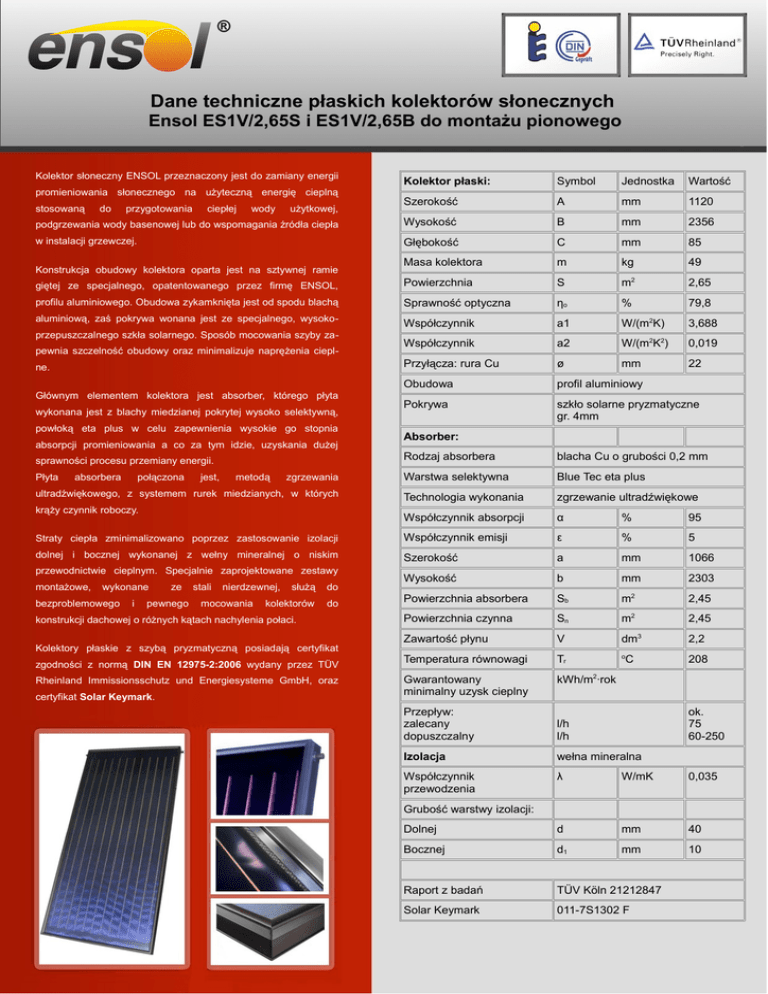 Dane techniczne płaskich kolektorów słonecznych Ensol ES1V/2,65S i ES1V/2,65B do montażu pionowego Kolektor słoneczny ENSOL przeznaczony jest do zamiany energii Kolektor płaski: Symbol Jednostka Wartość Szerokość A mm 1120 podgrzewania wody basenowej lub do wspomagania źródła ciepła Wysokość B mm 2356 w instalacji grzewczej. Głębokość C mm 85 Masa kolektora m kg 49 giętej ze specjalnego, opatentowanego przez firmę ENSOL, Powierzchnia S m 2,65 profilu aluminiowego. Obudowa zykamknięta jest od spodu blachą Sprawność optyczna ηo % aluminiową, zaś pokrywa wonana jest ze specjalnego, wysoko- Współczynnik a1 W/(m2K) 3,688 Współczynnik a2 W/(m K ) 0,019 Przyłącza: rura Cu ø mm 22 Obudowa profil aluminiowy Pokrywa szkło solarne pryzmatyczne gr. 4mm promieniowania słonecznego na użyteczną energię cieplną stosowaną do przygotowania ciepłej wody użytkowej, Konstrukcja obudowy kolektora oparta jest na sztywnej ramie przepuszczalnego szkła solarnego. Sposób mocowania szyby zapewnia szczelność obudowy oraz minimalizuje naprężenia cieplne. Głównym elementem kolektora jest absorber, którego płyta wykonana jest z blachy miedzianej pokrytej wysoko selektywną, powłoką eta plus w celu zapewnienia wysokie go stopnia absorpcji promieniowania a co za tym idzie, uzyskania dużej 2 79,8 2 2 Absorber: Rodzaj absorbera blacha Cu o grubości 0,2 mm Warstwa selektywna Blue Tec eta plus Technologia wykonania zgrzewanie ultradźwiękowe Współczynnik absorpcji α % 95 Straty ciepła zminimalizowano poprzez zastosowanie izolacji Współczynnik emisji ε % 5 dolnej i bocznej wykonanej z wełny mineralnej o niskim Szerokość a mm 1066 Wysokość b mm 2303 Powierzchnia absorbera Sb m 2 2,45 Powierzchnia czynna Sn m2 2,45 Zawartość płynu V dm3 2,2 Temperatura równowagi Tr o C 208 Gwarantowany minimalny uzysk cieplny kWh/m ∙rok sprawności procesu przemiany energii. Płyta absorbera połączona jest, metodą zgrzewania ultradźwiękowego, z systemem rurek miedzianych, w których krąży czynnik roboczy. przewodnictwie cieplnym. Specjalnie zaprojektowane zestawy montażowe, wykonane bezproblemowego i ze pewnego stali nierdzewnej, mocowania służą kolektorów do do konstrukcji dachowej o różnych kątach nachylenia połaci. Kolektory płaskie z szybą pryzmatyczną posiadają certyfikat zgodności z normą DIN EN 12975-2:2006 wydany przez TÜV Rheinland Immissionsschutz und Energiesysteme GmbH, oraz certyfikat Solar Keymark. 2 Przepływ: zalecany dopuszczalny l/h l/h ok. 75 60-250 Izolacja wełna mineralna Współczynnik przewodzenia λ W/mK 0,035 Dolnej d mm 40 Bocznej d1 mm 10 Raport z badań TÜV Köln 21212847 Solar Keymark 011-7S1302 F Grubość warstwy izolacji: Dane techniczne płaskich kolektorów słonecznych Ensol ES1V/2,65S i ES1V/2,65B do montażu pionowego Strata ciśnienia przy przepływie przez kolektor 20 18 Spadek ciśnienia w mbar 16 14 12 10 8 6 4 2 0 0 20 40 60 80 100 120 140 160 180 200 90 100 Przepływ płynu w dm 3 /h Wydajność kolektora (dla G=1000 W/m2) 2000 1800 1600 Moc [W] 1400 1200 1000 800 600 400 200 0 0 10 20 30 40 50 (tm-ta) [K] 60 70 80 Krzywa sprawności kolektora 1 0,9 Sprawność eta 0,8 0,7 0,6 0,5 0,4 0,3 0,2 0,1 0 0 10 20 30 40 50 (tm-ta) [K] Legenda: tm – średnia temperatura czynnika ta – temperatura otoczenia G – natężenie promieniowania słonecznego 60 70 80 90