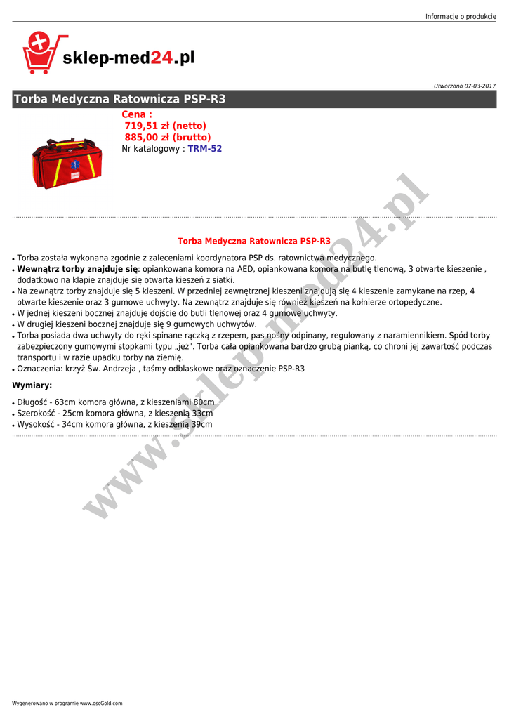 Informacje o produkcie Utworzono 07-03-2017 Torba Medyczna Ratownicza PSP-R3 Cena : 719,51 zł (netto) 885,00 zł (brutto) 24 .p l Nr katalogowy : TRM-52 Torba Medyczna Ratownicza PSP-R3 ● ● ● ● ● Torba została wykonana zgodnie z zaleceniami koordynatora PSP ds. ratownictwa medycznego. Wewnątrz torby znajduje się: opiankowana komora na AED, opiankowana komora na butlę tlenową, 3 otwarte kieszenie , dodatkowo na klapie znajduje się otwarta kieszeń z siatki. Na zewnątrz torby znajduje się 5 kieszeni. W przedniej zewnętrznej kieszeni znajdują się 4 kieszenie zamykane na rzep, 4 otwarte kieszenie oraz 3 gumowe uchwyty. Na zewnątrz znajduje się również kieszeń na kołnierze ortopedyczne. W jednej kieszeni bocznej znajduje dojście do butli tlenowej oraz 4 gumowe uchwyty. W drugiej kieszeni bocznej znajduje się 9 gumowych uchwytów. Torba posiada dwa uchwyty do ręki spinane rączką z rzepem, pas nośny odpinany, regulowany z naramiennikiem. Spód torby zabezpieczony gumowymi stopkami typu „jeż". Torba cała opiankowana bardzo grubą pianką, co chroni jej zawartość podczas transportu i w razie upadku torby na ziemię. Oznaczenia: krzyż Św. Andrzeja , taśmy odblaskowe oraz oznaczenie PSP-R3 ed ● ep -m ● ● w w w ● Długość - 63cm komora główna, z kieszeniami 80cm Szerokość - 25cm komora główna, z kieszenią 33cm Wysokość - 34cm komora główna, z kieszenią 39cm .s ● kl Wymiary: Wygenerowano w programie www.oscGold.com