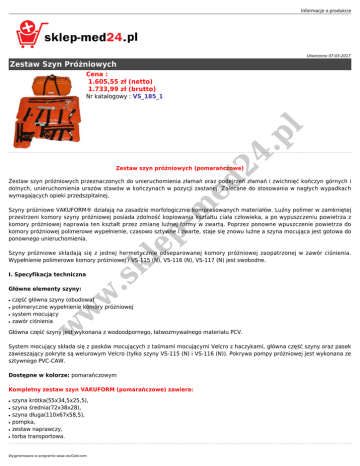 Informacje o produkcie Utworzono 07-03-2017 Zestaw Szyn Próżniowych Cena : 1.605,55 zł (netto) 1.733,99 zł (brutto) 24 .p l Nr katalogowy : VS_185_1 Zestaw szyn próżniowych (pomarańczowe) ep -m ed Zestaw szyn próżniowych przeznaczonych do unieruchomienia złamań oraz podejrzeń złamań i zwichnięć kończyn górnych i dolnych, unieruchomienia urazów stawów w kończynach w pozycji zastanej. Zalecane do stosowania w nagłych wypadkach wymagających opieki przedszpitalnej. Szyny próżniowe VAKUFORM® działają na zasadzie morfologicznie kompresowanych materiałów. Luźny polimer w zamkniętej przestrzeni komory szyny próżniowej posiada zdolność kopiowania kształtu ciała człowieka, a po wypuszczeniu powietrza z komory próżniowej naprawia ten kształt przez zmianę luźnej formy w zwartą. Poprzez ponowne wpuszczenie powietrza do komory próżniowej polimerowe wypełnienie, czasowo sztywne i zwarte, staje się znowu luźne a szyna mocująca jest gotowa do ponownego unieruchomienia. ● ● w ● część główna szyny (obudowa) polimeryczne wypełnienie komory próżniowej system mocujący zawór ciśnienia w ● w Główne elementy szyny: .s I. Specyfikacja techniczna kl Szyny próżniowe składają się z jednej hermetycznie odseparowanej komory próżniowej zaopatrzonej w zawór ciśnienia. Wypełnienie polimerowe komory próżniowej / VS-115 (N), VS-116 (N), VS-117 (N) jest swobodne. Główna część szyny jest wykonana z wodoodpornego, łatwozmywalnego materiału PCV. System mocujący składa się z pasków mocujących z taśmami mocującymi Velcro z haczykami, główna część szyny oraz pasek zawieszający pokryte są welurowym Velcro (tylko szyny VS-115 (N) i VS-116 (N)). Pokrywa pompy próżniowej jest wykonana ze sztywnego PVC-CAW. Dostępne w kolorze: pomarańczowym Kompletny zestaw szyn VAKUFORM (pomarańczowe) zawiera: ● ● ● ● ● ● szyna krótka(55x34,5x25,5), szyna średnia(72x38x28), szyna długa(110x67x58,5), pompka, zestaw naprawczy, torba transportowa. Wygenerowano w programie www.oscGold.com w .s w w l 24 .p ed ep -m kl