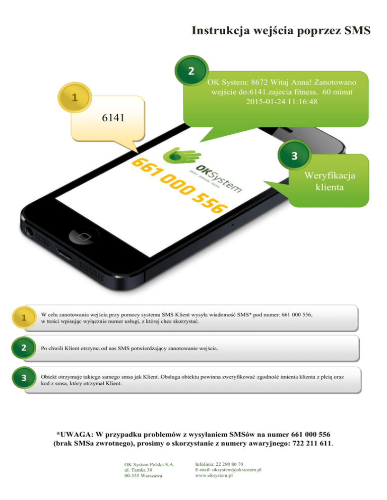 Instrukcja wejścia poprzez SMS 2 OK System: 8672 Witaj Anna! Zanotowano wejście do:6141.zajecia fitness. 60 minut 2015-01-24 11:16:48 1 6141 3 Weryfikacja klienta 1 W celu zanotowania wejścia przy pomocy systemu SMS Klient wysyła wiadomość SMS* pod numer: 661 000 556, w treści wpisując wyłącznie numer usługi, z której chce skorzystać. 2 Po chwili Klient otrzyma od nas SMS potwierdzający zanotowanie wejścia. 3 Obiekt otrzymuje takiego samego smsa jak Klient. Obsługa obiektu powinna zweryfikować zgodność imienia klienta z płcią oraz kod z smsa, który otrzymał Klient. *UWAGA: W przypadku problemów z wysyłaniem SMSów na numer 661 000 556 (brak SMSa zwrotnego), prosimy o skorzystanie z numery awaryjnego: 722 211 611. OK System Polska S.A. ul. Tamka 38 00-355 Warszawa Infolinia: 22 290 80 70 E-mail: [email protected] www.oksystem.pl W FORT FITNESS Użytkownicy karnetu OK System mogą korzystać z następujących usług: 661 000 556 Wyślij SMS z kodem usługi na numer Wybierz spośród usług tę, która jest dostępna w Twoim karnecie OK System. 21778 – Siłownia+Fitness+Indoor Cycling+Sauna 23385 – Siłownia pozaszczytowa Cennik dla karnetu SMART/BeFree: 21778 – Siłownia+Fitness+Indoor Cycling+Sauna pkt 195 23385 – Siłownia pozaszczytowa pkt 180 23387 – Karnet Siłownia + Cardio Open/1mc pkt 1900 23389 – Karnet Aerobik 8wejść/1mc pkt 1140 W razie jakichkolwiek pytań zapraszamy do kontaktu z infolinią: OK System Polska S.A. ul. Tamka 38 00-355 Warszawa 22 290 80 70 Infolinia: 22 290 80 70 E-mail: [email protected] www.oksystem.pl