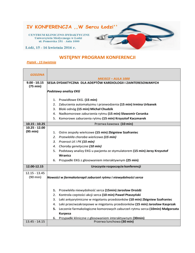 WSTĘPNY PROGRAM KONFERENCJI Piątek - 15 kwietnia GODZINA MIEJSCE – AULA 1000 9.00 - 10.15 SESJA DYDAKTYCZNA DLA ADEPTÓW KARDIOLOGII I ZAINTERESOWANYCH (75 min) Podstawy analizy EKG 1. 2. 3. 4. 5. 10.15 - 10.25 10.25 - 12.00 (95 min) Prawidłowe EKG. (15 min) Zaburzenia automatyzmu i przewodzenia (15 min) Irmina Urbanek Bloki odnóg (15 min) Michał Chudzik Nadkomorowe zaburzenia rytmu (15 min) Sławomir Ceranka Komorowe zaburzenia rytmu (15 min) Krzysztof Kaczmarek Przerwa kawowa (10 min) 1. 2. 3. 4. 5. Ostre zespoły wieńcowe (15 min) Zbigniew Szafraniec Przewlekła choroba wieńcowa (15 min) Przerost LK i PK (15 min) Choroby genetyczne (10 min) Podstawy analizy EKG u pacjenta ze stymulatorem (15 min) Jerzy Krzysztof Wranicz 6. Przypadki EKG z głosowaniem interaktywnym (25 min) 12.00-12.15 Uroczyste rozpoczęcie konferencji 12.15 - 13.45 (90 min) Nowości w farmakoterapii zaburzeń rytmu i niewydolności serca 1. 2. 3. 4. 5. 13.45 - 14.15 Przewlekła niewydolność serca (15min) Jarosław Drożdż Kontrola częstości akcji serca (10 min) Paweł Ptaszyński Leki antyarytmiczne w migotaniu przedsionków (10 min) Zbigniew Szafraniec Leki przeciwzakrzepowe w migotaniu przedsionków (15 min) Jarosław Kasprzak Leczenie farmakologiczne komorowych zaburzeń rytmu serca (10min) Małgorzata Kurpesa 6. Przypadki kliniczne z głosowaniem interaktywnym (30min) Przerwa lunchowa (30 min) 14.15 - 15.45 Sesja firmowa (90 min) Nowości w elektrokardiologii - prezentacje firm 15.45 – 15.55 Przerwa kawowa (10 min) 15.55 - 17.35 Wskazania do zabiegów elektroterapii (100 min) 1. Wskazania do implantacji stymulatora serca (10 min) Jerzy Krzysztof Wranicz 2. Wskazania do implantacji kardiowertera-defibrylatora (ICD) (10 min) Zbigniew Szafraniec 3. Wskazania do terapii resynchronizującej (CRT/CRT-D) (10 min) Artur Klimczak 4. Wskazania do ablacji (15min) Krzysztof Kaczmarek 5. Podskórny kardiowerter-defibrylator (S-ICD) (10 min) Paweł Ptaszyński 6. Kamizelka (Life Vest) jako alternatywa dla ICD – (10 min) Jerzy Krzysztof Wranicz 7. Wskazania do usunięcia urządzenia wszczepialnego (10 min) Michał Chudzik 8. Przypadki kliniczne z głosowaniem interaktywnym (25 min) 17.35-17.45 Przerwa kawowa (10 min) 17.45 - 18.45 Interpretacja ECG- quiz (głosowanie interaktywne) (60 min) Sobota - 18 kwietnia GODZINA 09.00-10.15 MIEJSCE - SALA BALOWA Zabiegi elektroterapii- jak wytłumaczyć pacjentowi na czym polega zabieg?- pokazy filmowe (75 min) 1. Zabieg kardiowersji (10 min) Irmina Urbanek 2. Zabieg implantacji kardiologicznego urządzenia wszczepialnego (rozrusznik/ICD/CRT) (20 min) Michał Chudzik 3. Na czym polega zabieg usunięcia rozrusznika/ICD/CRT? (10 min) Andrzej Oszczygieł 4. Zabieg ablacji (20 min) Paweł Ptaszyński, Krzysztof Kaczmarek 5. Inne nowoczesne zabiegi w elektroterapii: okluder uszka, ablacja tętnic nerkowych, stymulacja nerwu błędnego, CCM (15 min) 10.15-10.30 Przerwa kawowa (15 min) 11.15 - 12.05 Opieka nad chorym z zaburzeniami rytmu lub/i urządzeniem wszczepialnym (90min) (50 min) 12.00-12.45 1. Choroby zapalne jako przyczyna zaburzeń rytmu i przewodzenia (15 min) 2. Co wolno a czego nie wolno pacjentowi po implantacji (15min) Marcin Rosiak 3. Chory po implantacji stymulatora /CRT wymagający pilnej hospitalizacji (15 min) Michał Chudzik, Ewa Nowacka 4. Chory po implantacji ICD wymagający pilnej hospitalizacji (10 min) Krzysztof Kaczmarek 5. Zabiegi i operacje u chorych leczonych przeciwzakrzepowo (10 min) Monika Kosmalska- Różycka 6. Zabiegi i operacje u chorych z urządzeniem implantowanym (10 min) Michał Kałowski 7. Przypadki kliniczne- głosowanie interaktywne (15 min) Przerwa lunchowa (45 min) 12.45-13.45 Przypadki kliniczne: Chorzy typowi- wskazania do zabiegów (75min) Sesja z możliwością głosowania interaktywnego Przypadki przedstawiają asystenci Kliniki Elektrokardiologii 1. Chory do implantacji rozrusznika 2. Chory do implantacji ICD 3. Chory do implantacji CRT 4. Chory do usunięcia układu wszczepialnego 5. Chory z przedwczesnymi pobudzeniami komorowymi i/lub nadkomorowymi 6. Chory z migotaniem przedsionków leczony zachowawczo 7. Chory kierowany na ablację Zakończenie konferencji Rozdanie certyfikatów Punkty edukacyjne Okręgowej Izby Lekarskiej Punkty edukacyjne Polskiego Towarzystwa Kardiologicznego Zapraszamy na stronę www.wserculodzi.pl