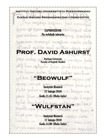 Instytut Historii Uniwersytetu Rzeszowskiego Zakład Historii Średniowiecznej i Nordystyki ZAPROSZENIE Na wykłady otwarte Prof. David Ashurst Durham University Faculty of English Studies “Beowulf” Instytut Historii 17 lutego 2010 Godz.11.45 (Mała Aula) “Wulfstan” Instytut Historii 17 lutego 2010 Godz.14.00 (Mała Aula)