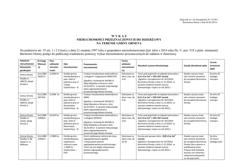 Załącznik nr 1 do Zarządzenia Nr 13/2015 Burmistrza Ornety z dnia 05.02.2015r. WYKAZ NIERUCHOMOŚCI PRZEZNACZONYCH DO DZIERŻAWY NA TERENIE GMINY ORNETA Na podstawie art. 35 ust. 1 i 2 Ustawy z dnia 21 sierpnia 1997 roku o gospodarce nieruchomościami (jed. tekst z 2014 roku Dz. U. poz. 518 z późn. zmianami) Burmistrz Ornety podaje do publicznej wiadomości poniższy wykaz nieruchomości przeznaczonych do oddania w dzierżawę. Położenie nieruchomości Oznaczenie geodezyjne Nr Księgi Wieczyst -ej Gmina Orneta OL1L/000 26021/1 Działka nr 189/32, obręb Orneta 1 Gmina Orneta OL1L/000 26576/6 Pow. całkowita nieruchomości 3,2290 ha 4,1958 ha Działka nr 189/34, obręb Orneta 3 Gmina Orneta Działka nr 133/6, obręb Orneta 2 OL1L/000 25968/4 Gmina Orneta Działka nr 38, obręb nr 11 Miłkowo OL1L/000 22940/1 0,2159 ha 1,7800 ha Opis nieruchomości Przeznaczenie nieruchomości Działka gruntu niezabudowana o pow. 0,64 m2 położona przy ul. 1 Maja. Użytek klasy – B. Funkcja mieszkaniowa wielorodzinna z usługami i magazynami (MW/U/P) Działka gruntu niezabudowana o pow. 0,64 m2 położona przy ul. Olsztyoskiej. Użytek klasy – B. Działka gruntu niezabudowana o pow. 9,62 m2 położona przy ul. Dworcowej. Użytek klasy – B. Działka gruntu niezabudowana, użytkowana rolniczo o pow. 1,7800 ha. Użytek klasy – PsIII. (Zgodnie z Uchwałą Nr XIII/94/11 Rady Miejskiej w Ornecie z dnia 26.10.2011r. w sprawie miejscowego planu zagospodarowania przestrzennego Miasta Orneta) Funkcja mieszkaniowa wielorodzinna (MW) (Zgodnie z Uchwałą Nr XIII/94/11 Rady Miejskiej w Ornecie z dnia 26.10.2011r. w sprawie miejscowego planu zagospodarowania przestrzennego Miasta Orneta) Funkcja mieszkaniowa wielorodzinna z usługami (MW/U) (Zgodnie z Uchwałą Nr XIII/94/11 Rady Miejskiej w Ornecie z dnia 26.10.2011r. w sprawie miejscowego planu zagospodarowania przestrzennego Miasta Orneta) Grunt użytkowany rolniczo do czasu zagospodarowania zgodne z miejscowym planem zagospodarowania przestrzennego. Teren nie jest objęty miejscowym planem zagospodarowania przestrzennego. Forma władania nieruchomością Dzierżawa na okres max. do 3 lat Termin wnoszenia opłat Wysokość czynszu dzierżawnego Zasady aktualizacji opłat Teren pod pojemniki na odpady komunalne – 0,11 zł za 1m2 + 23% VAT rocznie (Zgodnie z Zarządzeniem Nr 167/2014 Burmistrza Ornety z dnia 11.12.2014r. w sprawie ustalenia stawek czynszu dzierżawnego i najmu na rok 2015.) Stawka czynszu może ulec zmianie stosownie do zarządzeo Burmistrza Ornety. Do dnia 20 każdego miesiąca Dzierżawa na okres max. do 3 lat Teren pod pojemniki na odpady komunalne – 0,11 zł za 1m2 + 23% VAT rocznie (Zgodnie z Zarządzeniem Nr 167/2014 Burmistrza Ornety z dnia 11.12.2014r. w sprawie ustalenia stawek czynszu dzierżawnego i najmu na rok 2015.) Stawka czynszu może ulec zmianie stosownie do zarządzeo Burmistrza Ornety. Do dnia 20 każdego miesiąca Dzierżawa na okres max. do 3 lat Teren pod pojemniki na odpady komunalne – 0,11 zł za 1m2 + 23% VAT rocznie (Zgodnie z Zarządzeniem Nr 167/2014 Burmistrza Ornety z dnia 11.12.2014r. w sprawie ustalenia stawek czynszu dzierżawnego i najmu na rok 2015.) Stawka czynszu może ulec zmianie stosownie do zarządzeo Burmistrza Ornety. Do dnia 20 każdego miesiąca Dzierżawa na okres max. do 10 lat Grunty pod uprawy rolne - 0,02 zł za 1m2 rocznie (Zgodnie z Zarządzeniem Nr 167/2014 Burmistrza Ornety z dnia 11.12.2014r. w sprawie ustalenia stawek czynszu dzierżawnego i najmu na rok 2015.) Stawka czynszu może ulec zmianie stosownie do zarządzeo Burmistrza Ornety lub w oparciu o publikowany przez Prezesa GUS wskaźnik wzrostu cen towarów i usług konsumpcyjnych za rok poprzedni. Do dnia 31 marca każdego roku Gmina Orneta Działka nr 39, obręb nr 11 Miłkowo OL1L/000 23690/0 1,2500 ha Działka gruntu niezabudowana, użytkowana rolniczo o pow. 1,2500 ha. Użytek klasy – PsIII, ŁIV. Grunt użytkowany rolniczo do czasu zagospodarowania zgodne z miejscowym planem zagospodarowania przestrzennego. Teren nie jest objęty miejscowym planem zagospodarowania przestrzennego. Dzierżawa na okres max. do 10 lat Grunty pod uprawy rolne - 0,02 zł za 1m2 rocznie (Zgodnie z Zarządzeniem Nr 167/2014 Burmistrza Ornety z dnia 11.12.2014r. w sprawie ustalenia stawek czynszu dzierżawnego i najmu na rok 2015.) Gmina Orneta OL1L/000 25832/2 3,2828 ha Działka gruntu niezabudowana o pow. 330 m2 położona przy ul. Al. Woj. Polskiego. Użytek klasy – B. Funkcja mieszkaniowa jednorodzinna z wielorodzinną (MN/MW) Dzierżawa na okres max. do 3 lat Teren użytkowany jako ogród przydomowy/ogród działkowy – 0,17 zł za 1m2 + 23% VAT rocznie (Zgodnie z Zarządzeniem Nr 167/2014 Burmistrza Ornety z dnia 11.12.2014r. w sprawie ustalenia stawek czynszu dzierżawnego i najmu na rok 2015.) Działka nr 249/17, obręb Orneta 5 (Zgodnie z Uchwałą Nr XIII/94/11 Rady Miejskiej w Ornecie z dnia 26.10.2011r. w sprawie miejscowego planu zagospodarowania przestrzennego Miasta Orneta) Stawka czynszu może ulec zmianie stosownie do zarządzeo Burmistrza Ornety lub w oparciu o publikowany przez Prezesa GUS wskaźnik wzrostu cen towarów i usług konsumpcyjnych za rok poprzedni. Stawka czynszu może ulec zmianie stosownie do zarządzeo Burmistrza Ornety. Do dnia 31 marca każdego roku Do dnia 31 marca każdego roku Wykaz wywieszono na tablicy ogłoszeń w dniu 05.02.2015 r., na okres 21 dni, oraz umieszczono na stronie internetowej Urzędu Miejskiego w Ornecie. Osoby, którym przysługuje roszczenie o nabycie w/w nieruchomości z mocy ustawy o gospodarce nieruchomościami na podstawie art. 34 ust. 1 lub odrębnych przepisów winny złożyć wniosek w terminie 6 tygodni, licząc od dnia wywieszenia wykazu. z up. Burmistrza Andrzej Gierlof Z-ca Burmistrza
