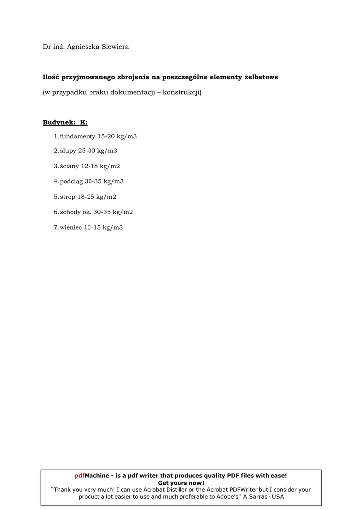 Dr in¿. Agnieszka Siewiera Iloœã przyjmowanego zbrojenia na poszczególne elementy ¿elbetowe (w przypadku braku dokumentacji – konstrukcji) Budynek: K: 1. fundamenty 15-20 kg/m3 2. sùupy 25-30 kg/m3 3. œciany 12-18 kg/m2 4. podci¹g 30-35 kg/m3 5. strop 18-25 kg/m2 6. schody ok. 30-35 kg/m2 7. wieniec 12-15 kg/m3 pdfMachine - is a pdf writer that produces quality PDF files with ease! Get yours now! “Thank you very much! I can use Acrobat Distiller or the Acrobat PDFWriter but I consider your product a lot easier to use and much preferable to Adobe's" A.Sarras - USA