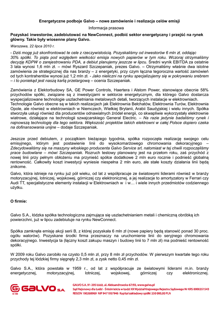 Energetyczne podboje Galvo – nowe zamówienie i realizacja celów emisji Informacja prasowa Pozyskać inwestorów, zadebiutować na NewConnect, podbić sektor energetyczny i przejść na rynek główny. Takie były wiosenne plany Galvo. Warszawa, 22 lipca 2010 r. - Dziś mogę już skonfrontować te cele z rzeczywistością. Pozyskaliśmy od inwestorów 6 mln zł, oddając 30% spółki. To piąta pod względem wielkości emisja nowych papierów w tym roku. Wczoraj otrzymaliśmy decyzję KDPW o zarejestrowaniu PDA, a debiut planujemy jeszcze w lipcu. Średni wynik EBITDA za ostatnie 3 lata wynosi 1,6 mln zł. – mówi Ryszard Szczepaniak, prezes Galvo. – Otrzymaliśmy właśnie dwa istotne zamówienia ze strategicznej dla nas branży – z energetyki, przy czym łączna tegoroczna wartość zamówień od tych kontrahentów wynosi już 1,2 mln zł. - Jako nieliczni na rynku specjalizujemy się w pokrywaniu srebrem – i to poniekąd jest naszą kartą przetargową – ocenia Szczepaniak. Zamówienia z Elektorbudowy SA, GE Power Controls, Haertera i Alstom Power, stanowiące obecnie 58% przychodów spółki, związane są z inwestycjami w sektorze energetycznym, dla którego Galvo dostarcza wyspecjalizowane technologie uszlachetniania metalowych detali, tworzących instalacje w elektrowniach. Technologie Galvo obecne są w takich realizacjach jak Elektrownia Bełchatów, Elektrownia Turów, Elektrownia Opole, ale również w elektrowniach w Niemczech, Wielkiej Brytanii, Arabii Saudyjskiej i wielu innych. Spółka stworzyła usługi również dla producentów odnawialnych źródeł energii, co skwapliwie wykorzystały elektrownie wiatrowe, działające na technologii szwajcarskiego General Electric. – Na razie jedynie badaliśmy rynek i najnowszą technologię dla tego sektora. Większość projektów takich elektrowni w całej Polsce dopiero czeka na dofinansowania unijne – dodaje Szczepaniak. Jeszcze przed debiutem, z początkiem bieżącego tygodnia, spółka rozpoczęła realizację swojego celu emisyjnego, którym jest postawienie linii do wysokomarżowego chromowania dekoracyjnego – Zdecydowaliśmy się na maszyny włoskiego producenta Galvo Service srl, natomiast w tej chwili rozpoczęliśmy prace budowlane – mówi Szczepaniak. Rozruch testowy planowany jest na przełom roku, zaś przychód z nowej linii przy pełnym obłożeniu ma przynieść spółce dodatkowe 2 mln euro rocznie i podnieść globalną rentowność. Całkowity koszt inwestycji wyniesie niespełna 2 mln euro, ale stałe koszty działania linii będą znikome. Galvo, która istnieje na rynku już pół wieku, od lat z współpracuje ze światowymi liderami również w branży motoryzacyjnej, lotniczej, wojskowej, górniczej czy elektronicznej, a jej realizacje to amortyzatory w Ferrari czy Audi TT, specjalistyczne elementy instalacji w Elektrowniach w i w… i wiele innych przedmiotów codziennego użytku. O firmie: Galvo S.A., łódzka spółka technologiczna zajmująca się uszlachetnianiem metali i chemiczną obróbką ich powierzchni, już w lipcu zadebiutuje na rynku NewConnect. Spółka zamknęła emisję akcji serii B, z której pozyskała 6 mln zł (nowe papiery będą stanowić ponad 30 proc. ogółu walorów). Pozyskane środki firma przeznaczy na uruchomienie linii do seryjnego chromowania dekoracyjnego. Inwestycja ta (łączny koszt zakupu maszyn i budowy linii to 7 mln zł) ma podnieść rentowność spółki. W 2009 roku Galvo zarobiło na czysto 0,5 mln zł, przy 8 mln zł przychodów. W pierwszym kwartale tego roku przychody tej łódzkiej firmy sięgnęły 2,3 mln zł, a zysk netto 0,45 mln zł. Galvo S.A., która powstała w 1959 r., od lat z współpracuje ze światowymi liderami m.in. branży energetycznej, motoryzacyjnej, lotniczej, wojskowej, górniczej czy elektronicznej. Spółka posiada własne laboratorium chemiczne, komorę solną, w której sprawdzana jest odporność materiałów na korozję, oraz aparaturę rentgenowską, umożliwiającą bardzo dokładne pomiary grubości powłok galwanicznych, również wielowarstwowych, wykonanych na detalach z różnych metali i ich stopów. Firma jest krajowym liderem w obszarze procesów srebrzenia, niklowania i cynkowania chemicznego, oraz producentem nowych technologii na zamówienie. Wszystkie etapy produkcji w Galvo, dzięki zautomatyzowanej oczyszczalni ścieków i urządzeniom ochrony powietrza są zgodne z restrykcyjnymi przepisami Unii Europejskiej. Więcej informacji: Biuro Prasowe Galvo SA: mobile: +48 609 110 082 [email protected] www.galvo.pl prowadzone przez CARDA Consultancy www.carda.pl