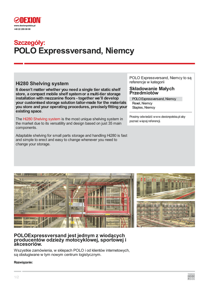 www.dexionpolska.pl +48 22 295 08 00 Szczegóły: POLO Expressversand, Niemcy Hi280 Shelving system POLO Expressversand, Niemcy to są referencje w kategorii Składowanie Małych It doesn’t matter whether you need a single tier static shelf Przedmiotów store, a compact mobile shelf system or a multi-tier storage installation with mezzanine floors - together we’ll develop POLO Expressversand, Niemcy your customised storage solution tailor-made for the materials Rexel, Niemcy you store and your operating procedures, precisely fitting your Staples, Niemcy existing space. The Hi280 Shelving system is the most unique shelving system in the market due to its versatility and design based on just 35 main components. Prosimy odwiedzić www.dexionpolska.pl aby poznać więcej referencji. Adaptable shelving for small parts storage and handling Hi280 is fast and simple to erect and easy to change whenever you need to change your storage. POLOExpressversand jest jednym z wiodących producentów odzieży motocyklowej, sportowej i akcesoriów. Wszystkie zamówienia, w sklepach POLO i od klientów internetowych, są obsługiwane w tym nowym centrum logistycznym. Rozwiązanie: 1/2 www.dexionpolska.pl +48 22 295 08 00 Sercem nowego centrum logistycznego POLO w Jüchen są 3 czteropiętrowe instalacje regałów Hi280 z 10.000 m² powierzchni podłóg i wysokości prawie 10 metrów. Jest to pierwszy cztero poziomowy system tego typu w Niemczech. Możliwości: Powierzchnia magazynowa: 25.000 m² Powierzchnia użytkowa: 45000 m² Szybkość pobierania: do 200.000 artykułów na zmianę Wymiary regału Hi280: Wysokość 9,5 m Półki do komisjonowania: 57000 Powierzchnia podłóg: 10000 m² 2/2