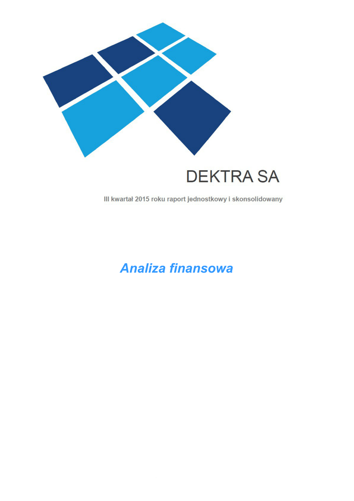 Analiza finansowa Analiza finansowa Raport jednostkowy i skonsolidowany za III kwartał 2015 r. Analiza finansowa 1. Dywidenda Wysokość wypłacanej dywidendy w latach 2012 – 2015 rok wypłaty 2012 2013 2014 2015 wartość dywidendy 1 656 000 1 214 400 938 400 1 214400 dywidenda na akcję w zł 1,50 1,10 0,85 1,10 stopa dywidendy w dniu przyznania prawa 10,0% 9,55% 9,88% 11,01% procent zysku rozdzielony w postaci dywidendy (DPR) 98,2% 111,0% 108,7% 116,1% Dywidenda Grupy Emitenta w latach 2012 – 2015 Źródło: Opracowanie własne Art Capital Sp. z o.o. na podstawie informacji finansowych Grupy Emitenta Raport jednostkowy i skonsolidowany za III kwartał 2015 r. Analiza finansowa 2. Wskaźniki rentowności Wskaźniki rentowności informują ile zysku przynosi jeden złoty uzyskany z przychodów ze sprzedaży (rentowność EBIT, EBITDA, netto) lub też obrazuje wielkość zysku wygospodarowanego przez przedsiębiorstwo z zainwestowanego kapitału własnego (ROE) lub zaangażowanych aktywów (ROA). W poniższej analizie wskaźnikowej wskaźniki rentowności zaprezentowano w dwóch wariantach. W pierwszym wariancie przy obliczaniu wskaźników uwzględniono dane finansowe z jednego konkretnego kwartału. Natomiast w drugim wariancie przyjęto do analizy wyniki finansowe narastająco za ostatnie 12 miesięcy. Wariant I Rentowność na sprzedaży Rentowność oper. (EBIT) Rentowność EBITDA Rentowność zysku netto III kw. 2013 IV kw. 2013 I kw. 2014 II kw. 2014 III kw. 2014 IV kw. 2014 I kw. 2015 II kw. 2015 III kw. 2013 5,2% 5,3% 8,5% 8,1% 10,7% 7,5% 6,8% 9,3% 9,9% 6,9% 5,1% 8,5% 8,2% 11,3% 7,3% 7,1% 9,8% 11,5% 8,8% 9,3% 9,2% 9,0% 11,9% 8,1% 7,8% 10,3% 12,0% 5,7% 3,6% 6,4% 5,8% 9,4% 4,9% 5,2% 7,0% 8,4% Rentowność aktyw. (ROA) 19,8% 9,8% 16,2% 19,9% 32,2% 12,3% 14,9% 28,3% 32,9% Rentowność kapitału (ROE) 28,8% 11,9% 23,8% 28,6% 46,6% 14,6% 20,4% 50,6% 57,1% Definicje wskaźników: Rentowność na sprzedaży – zysk (strata) na sprzedaży za kwartał / przychody ze sprzedaży za kwartał Rentowność operacyjna – zysk (strata) operacyjna za kwartał / przychody ze sprzedaży za kwartał Rentowność EBITDA – (zysk (strata) operacyjna za kwartał + amortyzacja za kwartał) / przychody ze sprzedaży za kwartał Rentowność zysku netto – zysk (strata) netto za kwartał / przychody ze sprzedaży za kwartał Rentowność aktywów – zysk (strata) netto za kwartał / wartość aktywów na koniec kwartału *4 Rentowność kapitału – zysk (strata) netto za kwartał / wartość kapitału na koniec kwartału *4 Raport jednostkowy i skonsolidowany za III kwartał 2015 r. Analiza finansowa Rentowność Grupy Emitenta w okresie III kw. 2013 – III kw. 2015 (dla danego kwartału) Źródło: Opracowanie własne Art Capital Sp. z o.o. na podstawie informacji finansowych Grupy Emitenta III kwartał 2015 r. był okresem o najwyższej sprzedaży w całej historii Grupy Emitenta (trzeci kwartał jest sezonowo najlepszym kwartałem w roku). Jednocześnie po raz trzeci, w krótkim okresie czasu, Grupa zanotowała rekordową sprzedaż miesięczną. Przychody ze sprzedaży za wrzesień były najwyższe w dotychczasowej działalności Grupy. W III kw. przychody netto ze sprzedaży wzrosły o 9,7% w stosunku do II kw. 2015 r. oraz aż o 32% wobec III kw. 2014 r. Wzrosty te są głównie efektem pozyskania nowych odbiorców z branży rolniczej, rozbudowywania oferty dla rolnictwa oraz wzrostu sprzedaży folii budowlanych, a także siatki podtynkowej (wzrost w stosunku do III kw. 2014 r. ale spadek w stosunku do II kw. 2015 r.). Równocześnie zwiększona sprzedaż towarów dla rolnictwa przełożyła się na wzrost marż na wszystkich poziomach sprzedaży wobec poprzednich okresów. W III kw. 2015 r. wszystkie obliczane rentowności zbliżyły się do historycznie najwyższych poziomów z III kw. 2014 r. lub nawet je przekroczyły (rentowność EBIT – 11,5%, rentowność EBITDA – 12%). Rentowność zysku netto za III kw. 2015 r. wyniosła 8,4% natomiast rentowość ze sprzedaży wyniosła 9,9%. Opis z poprzednich kwartałów III kw. 2013 to dalszy ciąg zwiększania przychodów w Grupie Emitenta (wzrost o 24% kwartał do kwartału) co było konsekwencją ożywienia w sektorze budowlanym (również na rynku materiałów izolacyjnych dla budownictwa) oraz w poprawy klimatu w rolnictwie. Równocześnie Grupa Emitenta pozyskała wielu nowych odbiorców zarówno z branży budowlanej jak i rolniczej. Z drugiej strony spadki rentowności na sprzedaży, rentowności EBIT oraz netto spowodowane presją na ceny transakcyjne. Nasilenie konkurencji wśród producentów i dystrybutorów wyrobów budowlanych, konieczność oferowania dodatkowych upustów za płatności gotówkowe oraz rabatów dla najlepszych odbiorców to główne przyczyny niskich cen transakcyjnych. Utrzymanie się rentowności EBITDA na podobnym poziomie jak w II kw. (pomimo spadku zysku operacyjnego) wynikało z istotnego wzrostu amortyzacji (wprowadzenia do ewidencji środków transportu o znacznej wartości). Należy nadmienić, iż III kwartał roku jest sezonowo najlepszy pod względem wartości przychodów w ciągu całego roku obrotowego. Raport jednostkowy i skonsolidowany za III kwartał 2015 r. Analiza finansowa Pomimo dostrzegania przez Emitenta dalszej poprawy koniunktury w budownictwie w IV kw. 2013 r., Grupa Kapitałowa zanotowała znaczny spadek przychodów w stosunku do III kw. 2013 r. z uwagi na sezonowość (spadek o 38% kwartał do kwartału). Spadek przychodów oraz wzrost amortyzacji był powodem spadku rentowności operacyjnej oraz rentowności netto (o ok. 2 p.p.). Pomimo spadku przychodów kw. do kw. wskaźnik rentowności na sprzedaży praktycznie się nie zmienił natomiast rentowność EBITDA nawet wzrosła o 0,5 p.p. Świadczy to o dobrej elastyczności kosztowej Grupy Kapitałowej i stosunkowo niskim poziomie kosztów stałych, co może być brane jako dobry prognostyk w momencie wzrostu przychodów. Pierw