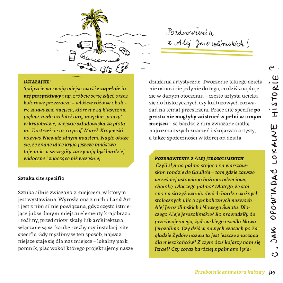 Działajcie! Spójrzcie na swoją miejscowość z zupełnie innej perspektywy i np. zróbcie serię zdjęć przez kolorowe przezrocza – włóżcie różowe okulary, zauważcie miejsca, które nie są klasycznie piękne, małą architekturę, miejskie „pauzy” w krajobrazie, wiejskie składowiska za płotami. Dostrzeżcie to, co prof. Marek Krajewski nazywa Niewidzialnym miastem. Nagle okaże się, że znane ulice kryją jeszcze mnóstwo tajemnic, a szczegóły zaczynają być bardziej widoczne i znaczące niż wcześniej. Sztuka site specific Sztuka silnie związana z miejscem, w którym jest wystawiana. Wyrosła ona z ruchu Land Art i jest z nim silnie powiązana, gdyż często istniejące już w danym miejscu elementy krajobrazu - rośliny, przedmioty, skały lub architektura, włączane są w tkankę rzeźby czy instalacji site specific. Gdy myślimy w ten sposób, najważniejsze staje się dla nas miejsce – lokalny park, pomnik, plac wokół którego projektujemy nasze działania artystyczne. Tworzenie takiego dzieła nie odnosi się jedynie do tego, co dziś znajduje się w danym otoczeniu – często artysta ucieka się do historycznych czy kulturowych rozważań na temat przestrzeni. Prace site specific po prostu nie mogłyby zaistnieć w pełni w innym miejscu – są bardzo z nim związane siatką najrozmaitszych znaczeń i skojarzań artysty, a także społeczności w której on działa. Pozdrowienia z Alej Jerozolimskich Czyli słynna palma stojąca na warszawskim rondzie de Gaulle’a – tam gdzie zawsze wcześniej ustawiano bożonarodzeniową choinkę. Dlaczego palma? Dlatego, że stoi ona na skrzyżowaniu dwóch bardzo ważnych stołecznych ulic o symbolicznych nazwach – Alej Jerozolimskich i Nowego Światu. Dlaczego Aleje Jerozolimskie? Bo prowadziły do przedwojennego, żydowskiego osiedla Nowa Jerozolima. Czy dziś w nowych czasach po Zagładzie Żydów nazwa ta jest jeszcze znacząca dla mieszkańców? Z czym dziś kojarzy nam się Izrael? Czy coraz bardziej z palmami i pia- Przybornik animatora kultury |19 skiem? Jak reagują mieszkańcy na tak szalone i obce zjawisko jak palma zamiast choinki? Te pytania zadała sobie Joanna Rajkowska – autorka projektu. Szerzej o projekcie i reakcjach jakie wzbudził przeczytajcie tutaj: http://www.palma.art.pl/ Ne spoon To artystka uliczna, która zajmuje się miejską ceramiką. Tworzy ona obrazy oraz urokliwe stemple – ozdoby, które umieszcza we wcześniej starannie wybranych przez siebie miejscach – w sękach drzew, pęknięciach chodnika, na industrialnych elementach niewidocznych zazwyczaj w przestrzeni miejskiej, jak skrzynki rozdzielcze. Jej prace wyglądają jak biżuteria dla drzew – przybierają często kształty zbliżone do koronowych bądź ażurowych serwet. Ne spoon często długo szuka odpowiedniego miejsca, dla swojej miejskiej biżuterii. Gdy już znajdzie odpowiedni wyłom lub sęk, przychodzi tam z gliną, robi odcisk, wymierza, by później wypalić broszę w piecu ceramicznym i przytwierdzić w wybranym |20 Przybornik animatora kultury miejscu. To prawdziwa sztuka site specific. O tym i innych projektach możecie poczytać na stronie: http://www.behance.net/nespoon. Opakowanie Czyli ambalaż bądź emballage – ruch w sztuce współczesnej polegający na opakowywaniu w folię lub sukno przedmiotów, pomników czy elementów krajobrazu w celu podkreślenia ich wartości i zwrócenia na nie uwagi poprzez paradoksalne ich zakrycie. Opakowanie może stanowić rodzaj gry z przedmiotem lub dziełem sztuki, które temu poddajemy. Ambalaż jest z samego założenia sztuką site specific, dlatego że zawsze odnosi się do konkretnego przedmiotu. Tadeusz Kantor - malarz oraz jeden z najbardziej liczących się twórców polskiego teatru, stosował ambalaż jako jeden z elementów swojej sztuki poświęconej przedmiotom zdegradowanym – „realności niższej rangi”.