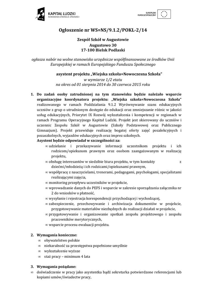 Ogłoszenie nr WS=NS/9.1.2/POKL-2/14 Zespół Szkół w Augustowie Augustowo 30 17-100 Bielsk Podlaski ogłasza nabór na wolne stanowisko urzędnicze współfinansowane ze środków Unii Europejskiej w ramach Europejskiego Funduszu Społecznego asystent projektu „Wiejska szkoła=Nowoczesna Szkoła” w wymiarze 1/2 etatu na okres od 01 sierpnia 2014 do 30 czerwca 2015 roku 1. Do zadań osoby zatrudnionej na tym stanowisku będzie należało wsparcie organizacyjne koordynatora projektu: „Wiejska szkoła=Nowoczesna Szkoła” realizowanego w ramach Poddziałania 9.1.2 Wyrównywanie szans edukacyjnych uczniów z grup o utrudnionym dostępie do edukacji oraz zmniejszanie różnic w jakości usług edukacyjnych, Priorytet IX Rozwój wykształcenia i kompetencji w regionach w ramach Programu Operacyjnego Kapitał Ludzki. Projekt jest skierowany do uczniów i uczennic Zespołu Szkół w Augustowie (Szkoły Podstawowej oraz Publicznego Gimnazjum). Projekt przewiduje realizację bogatej oferty zajęć pozalekcyjnych i pozaszkolnych, wyjazdów edukacyjnych oraz imprez szkolnych. Asystent będzie odpowiadał w szczególności za: • udzielanie i przekazywanie informacji uczestnikom projektu i ich rodzicom/opiekunom prawnym oraz osobom zaangażowanym w realizację projektu, • obsługę interesantów w siedzibie biura projektu, w tym kontakty z dziećmi/młodzieżą i ich rodzicami/opiekunami prawnym, • współpracę z nauczycielami, trenerami, pedagogami, psychologami, specjalistami realizującymi zajęcia, • monitoring przepływu uczestników w projekcie, • wprowadzanie danych do PEFS i wsparcie w zakresie sporządzania załącznika nr 2 do wniosków o płatność, • wysyłanie i rejestracja korespondencji przychodzącej i wychodzącej, • zabezpieczenie, przechowywanie i archiwizacja dokumentów w projekcie, przygotowywanie materiałów niezbędnych do realizacji działań w projekcie, • przygotowywanie i organizowanie spotkań zespołu projektowego i zespołu pracowników merytorycznych, • wsparcie procesu ewaluacji projektu. 2. Wymagania konieczne: • obywatelstwo polskie • niekaralność za przestępstwa popełnione umyślnie • wykształcenie wyższe • staż pracy – minimum 4 lata 3. Wymagania pożądane: • doświadczenie w pracy jako asystentka bądź sekretarka potwierdzone referencjami lub kopiami umów/świadectw pracy,