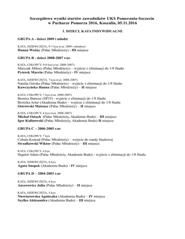 Szczegółowe wyniki startów zawodników UKS Pomerania-Szczecin w Pucharze Pomorza 2016, Koszalin, 05.11.2016 1. DZIECI, KATA INDYWIDUALNE GRUPA A - dzieci 2009 i młodsi KATA, DZIEWCZĘTA, 9-7 kyu (r.ur. 2009 i młodsze) Hanna Woźny (Pałac Młodzieży) - III miejsce GRUPA B - dzieci 2008-2007 r.ur. KATA, CHŁOPCY, 9-8 kyu (r.ur. 2008-2007) Marczak Miłosz (Pałac Młodzieży) – wyjście z eliminacji do 1/8 finału Pyterek Marcin (Pałac Młodzieży) - IV miejsce KATA, DZIEWCZĘTA, 7 kyu (r.ur. 2008-2007) Natalia Górska (Pałac Młodzieży) – wyjście z eliminacji do 1/8 finału Kawczyńska Hanna (Pałac Młodzieży) – II miejsce KATA, CHŁOPCY, 7 kyu (r.ur. 2008-2007) Bronisz Bartosz (SP35) - wyjście z eliminacji do 1/8 finału Brzózka Artur (Akademia Budo) - wyjście z eliminacji do 1/8 finału Ostrowski Mateusz (Pałac Młodzieży) – II miejsce KATA, CHŁOPCY, 6 kyu (r.ur. 2008-2007) Michał Ostach (Pałac Młodzieży, Akademia Budo) – III miejsce Igor Kalinowski (Pałac Młodzieży, Akademia Budo) II miejsce GRUPA C – 2006-2005 r.ur KATA, CHŁOPCY, 7 kyu Cebula Konrad (Pałac Młodzieży) – wejście do rundy finałowej Strzałkowski Wiktor (Pałac Młodzieży) – III miejsce KATA, CHŁOPCY, 6 kyu Stępień Adam (Pałac Młodzieży, Akademia Budo) - wyjście z eliminacji do 1/8 finału KATA, DZIEWCZĘTA, 6 kyu Agata Snopek (Akademia Budo) - IV miejsce GRUPA D – 2004-2003 r.ur KATA, DZIEWCZĘTA, 6 kyu Ancerowicz Julia (Pałac Młodzieży) – II miejsce KATA, DZIEWCZĘTA, 5 kyu Niewiarowska Agnieszka (Akademia Budo) – IV miejsce Szyłko Aleksandra (Akademia Budo) – III miejsce 2. DZIECI, KATA DRUŻYNOWE GRUPA A+B Drużyna: Ostrowski Mateusz, Kalinowski Igor, Ostach Michał (Pałac Młodzieży) – III miejsce GRUPA C+D Drużyna: Szyłko Aleksandra, Patan Aleksandra, Woźniczka Katarzyna (Akademia Budo) – IV miejsce JUNIORZY MŁODSI, JUNIORZY, MŁODZIEŻOWCY, SENIORZY, SENIORZY+ KATA JUNIORÓW , CHŁOPCY do 4 kyu Rakowski Marcin (Akademia Budo) – IV miejsce Kujath Cezary (Akademia Budo) – III miejsce KATA, DZIEWCZĘTA, do 4 kyu Selmaj Sandra (Akademia Budo) – III miejsce KATA SENIORÓW + MŁODZIEŻOWCÓW Arsenij Karpow – III miejsce FUKU-GO SENIORÓW + MŁODZIEŻOWCÓW Arsenij Karpow – IV miejsce KUMITE MŁODZIEŻOWCÓW Opolski Błażej – IV miejsce Arsenij Karpow – II miejsce KATA SENIORÓW + OD 3 KYU Stępień Robert – I miejsce Razem: 14 medali, 4 miejsce w klasyfikacji generalnej