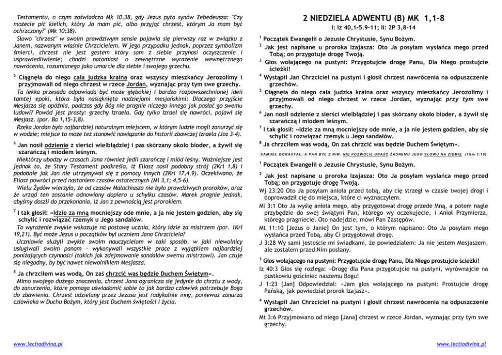Testamentu, o czym zaświadcza Mk 10,38, gdy Jezus pyta synów Zebedeusza: "Czy możecie pić kielich, który Ja mam pić, albo przyjąć chrzest, którym Ja mam być ochrzczony?" (Mk 10:38). Słowo "chrzest" w swoim prawdziwym sensie pojawia się pierwszy raz w związku z Janem, nazwanym właśnie Chrzcicielem. W jego przypadku jednak, poprzez symbolizm śmierci, chrzest nie jest gestem który sam z siebie przynosi oczyszczenie i usprawiedliwienie; chodzi natomiast o zewnętrzne wyrażenie wewnętrznego nawrócenia, rozumianego jako umarcie dla siebie i swojego grzechu. 2 NIEDZIELA ADWENTU (B) MK 1,1-8 I: Iz 40,1-5.9-11; II: 2P 3,8-14 1 2 3 Ciągnęła do niego cała judzka kraina oraz wszyscy mieszkańcy Jerozolimy i przyjmowali od niego chrzest w rzece Jordan, wyznając przy tym swe grzechy. Ta lekka przesada odpowiada być może głębokiej i bardzo rozpowszechnionej ideii tamtej epoki, która była nasiąknięta nadziejami mesjańskimi: Dlaczego przyjście Mesjasza się opóźnia, podczas gdy Bóg nie pragnie niczego innego jak posłać go swemu ludowi? Powód jest prosty: grzechy Izraela. Gdy tylko Izrael się nawróci, pojawi się Mesjasz. (por. Ba 1,15-3,8). Rzeka Jordan była najbardziej naturalnym miejscem, w którym ludzie mogli zanurzyć się w wodzie; miejsce to może też stanowić nawiązanie do historii zbawczej Izraela (Joz 3-4). 4 6 8 5 Jan nosił odzienie z sierści wielbłądziej i pas skórzany około bioder, a żywił się szarańczą i miodem leśnym. Niektórzy ubodzy w czasach Jana również jedli szarańczę i miód leśny. Ważniejsze jest jednak to, że Stary Testament podkreśla, iż Eliasz nosił podobny strój (2Krl 1,8) i podobnie jak Jan nie utrzymywał się z pomocy innych (2Krl 17,4.9). Oczekiwano, że Eliasz powróci przed nastaniem czasów ostatecznych (Ml 3,1; 4,5-6). Wielu Żydów wierzyło, że od czasów Malachiasza nie było prawdziwych proroków, oraz że urząd ten zostanie odnowiony dopiero u schyłku czasów. Marek pragnie jednak, abyśmy doszli do przekonania, iż Jan z pewnością jest prorokiem. 7 I tak głosił: «Idzie za mną mocniejszy ode mnie, a ja nie jestem godzien, aby się schylić i rozwiązać rzemyk u Jego sandałów. To wyrażenie zwykle wskazuje na postawę ucznia, który idzie za mistrzem (por. 1Krl 19,21). Być może Jezus u początków był uczniem Jana Chrzciciela? Uczniowie służyli zwykle swoim nauczycielom w taki sposób, w jaki niewolnicy usługiwali swoim panom - wykonywali wszystkie prace z wyjątkiem najbardziej poniżających czynności (takich jak zdejmowanie sandałów swemu mistrzowi). Jan czuje się niegodny, by być nawet niewolnikiem Mesjasza. 8 Ja chrzciłem was wodą, On zaś chrzcić was będzie Duchem Świętym». Mimo swojego dużego znaczenia, chrzest Jana ogranicza się jedynie do chrztu z wody, do zanurzenia, które pomaga uświadomić sobie to jak bardzo człowiek potrzebuje Boga do zbawienia. Chrzest udzielany przez Jezusa jest radykalnie inny, ponieważ zanurza człowieka w Duchu Bożym, który jest Duchem świętości i życia. www.lectiodivina.pl 5 6 7 Początek Ewangelii o Jezusie Chrystusie, Synu Bożym. Jak jest napisane u proroka Izajasza: Oto Ja posyłam wysłańca mego przed Tobą; on przygotuje drogę Twoją. Głos wołającego na pustyni: Przygotujcie drogę Panu, Dla Niego prostujcie ścieżki! Wystąpił Jan Chrzciciel na pustyni i głosił chrzest nawrócenia na odpuszczenie grzechów. Ciągnęła do niego cała judzka kraina oraz wszyscy mieszkańcy Jerozolimy i przyjmowali od niego chrzest w rzece Jordan, wyznając przy tym swe grzechy. Jan nosił odzienie z sierści wielbłądziej i pas skórzany około bioder, a żywił się szarańczą i miodem leśnym. I tak głosił: «Idzie za mną mocniejszy ode mnie, a ja nie jestem godzien, aby się schylić i rozwiązać rzemyk u Jego sandałów. Ja chrzciłem was wodą, On zaś chrzcić was będzie Duchem Świętym». SAMUEL DORASTAŁ, A PAN BYŁ Z NIM. NIE POZWOLIŁ UPAŚĆ ŻADNEMU JEGO SŁOWU NA ZIEMIĘ 1 (1Sm 3:19) Początek Ewangelii o Jezusie Chrystusie, Synu Bożym. 2 Jak jest napisane u proroka Izajasza: Oto Ja posyłam wysłańca mego przed Tobą; on przygotuje drogę Twoją. Wj 23:20 Oto Ja posyłam anioła przed tobą, aby cię strzegł w czasie twojej drogi i doprowadził cię do miejsca, które ci wyznaczyłem. Ml 3:1 Oto Ja wyślę anioła mego, aby przygotował drogę przede Mną, a potem nagle przybędzie do swej świątyni Pan, którego wy oczekujecie, i Anioł Przymierza, którego pragniecie. Oto nadejdzie, mówi Pan Zastępów. Mt 11:10 [Jezus o Janie] On jest tym, o którym napisano: Oto Ja posyłam mego wysłańca przed Tobą, aby Ci przygotował drogę. J 3:28 Wy sami jesteście mi świadkami, że powiedziałem: Ja nie jestem Mesjaszem, ale zostałem przed Nim posłany. 3 Głos wołającego na pustyni: Przygotujcie drogę Panu, Dla Niego prostujcie ścieżki! Iz 40:3 Głos się rozlega: «Drogę dla Pana przygotujcie na pustyni, wyrównajcie na pustkowiu gościniec naszemu Bogu! J 1:23 [Jan] Odpowiedział: «Jam głos wołającego na pustyni: Prostujcie drogę Pańską, jak powiedział prorok Izajasz». 4 Wystąpił Jan Chrzciciel na pustyni i głosił chrzest nawrócenia na odpuszczenie grzechów. Mt 3:6 Przyjmowano od niego [Jana] chrzest w rzece Jordan, wyznając przy tym swe grzechy. www.lectiodivina.pl Dz 13:24 Przed Jego przyjściem Jan głosił chrzest nawrócenia całemu ludowi izraelskiemu. Dz 2:38 «Nawróćcie się - powiedział do nich Piotr - i niech każdy z was ochrzci się w imię Jezusa Chrystusa na odpuszczenie grzechów waszych, a weźmiecie w darze Ducha Świętego. 5 Ciągnęła do niego cała judzka kraina oraz wszyscy mieszkańcy Jerozolimy i przyjmowali od niego chrzest w rzece Jordan, wyznając przy tym swe grzechy. 6 Jan nosił odzienie z sierści wielbłądziej i pas skórzany około bioder, a żywił się szarańczą i miodem leśnym. 2Krl 1:8 Odpowiedzieli mu: «Był to człowiek w pła