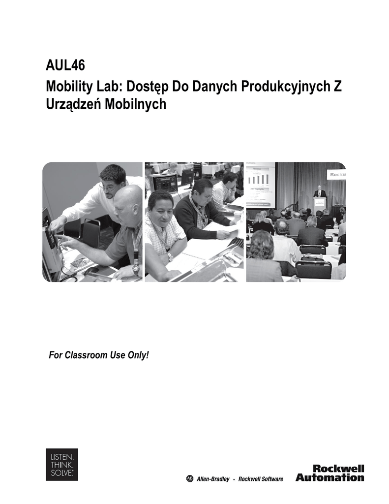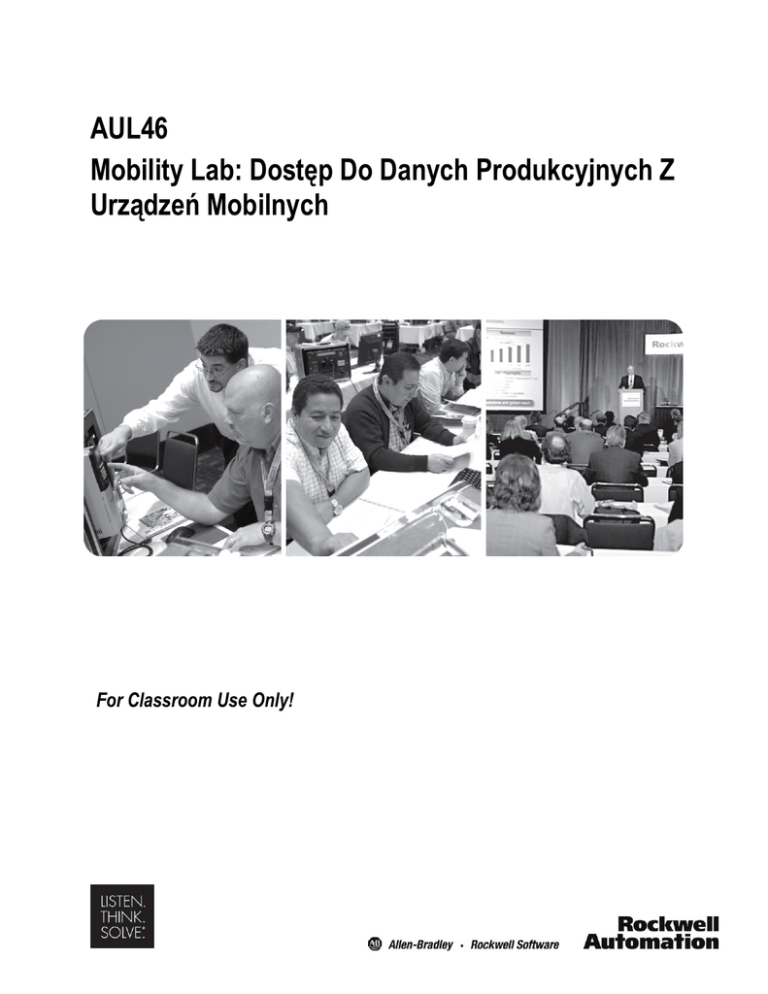 AUL46 Mobility Lab: Dostęp Do Danych Produkcyjnych Z Urządzeń Mobilnych For Classroom Use Only! Important User Information This documentation, whether, illustrative, printed, “online” or electronic (hereinafter “Documentation”) is intended for use only as a learning aid when using Rockwell Automation approved demonstration hardware, software and firmware. The Documentation should only be used as a learning tool by qualified professionals. The variety of uses for the hardware, software and firmware (hereinafter “Products”) described in this Documentation, mandates that those responsible for the application and use of those Products must satisfy themselves that all necessary steps have been taken to ensure that each application and actual use meets all performance and safety requirements, including any applicable laws, regulations, codes and standards in addition to any applicable technical documents. In no event will Rockwell Automation, Inc., or any of its affiliate or subsidiary companies (hereinafter “Rockwell Automation”) be responsible or liable for any indirect or consequential damages resulting from the use or application of the Products described in this Documentation. Rockwell Automation does not assume responsibility or liability for damages of any kind based on the alleged use of, or reliance on, this Documentation. No patent liability is assumed by Rockwell Automation with respect to use of information, circuits, equipment, or software described in the Documentation. Except as specifically agreed in writing as part of a maintenance or support contract, equipment users are responsible for: • properly using, calibrating, operating, monitoring and maintaining all Products consistent with all Rockwell Automation or third-party provided instructions, warnings, recommendations and documentation; • ensuring that only properly trained personnel use, operate and maintain the Products at all times; • staying informed of all Product updates and alerts and implementing all updates and fixes; and • all other factors affecting the Products that are outside of the direct control of Rockwell Automation. Reproduction of the contents of the Documentation, in whole or in part, without written permission of Rockwell Automation is prohibited. Throughout this manual we use the following notes to make you aware of safety considerations: Identifies information about practices or circumstances that can cause an explosion in a hazardous environment, which may lead to personal injury or death, property damage, or economic loss. Identifies information that is critical for successful application and understanding of the product. Identifies information about practices or circumstances that can lead to personal injury or death, property damage, or economic loss. Attentions help you: • identify a hazard • avoid a hazard • recognize the consequence Labels may be located on or inside the drive to alert people that dangerous voltage may be present. Labels may be located on or inside the drive to alert people that surfaces may be dangerous temperatures. AUL46 - Mobility Lab: Dostęp Do Danych Produkcyjnych Z Urządzeń Mobilnych Contents Zanim zaczniesz ........................................................................................................................................... 4 O Ćwiczeniu ...................................................................................................................................................................................... 4 Koncepcja Labolatorium ................................................................................................................................................................... 5 Zainstalowane Oprogramowanie ...................................................................................................................................................... 6 Symulowana infrastruktura............................................................................................................................ 7 Lab 1 – Wycieczka po Aplikacji Mobilnej (Mobile Site) ................................................................................. 8 Logowanie do VantagePoint Mobile Site .......................................................................................................................................... 8 Wgląd do Menu ................................................................................................................................................................................. 9 Czym są Mobile Views (Widoki) ...................................................................................................................................................... 14 Nawigowanie po Zunifikowanym Modelu Produkcji (UPM) ............................................................................................................. 19 Lab 2 – Tworzenie Trendów........................................................................................................................ 35 Tworzenie Ad-Hoc Trend dla Proof Oven linii Bread Line 1 ........................................................................................................... 35 Więcek niż tylko Trend dla Proof Oven dla Bread Line 1 ................................................................................................................ 45 Lab 3 – Tworzenie kontrolki ........................................................................................................................ 48 Tworzenie kontrolki dla Proof Oven linii Bread Line 1 .................................................................................................................... 49 Więcej niż Dashboard Proof Oven for Bread Line 1 ....................................................................................................................... 75 Lab 4 – Udostępnianie kontekstu FactoryTalk View SE dla