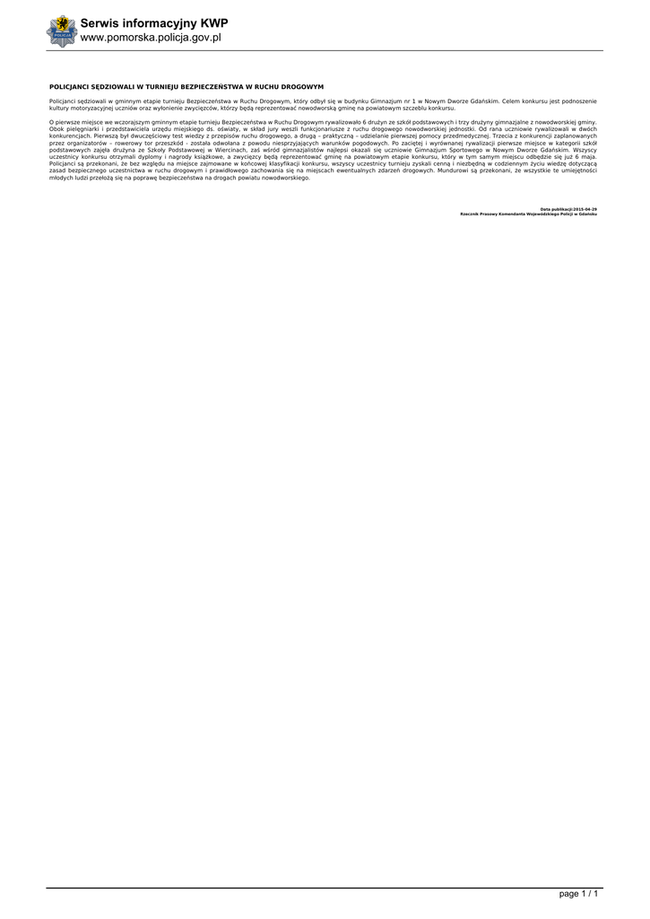 Serwis informacyjny KWP www.pomorska.policja.gov.pl POLICJANCI SĘDZIOWALI W TURNIEJU BEZPIECZEŃSTWA W RUCHU DROGOWYM Policjanci sędziowali w gminnym etapie turnieju Bezpieczeństwa w Ruchu Drogowym, który odbył się w budynku Gimnazjum nr 1 w Nowym Dworze Gdańskim. Celem konkursu jest podnoszenie kultury motoryzacyjnej uczniów oraz wyłonienie zwycięzców, którzy będą reprezentować nowodworską gminę na powiatowym szczeblu konkursu. O pierwsze miejsce we wczorajszym gminnym etapie turnieju Bezpieczeństwa w Ruchu Drogowym rywalizowało 6 drużyn ze szkół podstawowych i trzy drużyny gimnazjalne z nowodworskiej gminy. Obok pielęgniarki i przedstawiciela urzędu miejskiego ds. oświaty, w skład jury weszli funkcjonariusze z ruchu drogowego nowodworskiej jednostki. Od rana uczniowie rywalizowali w dwóch konkurencjach. Pierwszą był dwuczęściowy test wiedzy z przepisów ruchu drogowego, a drugą – praktyczną – udzielanie pierwszej pomocy przedmedycznej. Trzecia z konkurencji zaplanowanych przez organizatorów – rowerowy tor przeszkód - została odwołana z powodu niesprzyjających warunków pogodowych. Po zaciętej i wyrównanej rywalizacji pierwsze miejsce w kategorii szkół podstawowych zajęła drużyna ze Szkoły Podstawowej w Wiercinach, zaś wśród gimnazjalistów najlepsi okazali się uczniowie Gimnazjum Sportowego w Nowym Dworze Gdańskim. Wszyscy uczestnicy konkursu otrzymali dyplomy i nagrody książkowe, a zwycięzcy będą reprezentować gminę na powiatowym etapie konkursu, który w tym samym miejscu odbędzie się już 6 maja. Policjanci są przekonani, że bez względu na miejsce zajmowane w końcowej klasyfikacji konkursu, wszyscy uczestnicy turnieju zyskali cenną i niezbędną w codziennym życiu wiedzę dotyczącą zasad bezpiecznego uczestnictwa w ruchu drogowym i prawidłowego zachowania się na miejscach ewentualnych zdarzeń drogowych. Mundurowi są przekonani, że wszystkie te umiejętności młodych ludzi przełożą się na poprawę bezpieczeństwa na drogach powiatu nowodworskiego. Data publikacji:2015-04-29 Rzecznik Prasowy Komendanta Wojewódzkiego Policji w Gdańsku page 1 / 1 Powered by TCPDF (www.tcpdf.org)