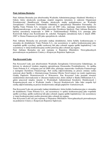 Pani Adriana Bosiacka Pani Adriana Bosiacka jest absolwentką Wydziału Administracyjnego Akademii Morskiej w Gdyni, który ukończyła uzyskując stopień magistra inŜyniera w zakresie Organizacji Przedsięwzięć Handlowych. Ponadto ukończyła studia podyplomowe na Wydziale Zarządzania i Ekonomii Politechniki Gdańskiej o specjalizacji MenadŜer Personalny. Ze Spółką Trans Polonia S.A. związana jest od 2007 roku, zajmując stanowisko Spedytora Międzynarodowego, a od roku 2008 stanowisko Dyrektora Spedycji. Pani Adriana Bosiacka karierę zawodową rozpoczęła w 2004 w Telekomunikacji Polskiej S.A. pracując jako Kierownik Sekcji oraz Koordynator ds. szkoleń. Następnie zatrudniona była w latach 20062007 w Domu Finansowym QS jako specjalista ds. szkoleń. Pani Adriana Bosiacka nie prowadzi Ŝadnej działalności, która byłaby konkurencyjna w stosunku do działalności Trans Polonia S.A., nie uczestniczy w spółce konkurencyjnej jako wspólnik spółki cywilnej, spółki osobowej lub jako członek organu spółki kapitałowej i nie uczestniczy w innej konkurencyjnej osobie prawnej jako członek jej organu. Pani Adriana Bosiacka nie jest wpisana w Rejestrze DłuŜników Niewypłacalnych prowadzonym na podstawie Ustawy o Krajowym Rejestrze Sądowym. Pan Krzysztof Luks Pan Krzysztof Luks jest absolwentem Wydziału Zarządzania Uniwersytetu Gdańskiego, na którym to ukończył tytułem magistra specjalizację Ekonomika Przedsiębiorstw. Ze spółką Trans Polonia S.A. związany jest od 2009 roku, piastując stanowisko Analityka Finansowego a następnie Dyrektora Finansowego. Był osobą odpowiedzialną za proces zmiany rynku notowań akcji Spółki z Alternatywnego Systemu Obrotu NewConnect na rynek regulowany Giełdy Papierów Wartościowych w Warszawie. Pan Krzysztof Luks posiada równieŜ siedmioletnie doświadczenie w obszarze bankowości, które zdobył w Banku Millennium S.A. gdzie pracował między innymi w Wydziałach Administracji Kredytów Detalicznych i Korporacyjnych oraz w Wydziale Analiz i Decyzji Kredytowych. Jako lider zespołu był osobą odpowiedzialną za proces kredytowania zakupu papierów wartościowych. Pan Krzysztof Luks nie prowadzi Ŝadnej działalności, która byłaby konkurencyjna w stosunku do działalności Trans Polonia S.A., nie uczestniczy w spółce konkurencyjnej jako wspólnik spółki cywilnej, spółki osobowej lub jako członek organu spółki kapitałowej i nie uczestniczy w innej konkurencyjnej osobie prawnej jako członek jej organu. Pan Krzysztof Luks nie jest wpisany w Rejestrze DłuŜników Niewypłacalnych prowadzonym na podstawie Ustawy o Krajowym Rejestrze Sądowym.