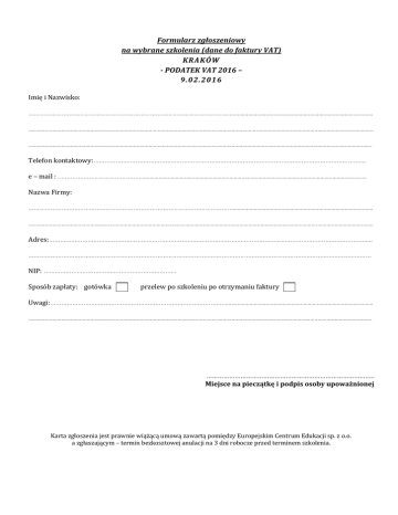 Formularz zgłoszeniowy na wybrane szkolenia (dane do faktury VAT) KRAKÓW - PODATEK VAT 2016 – 9.02.2016 Imię i Nazwisko: …………………………………………………………………………………………………............................................................................................. ..................................................................................................................................................................................................................................... .................................................................................................................................................................................................................................... Telefon kontaktowy:…………………………………………………………………………………………………………………………………. e – mail : .………………………………………..................................................................................................................................................... Nazwa Firmy: …………………………………………………………………………………………………............................................................................................. ..................................................................................................................................................................................................................................... Adres:………………………………………………………………………………………………………………………………………………………….. …………………………………………………………………………………………………………………………………………………………………… NIP: ……………………………………………………………… Sposób zapłaty: gotówka przelew po szkoleniu po otrzymaniu faktury Uwagi:……………………………………………………………………………………................................................................................................. .................................................................................................................................................................................................................................... …………………………………………………………………………….. Miejsce na pieczątkę i podpis osoby upoważnionej Karta zgłoszenia jest prawnie wiążącą umową zawartą pomiędzy Europejskim Centrum Edukacji sp. z o.o. a zgłaszającym – termin bezkosztowej anulacji na 3 dni robocze przed terminem szkolenia.