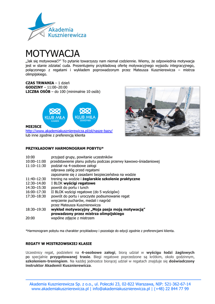 MOTYWACJA „Jak się motywować?” To pytanie towarzyszy nam niemal codziennie. Wiemy, że odpowiednia motywacja jest w stanie zdziałać cuda. Prezentujemy przykładową ofertę motywacyjnego wyjazdu integracyjnego, połączonego z regatami i wykładem poprowadzonym przez Mateusza Kusznierewicza ‒ mistrza olimpijskiego. CZAS TRWANIA – 1 dzień GODZINY – 11:00–20:00 LICZBA OSÓB – do 100 (minimalnie 10 osób) MIEJSCE http://www.akademiakusznierewicza.pl/pl/nasze-bazy/ lub inne zgodnie z preferencją klienta PRZYKŁADOWY HARMONOGRAM POBYTU* 10:00 10:00‒11:00 11:10‒11:30 11:40‒12:30 12:30–14.00 14:30‒15:30 16:00‒17:30 17:30‒18:30 18:30‒19:30 20:00 przyjazd grupy, powitanie uczestników przedstawienie planu pobytu podczas przerwy kawowo-śniadaniowej podział na 4-osobowe załogi odprawa załóg przed regatami zapoznanie się z zasadami bezpieczeństwa na wodzie trening na wodzie i żeglarskie szkolenie praktyczne I BLOK wyścigi regatowe powrót do portu i lunch II BLOK wyścigi regatowe (do 5 wyścigów) powrót do portu i uroczyste podsumowanie regat wręczenie pucharów, medali i nagród przez Mateusza Kusznierewicza wykład motywacyjny „Moja pasja moją motywacją” prowadzony przez mistrza olimpijskiego wspólne zdjęcie z mistrzem *Harmonogram pobytu ma charakter przykładowy i pozostaje do edycji zgodnie z preferencjami klienta. REGATY W MISTRZOWSKIEJ KLASIE Uczestnicy regat, podzieleni na 4-osobowe załogi, biorą udział w wyścigu łodzi żaglowych po specjalnie przygotowanej trasie. Biegi regatowe poprzedzone są krótkim, około godzinnym, szkoleniem-treningiem. Na każdej jednostce biorącej udział w regatach znajduje się doświadczony instruktor Akademii Kusznierewicza. Akademia Kusznierewicza Sp. z o.o., ul. Poleczki 23, 02-822 Warszawa, NIP: 521-362-67-14 www.akademiakusznierewicza.pl | [email protected] | (+48) 22 844 77 99 PROGRAM W TEJ WERSJI SCENARIUSZA ZAWIERA: szkolenie żeglarskie teoretyczne szkolenie żeglarskie praktyczne opiekę wykwalifikowanej kadry sterników Akademii Kusznierewicza czarter jednakowych jachtów żaglowych dla grupy łódź techniczną boje regatowe zabezpieczenie WOPR niezbędne zezwolenia niezbędny sprzęt asekuracyjny wyżywienie wykład motywacyjny prowadzony przez Mateusza Kusznierewicza ubezpieczenie uczestników DODATKOWO PROPONUJEMY: nagrody za udział w regatach upominki z kolekcji Akademii Kusznierewicza: kurtki, czapki, koszulki, akcesoria – możliwy branding odzieży logotypem firmy klienta relację fotograficzną z wydarzenia organizację noclegu po emocjonującym dniu, poprzedzonego wspólną zabawą przy muzyce Zapraszam! Mateusz Kusznierewicz KONTAKT Aneta Żebrowska +48 605 533 363 [email protected] Akademia Kusznierewicza Sp. z o.o., ul. Poleczki 23, 02-822 Warszawa, NIP: 521-362-67-14 www.akademiakusznierewicza.pl | [email protected] | (+48) 22 844 77 99