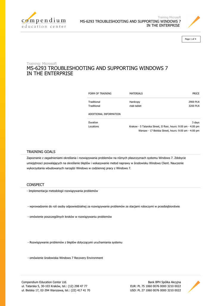 Training Microsoft MS-6293 TROUBLESHOOTING AND SUPPORTING WINDOWS 7 IN THE ENTERPRISE Page 1 of 4 Training: Microsoft MS-6293 TROUBLESHOOTING AND SUPPORTING WINDOWS 7 IN THE ENTERPRISE FORM OF TRAINING MATERIALS PRICE Traditional Hardcopy 2900 PLN Traditional ctab tablet 3200 PLN ADDITIONAL INFORMATION Duration Locations 3 days Krakow - 5 Tatarska Street, II floor, hours: 9:00 am - 4:00 pm Warsaw - 17 Bielska Street, hours: 9:00 am - 4:00 pm TRAINING GOALS Zapoznanie z zagadnieniami określania i rozwiązywania problemów na różnych płaszczyznach systemu Windows 7. Zdobycie umiejętnosci pozwalających na określanie błędów i wskazywanie metod naprawy w środowisku Windows Client. Nauczenie wykorzystania wbudowanych narzędzi Windows w codziennej pracy z Windows 7. CONSPECT - Implementacja metodologii rozwiązywania problemów - wprowadzenie do roli osoby odpowiedzialnej za rozwiązywanie problemów ze stacjami roboczymi w przedsiębiorstwie - omówienie poszczególnych kroków w rozwiązywaniu problemów - Rozwiązywanie problemów z błędów dotyczącymi uruchamiania systemu - omówienie środowiska Windows 7 Recovery Environment Compendium Education Center Ltd. ul. Tatarska 5, 30-103 Kraków, tel.: (12) 298 47 77 ul. Bielska 17, 02-394 Warszawa, tel.: (22) 417 41 70 Bank BPH Spółka Akcyjna EUR: PL 75 1060 0076 0000 3210 0022 USD: PL 27 1060 0076 0000 3210 0022 Training Microsoft MS-6293 TROUBLESHOOTING AND SUPPORTING WINDOWS 7 IN THE ENTERPRISE Page 2 of 4 - konfiguracja i rozwiązywanie problemów z ustawieniami startowymi - rozwiązywanie problemów z usługami systemu operacyjnego - Wykorzystanie zasad grupowych do centralizowania konfiguracji - omówienie Group Policy Application - naprawa błedów z niepoprawną konfiguracją klientów i błędami Group Policy Application - Rozwiązywanie problemów z błędami wynikającymi z niepoprawnej pracy urządzeń, sterowników urządzeń oraz aspektów wydajnościowych - omówienie metodyki rozwiązywanie problemów sprzętowych - naprawa błędów fizycznych - monitorowanie niezawodności i wydajności - konfiguracja ustawień wydajności w Windows 7 - rozwiązywanie problemów z błędami sterowników urządzeń - Rozwiązywanie problemów z błędami połączeń sieciowych - określanie ustawień sieciowych - rozwiązywanie problemów z błędami połączeń sieciowych Compendium Education Center Ltd. ul. Tatarska 5, 30-103 Kraków, tel.: (12) 298 47 77 ul. Bielska 17, 02-394 Warszawa, tel.: (22) 417 41 70 Bank BPH Spółka Akcyjna EUR: PL 75 1060 0076 0000 3210 0022 USD: PL 27 1060 0076 0000 3210 0022 Training Microsoft MS-6293 TROUBLESHOOTING AND SUPPORTING WINDOWS 7 IN THE ENTERPRISE Page 3 of 4 - Rozwiązywanie problemów błędami połączeń zdalnych - naprawa błędów połączeń VPN - wykorzystanie pulpitu zdalnego - naprawa błędów użytkownika z wykorzystaniem usługi zdalnej pomocy - naprawa błędów NAP - naprawa błedów DirectAccess - Rozwiązywanie problemów z błędami logowania i dostępu do zasobów - rozwiązywanie problemów z logowaniem użytkowników - rozwiązywanie problemów z profilami użytkowników - rozwiązywanie problemów z dostępem do plików - rozwiązywanie problemów z uprawnieniami systemu plików - rozwiązywanie problemów z dostępem do drukarek - Rozwiązywanie problemów z zabezpieczeniami - odzyskiwanie plików zaszyfrowanych EFS - odzyskiwanie dysków zabezpieczonych BitLocker - rozwiązywanie problemów z błędami w Internet Explorer Compendium Education Center Ltd. ul. Tatarska 5, 30-103 Kraków, tel.: (12) 298 47 77 ul. Bielska 17, 02-394 Warszawa, tel.: (22) 417 41 70 Bank BPH Spółka Akcyjna EUR: PL 75 1060 0076 0000 3210 0022 USD: PL 27 1060 0076 0000 3210 0022 Training Microsoft MS-6293 TROUBLESHOOTING AND SUPPORTING WINDOWS 7 IN THE ENTERPRISE Page 4 of 4 - Rozwiązywanie problemów z błędami systemu operacyjnego i aplikacji - rozwiązywanie problemów z instalacją oprogramowania - rozwiązywanie problemów z działaniem aplikacji - instalacja aktualizacji oprogramowania REQUIREMENTS - znajomość podstaw TCP/IP i koncepcji sieci - znajomość zagadnień dotyczących Active Directory - znajomość podstaw Windows Server 2008 oraz Windows Client - znajomość pakietu Microsoft Office 2007/2010 - ukończone szkolenie MS-6292 "Instaling and Configuring Windows 7 Client" lub równoważna wiedza i umiejętności - ukończone szkolenie MS-6420 "Fundamentals of Windows Server 2008" lub równoważna wiedza i umiejętności CERTIFICATE Uczestnicy otrzymują po zakończeniu szkolenia zaświadczenie o ukończeniu autoryzowanego kursu Microsoft. TRAINER Microsoft Certified Trainer Compendium Education Center Ltd. ul. Tatarska 5, 30-103 Kraków, tel.: (12) 298 47 77 ul. Bielska 17, 02-394 Warszawa, tel.: (22) 417 41 70 Bank BPH Spółka Akcyjna EUR: PL 75 1060 0076 0000 3210 0022 USD: PL 27 1060 0076 0000 3210 0022