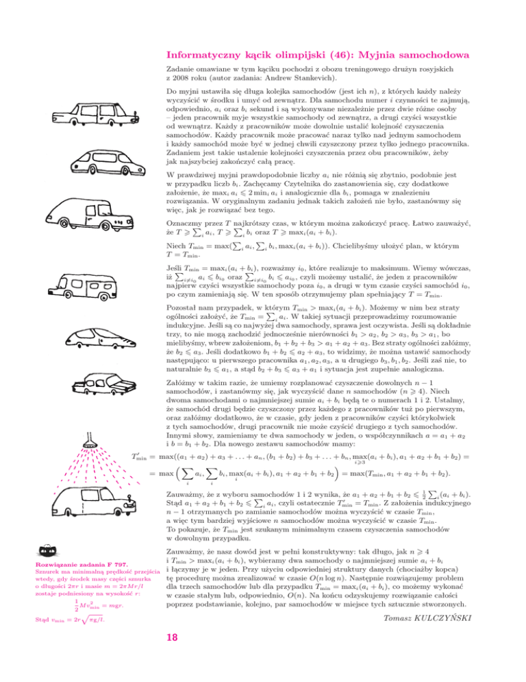 Informatyczny kącik olimpijski (46): Myjnia samochodowa Zadanie omawiane w tym kąciku pochodzi z obozu treningowego drużyn rosyjskich z 2008 roku (autor zadania: Andrew Stankevich). Do myjni ustawiła się długa kolejka samochodów (jest ich n), z których każdy należy wyczyścić w środku i umyć od zewnątrz. Dla samochodu numer i czynności te zajmują, odpowiednio, ai oraz bi sekund i są wykonywane niezależnie przez dwie różne osoby – jeden pracownik myje wszystkie samochody od zewnątrz, a drugi czyści wszystkie od wewnątrz. Każdy z pracowników może dowolnie ustalić kolejność czyszczenia samochodów. Każdy pracownik może pracować naraz tylko nad jednym samochodem i każdy samochód może być w jednej chwili czyszczony przez tylko jednego pracownika. Zadaniem jest takie ustalenie kolejności czyszczenia przez obu pracowników, żeby jak najszybciej zakończyć całą pracę. W prawdziwej myjni prawdopodobnie liczby ai nie różnią się zbytnio, podobnie jest w przypadku liczb bi . Zachęcamy Czytelnika do zastanowienia się, czy dodatkowe założenie, że maxi ai ¬ 2 mini ai i analogicznie dla bi , pomaga w znalezieniu rozwiązania. W oryginalnym zadaniu jednak takich założeń nie było, zastanówmy się więc, jak je rozwiązać bez tego. Oznaczmy najkrótszy czas, w którym można zakończyć pracę. Łatwo zauważyć, P przez T P że T i ai , T i bi oraz T maxi (ai + bi ). Niech Tmin = max( T = Tmin . P i ai , P i bi , maxi (ai + bi )). Chcielibyśmy ułożyć plan, w którym Jeśli bi ), rozważmy i0 , które realizuje to maksimum. Wiemy wówczas, P Tmin = maxi (ai +P oraz b ¬ ai0 , czyli możemy ustalić, że jeden z pracowników iż a ¬ b i i 0 i6=i0 i i6=i0 najpierw czyści wszystkie samochody poza i0 , a drugi w tym czasie czyści samochód i0 , po czym zamieniają się. W ten sposób otrzymujemy plan spełniający T = Tmin . Pozostał nam przypadek, w którym Tmin > maxi (ai + bi ). Możemy w nim bez straty P ogólności założyć, że Tmin = i ai . W takiej sytuacji przeprowadzimy rozumowanie indukcyjne. Jeśli są co najwyżej dwa samochody, sprawa jest oczywista. Jeśli są dokładnie trzy, to nie mogą zachodzić jednocześnie nierówności b1 > a2 , b2 > a3 , b3 > a1 , bo mielibyśmy, wbrew założeniom, b1 + b2 + b3 > a1 + a2 + a3 . Bez straty ogólności załóżmy, że b2 ¬ a3 . Jeśli dodatkowo b1 + b2 ¬ a2 + a3 , to widzimy, że można ustawić samochody następująco: u pierwszego pracownika a1 , a2 , a3 , a u drugiego b3 , b1 , b2 . Jeśli zaś nie, to naturalnie b3 ¬ a1 , a stąd b2 + b3 ¬ a3 + a1 i sytuacja jest zupełnie analogiczna. Załóżmy w takim razie, że umiemy rozplanować czyszczenie dowolnych n − 1 samochodów, i zastanówmy się, jak wyczyścić dane n samochodów (n 4). Niech dwoma samochodami o najmniejszej sumie ai + bi będą te o numerach 1 i 2. Ustalmy, że samochód drugi będzie czyszczony przez każdego z pracowników tuż po pierwszym, oraz załóżmy dodatkowo, że w czasie, gdy jeden z pracowników czyści którykolwiek z tych samochodów, drugi pracownik nie może czyścić drugiego z tych samochodów. Innymi słowy, zamieniamy te dwa samochody w jeden, o współczynnikach a = a1 + a2 i b = b1 + b2 . Dla nowego zestawu samochodów mamy: ′ Tmin = max((a1 + a2 ) + a3 + . . . + an , (b1 + b2 ) + b3 + . . . + bn , max(ai + bi ), a1 + a2 + b1 + b2 ) = i3 = max X i ai , X bi , max(ai + bi ), a1 + a2 + b1 + b2 i = max(Tmin , a1 + a2 + b1 + b2 ). i Zauważmy, że z wyboru samochodów 1 i 2 wynika, że a1 + a2 + b1 + b2 ¬ 12 i (ai + bi ). P ′ Stąd a1 + a2 + b1 + b2 ¬ i ai , czyli ostatecznie Tmin = Tmin . Z założenia indukcyjnego n − 1 otrzymanych po zamianie samochodów można wyczyścić w czasie Tmin , a więc tym bardziej wyjściowe n samochodów można wyczyścić w czasie Tmin . To pokazuje, że Tmin jest szukanym minimalnym czasem czyszczenia samochodów w dowolnym przypadku. P Rozwiązanie zadania F 797. Sznurek ma minimalną prędkość przejścia wtedy, gdy środek masy części sznurka o długości 2πr i masie m = 2πM r/l zostaje podniesiony na wysokość r: 1 2 M vmin = mgr. 2 Stąd vmin = 2r p Zauważmy, że nasz dowód jest w pełni konstruktywny: tak długo, jak n 4 i Tmin > maxi (ai + bi ), wybieramy dwa samochody o najmniejszej sumie ai + bi i łączymy je w jeden. Przy użyciu odpowiedniej struktury danych (chociażby kopca) tę procedurę można zrealizować w czasie O(n log n). Następnie rozwiązujemy problem dla trzech samochodów lub dla przypadku Tmin = maxi (ai + bi ), co możemy wykonać w czasie stałym lub, odpowiednio, O(n). Na końcu odzyskujemy rozwiązanie całości poprzez podstawianie, kolejno, par samochodów w miejsce tych sztucznie stworzonych. Tomasz KULCZYŃSKI πg/l. 18