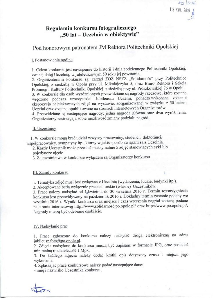 1 3 m 20:5:5 / J Regulamin konkursu fotograficznego ,,50 lat - Uczelnia w obiektywie" Pod honorowym patronatem JM Rektora Politechniki Opolskiej I. Postanowienia ogolne 1. Celem konkursu jest nawi^zanie do historii i dnia codziennego Politechniki Opolskiej, zwanej dalej Uczelni^, w jubileuszowym 50 roku jej powstania. 2. Organizatorami konkursu sa; zarz^d ZOZ NSZZ ,,Solidarnosc" przy Politechnice Opolskiej, z siedzib^ w Opolu przy ul. Mikolajczyka 5, oraz Biuro Rektora i Sekcja Promocji i Kultury Politechniki Opolskiej, z siedzib^ przy ul. Proszkowskiej 76 w Opolu. 3. W konkursie dla osob wyroznionych przewidziane s^ nagrody rzeczowe, ktore zostana^ wr^czone podczas uroczystosci Jubileuszu Uczelni, ponadto wykonana zostanie ekspozycja najciekawszych zdjec na wystawie, zorganizowanej w zwi^zku z 50-leciem Uczelni oraz zostana^ opublikowane na stronach internetowych Organizatorow. 4. Przewidziane s^ nast^puj^ce nagrody: jedna nagroda glowna oraz dwa wyroznienia. Organizatorzy zastrzegaj^ sobie mozliwosc zmiany podzialu nagrod. II. Uczestnicy 1. W konkursie moga^ brae udzial wszyscy pracownicy, studenci, doktoranci, wspolpracownicy, sympatycy itp., ktorzy w jakis sposob zwi^zani s^ z Uczelni^. 2. Kazdy Uczestnik moze przeslac maksymalnie 5 zdjec stanowi^cych cykl lub pojedyncze uj^cie. 3. Z uczestnictwa w konkursie wylaczeni s^ Organizatorzy konkursu. III. Zasady konkursu 1. Tematyka zdjec musi bye zwia_zana z Uczelni^ (wydarzenia, ludzie, budynki itp.). 2. Akceptowane b^d^ wyl^cznie prace autorskie (wlasne) Uczestnikow. 3. Prace nalezy nadsylac od Ixkwietnia do 30 wrzesnia 2016 r. Termin rozstrzygni^cia konkursu jest przewidywany na pazdziernik 2016 r. Dokladny termin zostanie podany we wrzesniu 2016 r. Wyniki konkursu oraz miejsce i czas wr^czenia nagrod zostana^ podane na stronie internetowej http://www.solidarnosc.po.opole.pl/ oraz http://www.po.opole.pl/. Nagrody musz^ bye odebrane osobiscie. IV. Nadsylanie prac 1. Prace zgloszone do konkursu nalezy nadsylac droga^ elektroniczn^ na adres [email protected]. 2. Zdj^cia nadsyiane do konkursu musza^ bye zapisane w formacie JPG, oraz posiadac minimaln^ rozdzielczosc 1 Mpx. 3. Do kazdego zdj^cia nalezy dodac krotki opis dotycz^cy czasu i miejsca jego wykonania. 4. Zglaszaj^c prace konkursowe nalezy podac nast^puj^ce dane: i nazwisko Uczestnika konkursu, - adres zamieszkania, - telefon kontaktowy, - jednostka organizacyjna (dotyczy pracownikow Uczelni), - deklaracje o zapoznaniu si$ z niniejszym Regulaminem konkursu: ,,Oswiadczam, ze zapoznalem/am sie z Regulaminem konkursu". - klauzul^: "Wyrazam zgode na przetwarzanie moich danych osobowych zawartych w zgloszeniu dla potrzeb konkursu, zgodnie z ustawy z dnia 29 sierpnia 1997 roku o ochronie danych osobowych. (Dz. U. z 2015 r. poz. 2135 z pozn. zm.)". Administratorem danych osobowych jest Sekcja Promocji i Kultury Politechniki Opolskiej. 5. Kazde zdj^cie w nazwie musi zawierac nazwisko autora (np. jan_kowalski.jpg). 1. Oceny nadeslanych prac dokona Jury powolane przez Organizatora. 2. W sklad Jury wejda^ przedstawiciele: ZOZ NSZZ ,,Solidarnosc" oraz Biura Rektora. 3. Jury zastrzega sobie prawo do dyskwalifikacji zdje/5, ktore nie spemiaja^ zasad Regulaminu. 4. Decyzje Jury s^ ostateczne i nie podlegaja weryfikacji. VI. Prawa autorskie Z chwil^ przeslania zdj^c do Organizatora Uczestnik: 1) oswiadcza, iz jest wyl^cznym tworca^ zdj^c w rozumieniu ustawy z dnia 4 lutego 1994 r. o prawie autorskim i prawach pokrewnych; 2) oswiadcza, iz zdj^cia nie naruszaj^ jakichkolwiek praw ani dobr osobistych osob trzecich, a takze ze uzyskal wymagane prawem zgody osob przedstawionych na zdjeciach na rozpowszechnianie ich wizerunku w zwi^zku z konkursem; 3) wyraza zgod? na publikowanie prac konkursowych na stronach internetowych: -http://www.solidarnosc.po.opole.pl/, - http://www.po.opole.pl/. k Regulamin wchodzi w zycie po opublikowaniu na stronach http://www.solidarnosc.po.opole.pl /i - http://www.po.opole.pl/.