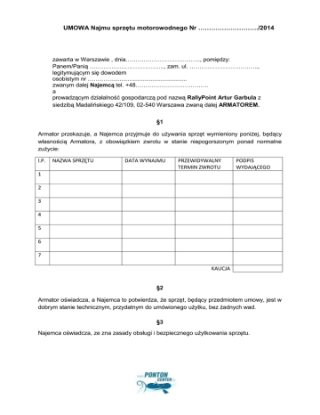 UMOWA Najmu sprzętu motorowodnego Nr ………………………./2014 zawarta w Warszawie , dnia……………………………….., pomiędzy: Panem/Panią ……………………………….., zam. ul. …………………………….., legitymującym się dowodem osobistym nr ………….............................................. zwanym dalej Najemcą tel. +48………………………………. a prowadzącym działalność gospodarczą pod nazwą RallyPoint Artur Garbula z siedzibą Madalińskiego 42/109, 02-540 Warszawa zwaną dalej ARMATOREM. §1 Armator przekazuje, a Najemca przyjmuje do używania sprzęt wymieniony poniżej, będący własnością Armatora, z obowiązkiem zwrotu w stanie niepogorszonym ponad normalne zużycie: l.P. NAZWA SPRZĘTU DATA WYNAJMU PRZEWIDYWALNY TERMIN ZWROTU PODPIS WYDAJĄCEGO 1 2 3 4 5 6 7 KAUCJA §2 Armator oświadcza, a Najemca to potwierdza, że sprzęt, będący przedmiotem umowy, jest w dobrym stanie technicznym, przydatnym do umówionego użytku, bez żadnych wad. §3 Najemca oświadcza, ze zna zasady obsługi i bezpiecznego użytkowania sprzętu. §4 Jako zabezpieczenie ewentualnych roszczeń Armatora wobec Najemcy, powstałych w związku z realizacją umowy, Najemca wpłaca kaucję w łącznej wysokości…………………. (słownie:………………………………………………………………………………………..brutto) §5 Najemca zobowiązuje się zapłacić Armatorowi czynsz w łącznej wysokości……………..zł (słownie……………………………………………………………………………………………) w dniu wypożyczenia pontonu. §6 Najemca zobowiązuje się zwrócić przedmiot najmu w przewidywalnym dniu zwrotu, nie później niż do godziny ustalonej w ofercie, w stanie nie pogorszonym. W przypadku zwrotu przedmiotu najmu po terminie wygaśnięcia umowy najmu, zostanie naliczony czynsz za każdy dzień zwłoki według obowiązującego cennika + 50% stawki. §7 Koszt ewentualnego transportu pokrywa Najemca. §8 Do obowiązków Najemcy należy: Użytkowanie sprzętu zgodnie z jego przeznaczeniem Zabezpieczenie sprzętu przed uszkodzeniem, kradzieżą oraz zniszczeniem Niezwłoczne informowanie Armatora o awariach ( w dniu ich wystąpienia) Nie dokonywanie żadnych samodzielnych napraw bez wiedzy i zgody Armatora Nie oddawanie przedmiotu najmu osobą trzecim do użytkowania ani podnajmu Utrzymywanie sprzętu w dobrym stanie Pokrywanie z własnych środków kosztów eksploatacji oraz napraw wynikłych z niewłaściwej eksploatacji 8) Nie doprowadzanie do wyczerpania akumulatorów do poziomu poniżej 10%, co zostanie sprawdzone przy zwrocie miernikiem elektrycznym. Rozładowanie poniżej tego poziomu, grozi trwałym uszkodzeniem akumulatora. 9) W chwili zwrotu, sprzęt powinien być czysty. W przypadku zwrotu sprzętu nie umytego, strony stwierdzą tę okoliczność w protokole zdawczo-odbiorczym, a nadto Najemca zapłaci Armatorowi opłatę za mycie sprzętu w wysokości 50 zł. 1) 2) 3) 4) 5) 6) 7) §9 Od chwili odbioru sprzętu od Armatora do momentu jego zwrotu, Najemca ponosi odpowiedzialność za jego zaginięcie lub uszkodzenie. Kradzież lub dewastację Najemca ma obowiązek niezwłocznie zgłosić organom ścigania. §10 W razie zaginięcia, utraty lub zniszczenia sprzętu, Najemca ma obowiązek pokryć straty Armatorowi w wysokości równowartości rynkowej sprzętu. §11 Najemca dokonuje zapłaty należności za wynajem w dniu odbioru sprzętu, w kasie Armatora. §12 Kaucja za sprzęt oddawana jest w dniu zwrotu sprzętu. §13 Wszelkie zmiany do niniejszej umowy wymagają formy pisemnej, pod rygorem nieważności. §14 W sprawach nieuregulowanych w postanowieniach niniejszej umowy mają zastosowanie przepisy Kodeksu Cywilnego. §8 Ewentualne spory wynikające z wykonania niniejszej umowy będą rozstrzygane przez Sąd Rejonowy właściwy dla siedziby Armatora. §8 Umowa została sporządzona w trzech jednobrzmiących egzemplarzach w tym dwa egzemplarze dla Armatora. Armator NAJEMCA